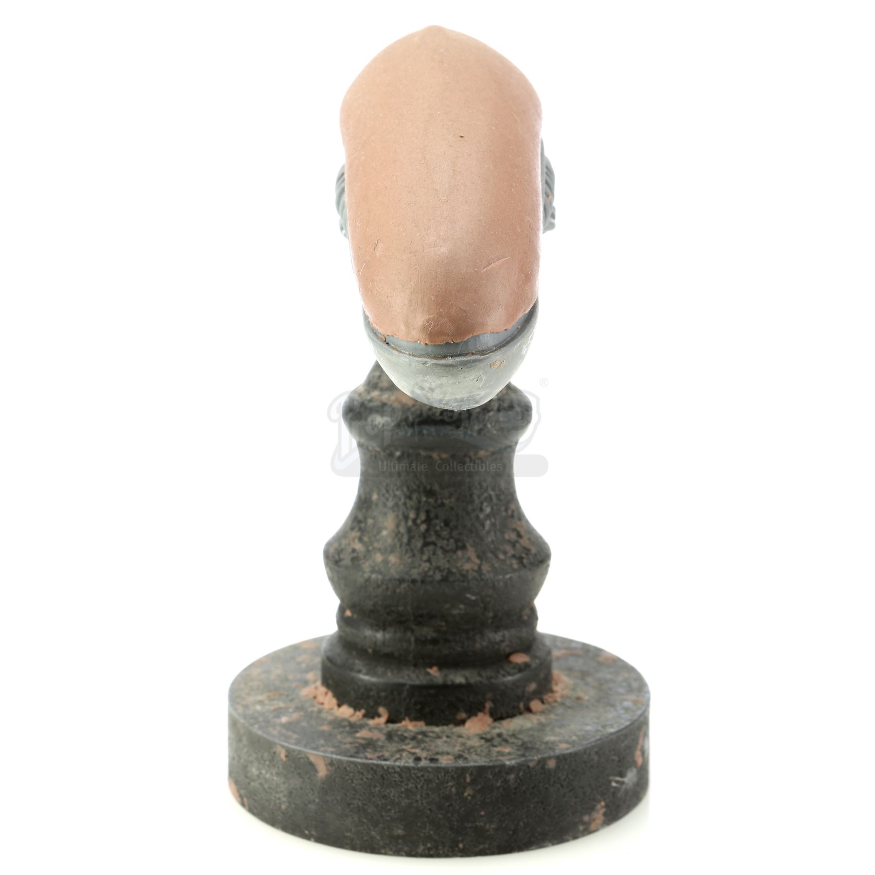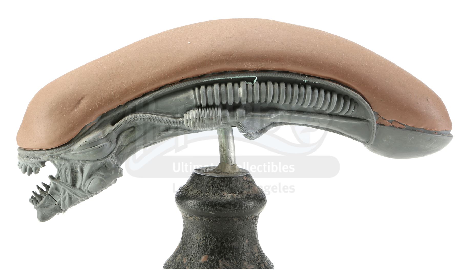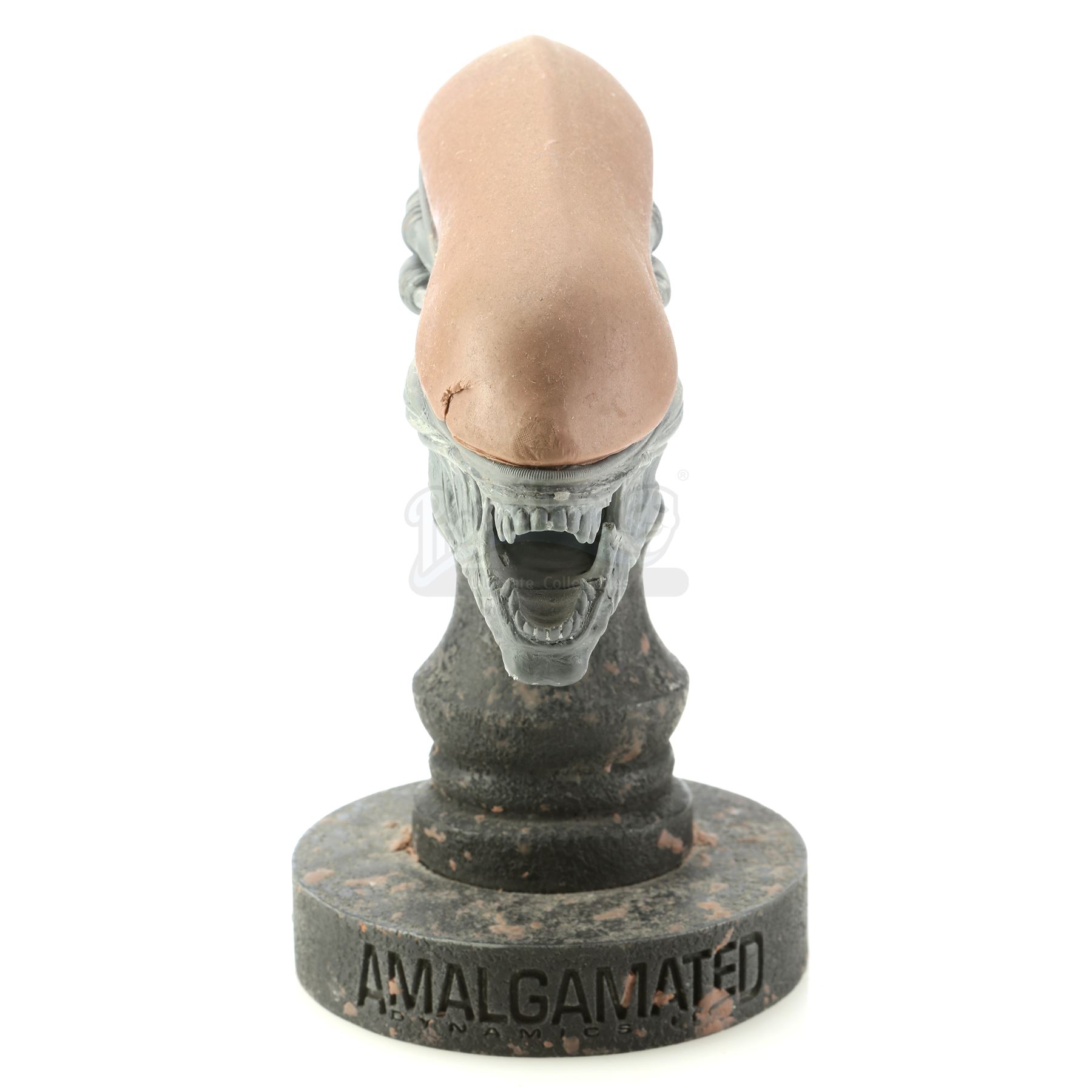 This hand-sculpted, unpainted gray resin xenomorph head maquette was designed and fabricated by Academy Award-winning special effects group Amalgamated Dynamics, Inc. (ADI), finished with a large brown clay fixture on top, and mounted with a metal pipe to a resin display base. The head is in good overall condition with visible signs of wear throughout, including cracked and loose clay bits and a bend in the pipe. Dimensions: 10 1/4" x 9" x 5 1/2" (26 cm x 22.75 cm x 14 cm)