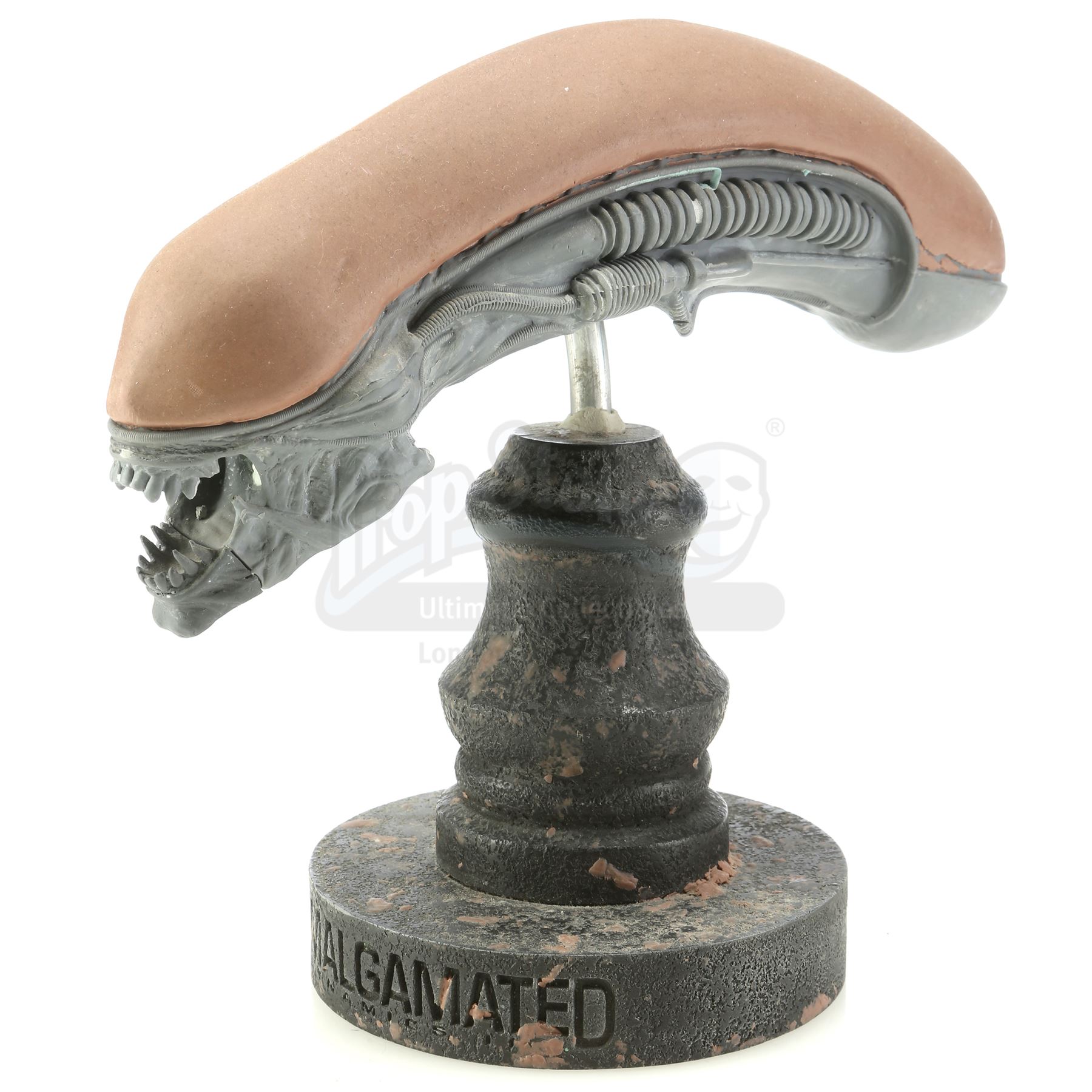 A xenomorph head maquette from the production of Paul W.S. Anderson's sci-fi action film AVP: Alien vs Predator. Yautja Predators continued their thousand-year hunt of the xenomorphs in a pyramid buried underneath Antarctica.