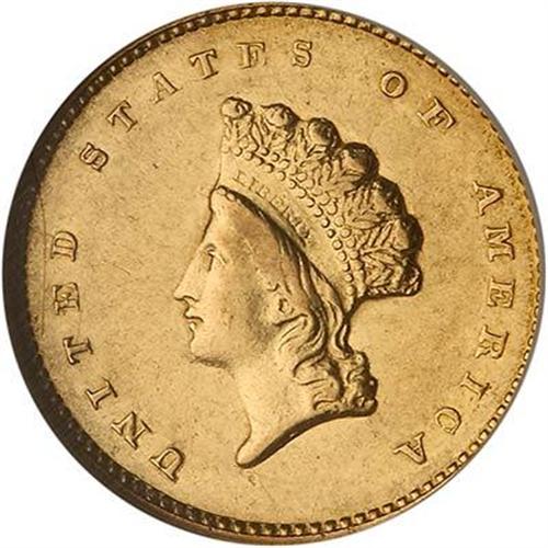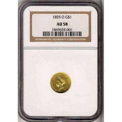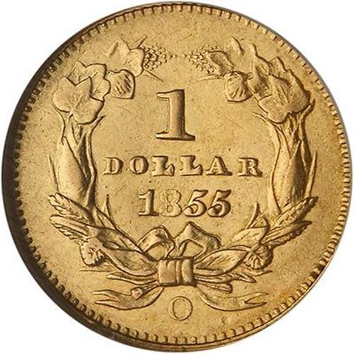 1855-O $1 Gold Indian. Type 2 Gold Dollars were struck at the New Orleans Mint in 1855 only, which makes the issue essential to a gold type set from this southern branch mint. The mintage of 55,000 pieces also consigned it to the class of better dates within the difficult Type 2 design, far scarcer than the 1854 and 1855 Philadelphia Mint issues. This lovely representative is well struck save for the 8 in the date, which is opposite the highpoint of the portrait. The radiant yellow-gold surfaces display extensive frost well into the fields, and no deep blemishes are present. Portions of the upper wreath are attenuated, as made from a lapped die. (#7535)