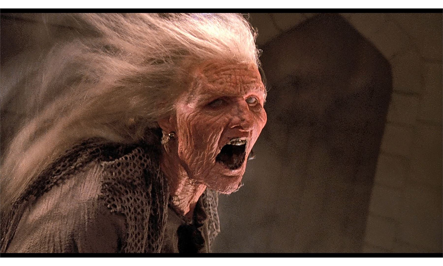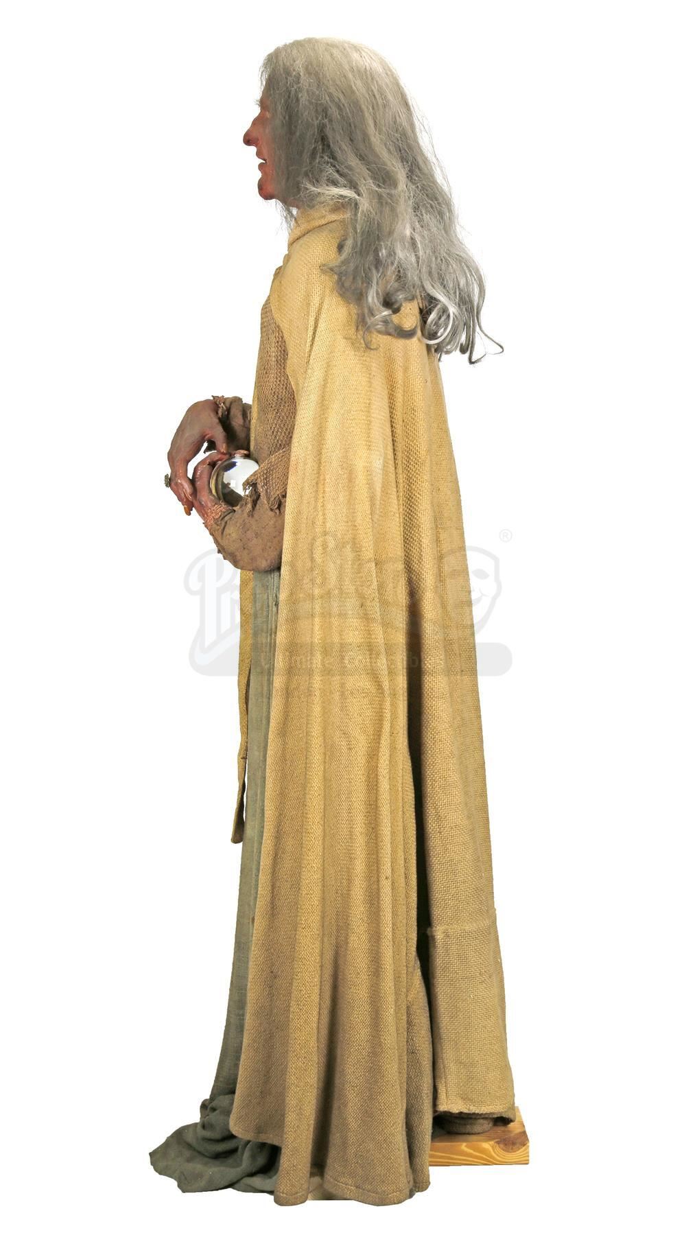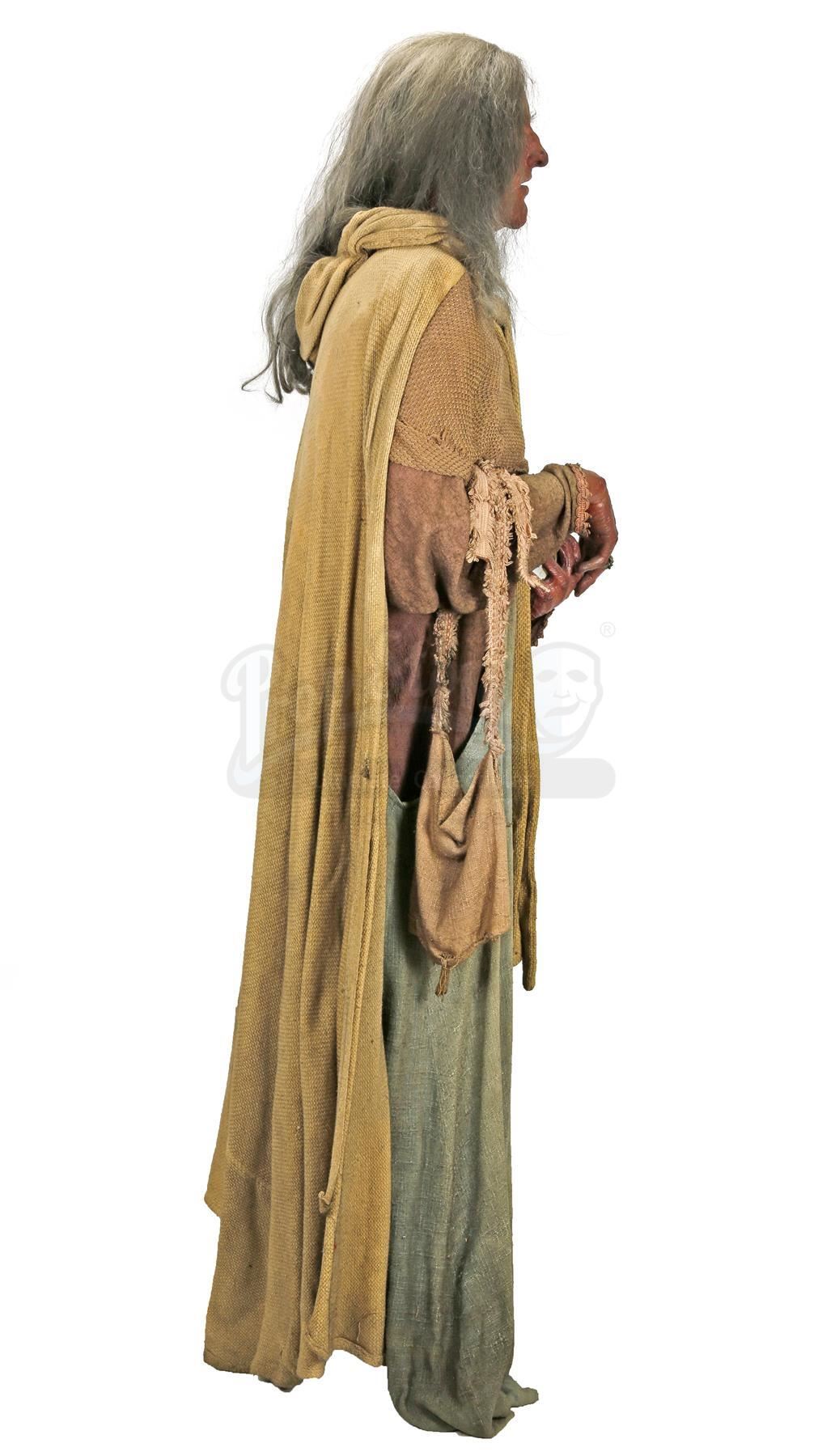This lot will be auctioned on Wednesday, June 30th. The auction will begin at 9:00am PDT and lots are sold sequentially via live auctioneer; tune in to the live streaming broadcast on auction day to follow the pace. Note other lots in the auction may close on June 29th or July 1st. A life-size Possessed Witch figure from Sam Raimi's horror action comedy Army of Darkness. Ash Williams (Bruce Campbell) took a Possessed Witch (Patricia Tallman) down with his Boomstick. This foam witch figure is hand-painted red with hand-punched black and gray hair, a gold-color metal ring and matching earrings, and a tan and olive green burlap caped robe. It features a posable wire frame interior and a metal pole bottom mounted to a wooden display stand. The figure is intentionally distressed by production to appear ragged and aged, but remains in good overall condition. Dimensions: 67.5" x 23" x 20" (171.5 cm x 58.5 cmx 51 cm) Stored off-site; see notice in the Buyer's Guide. Estimate: $1,200 - 1,800