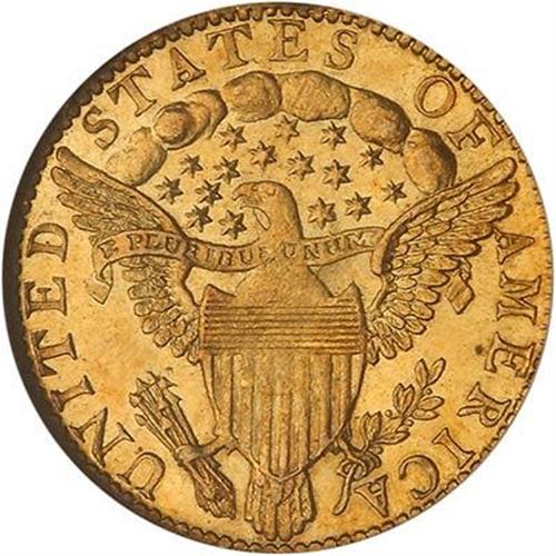 The present coin is warm golden orange, has some duskier toning shades on the high points (defining the grade), and on the obverse has the distinctive die crack from the upper right to the lower right. The reverse is similarly toned and slightly Prooflike, and if it could be graded separately, might be called MS-64 Premium Quality. The striking details are quite good on both sides. Among all early quarter eagles this is one of the most difficult to find in higher grades. As such, the opportunity should be carefully considered.