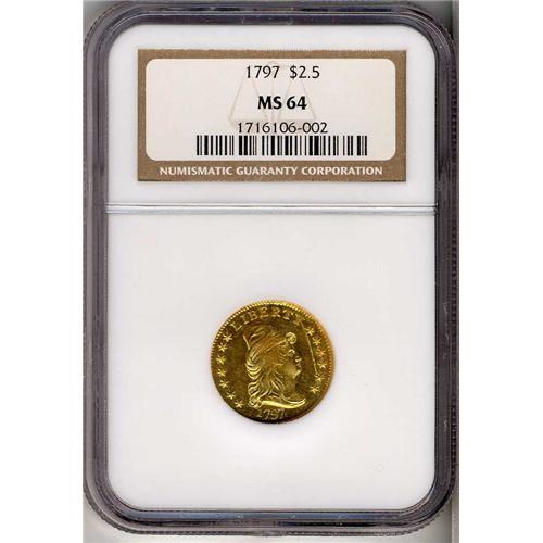 1797 $2.50 Capped Bust.. A lovely specimen, MS-64, and the highest one certified by either of the two top-tier graders, this remarkable coin being one of relatively few Mint States in existence. The 1797 quarter eagle is elusive in any and all grades, with a reported mintage of just 427 pieces. When seen, the typical assignment is VF or EF, sometimes AU, but not often Mint State.