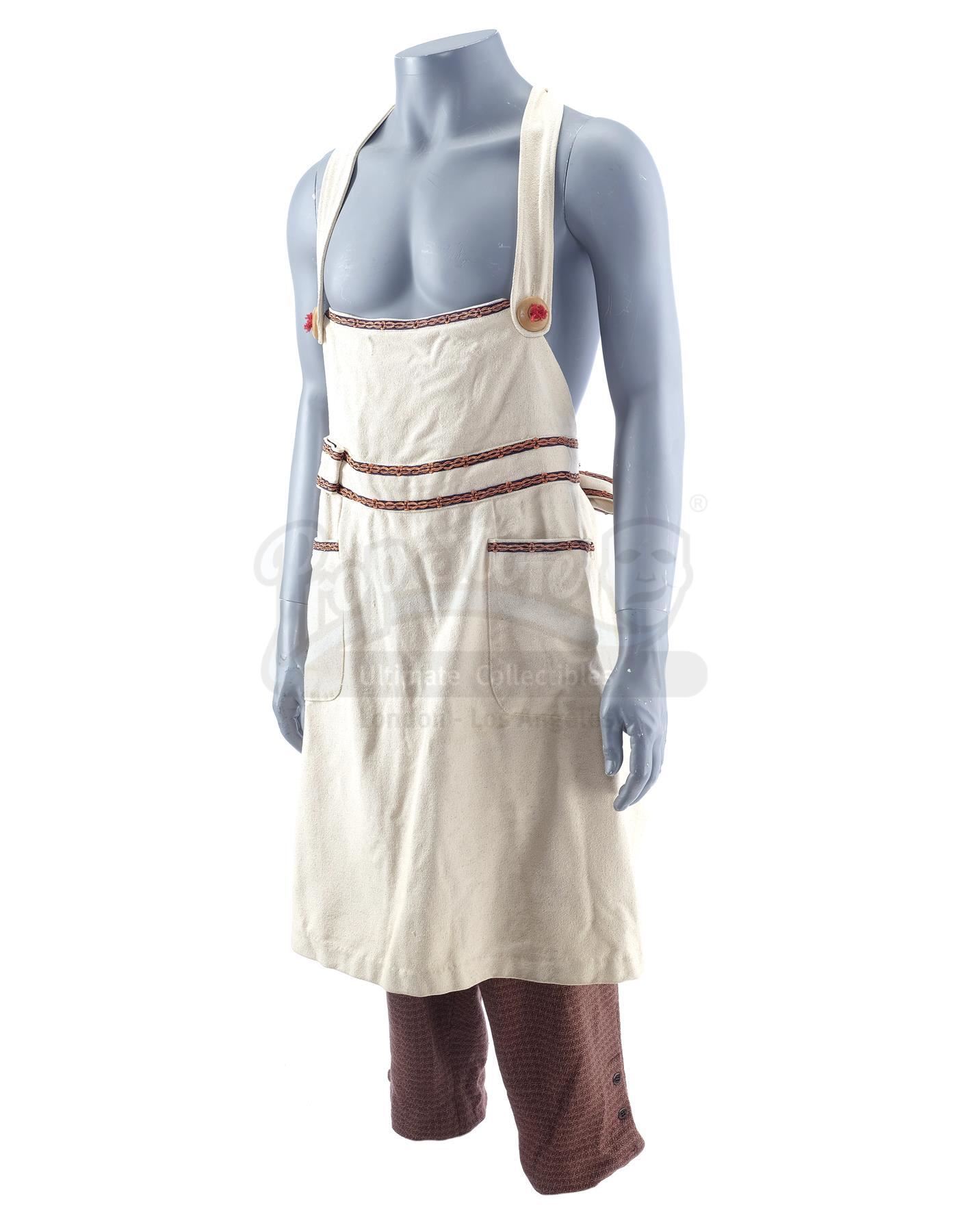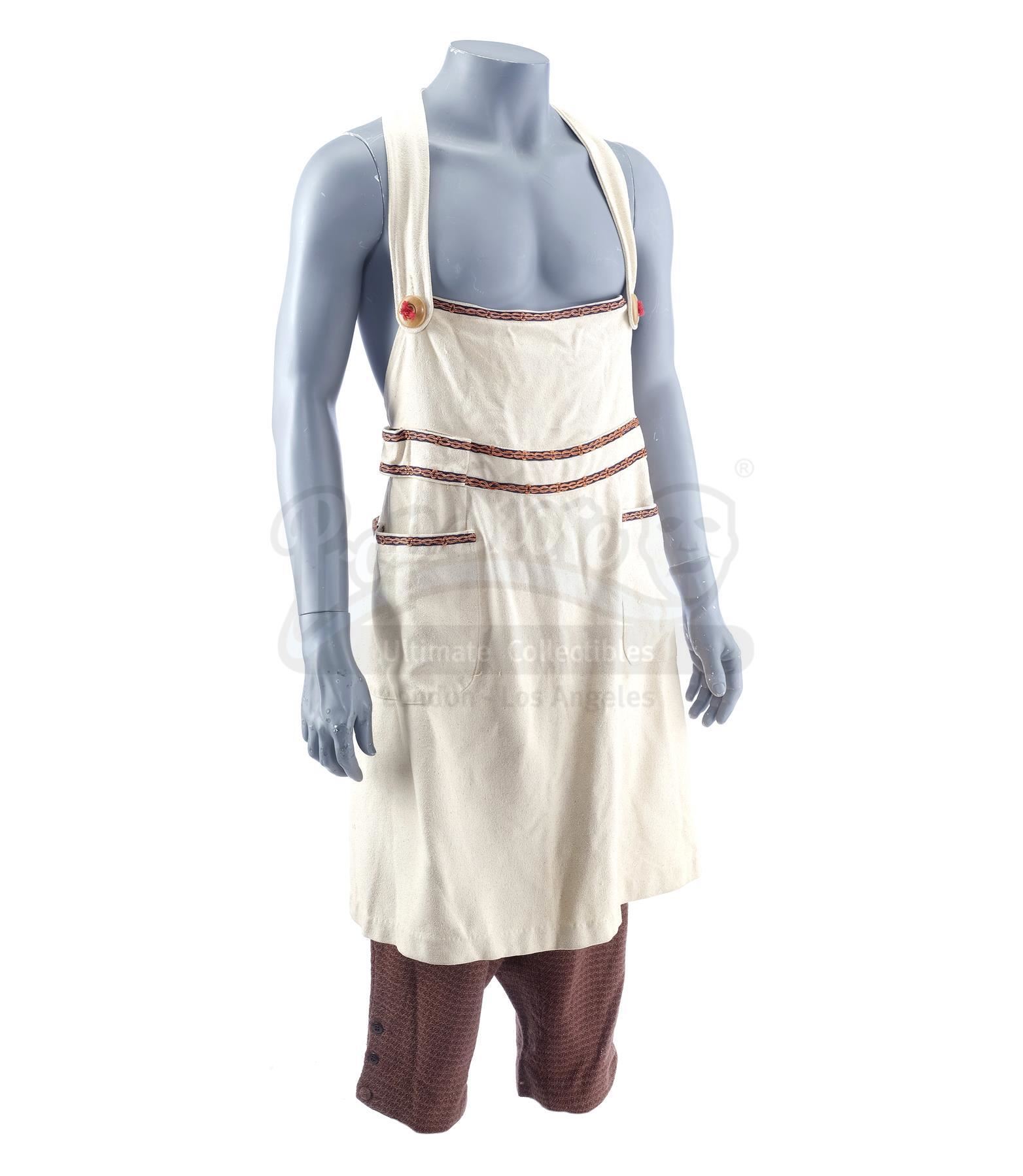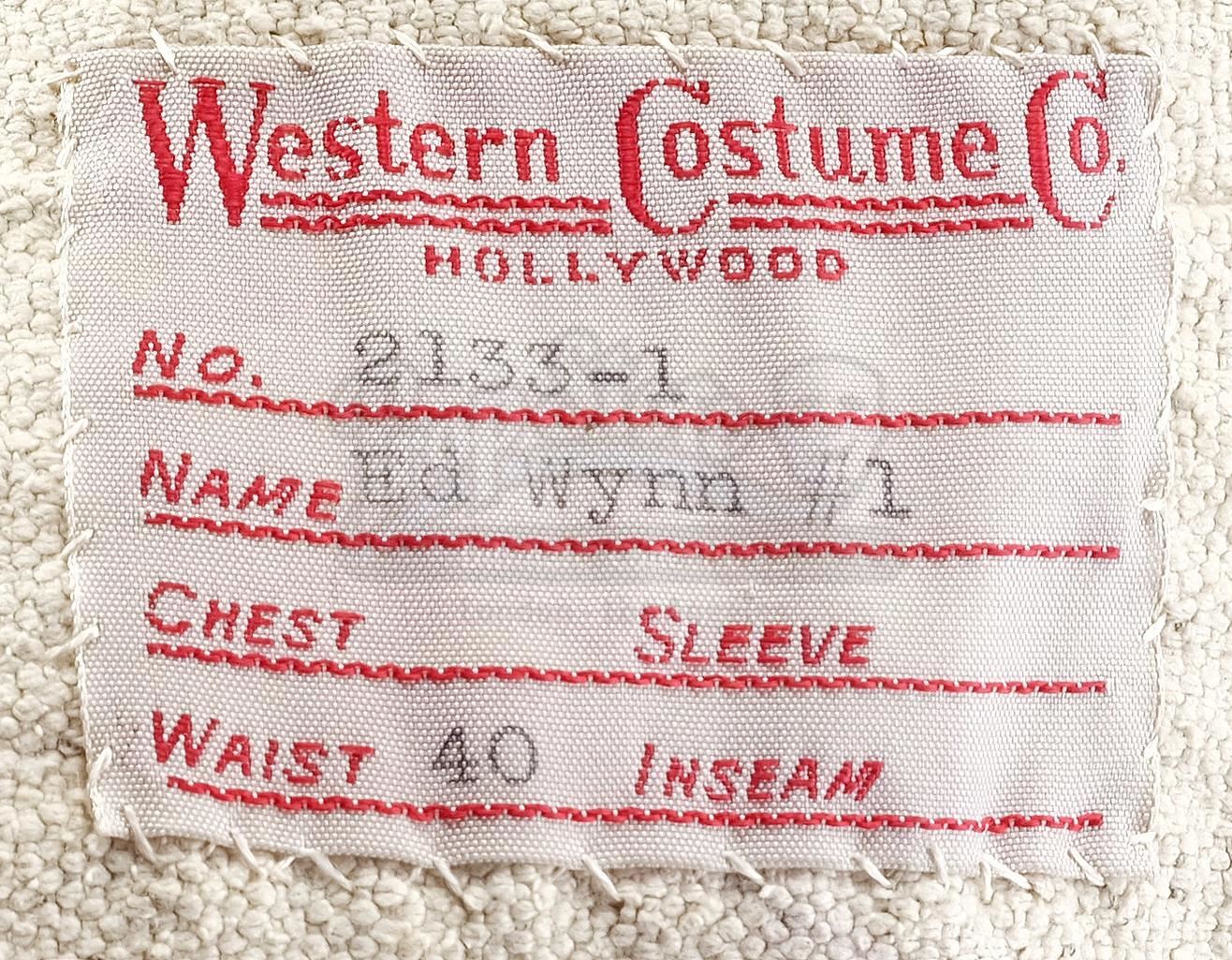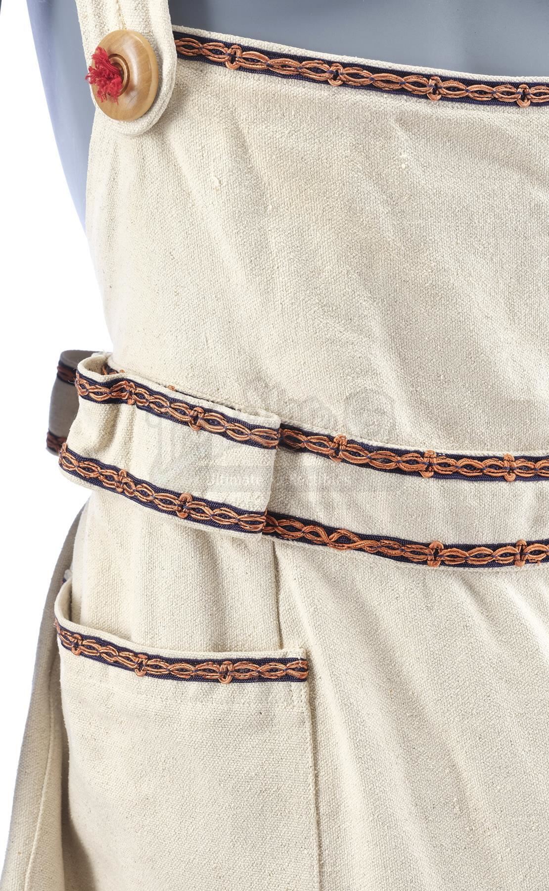 This lot will be auctioned on Wednesday, June 30th. The auction will begin at 9:00am PDT and lots are sold sequentially via live auctioneer; tune in to the live streaming broadcast on auction day to follow the pace. Note other lots in the auction may close on June 29th or July 1st. Toymaker's (Ed Wynn) apron and pants from Jack Donohue's holiday musical Babes in Toyland. The mayor of Toyland, the Toymaker built toys in anticipation of his Christmas deadline with help from his inventive assistant, Grumio (Tommy Kirk). This lot consists of a cream-color canvas apron with oversized wooden buttons, two front pockets, and black and orange thread accents, and a pair of brown and beige patterned wool pants with metal clasps. Both items are marked on the interior with Western Costume tags reading "Ed Wynn #1." It exhibits signs of wear from age and use, but remains in good overall condition. Estimate: $600 - 800