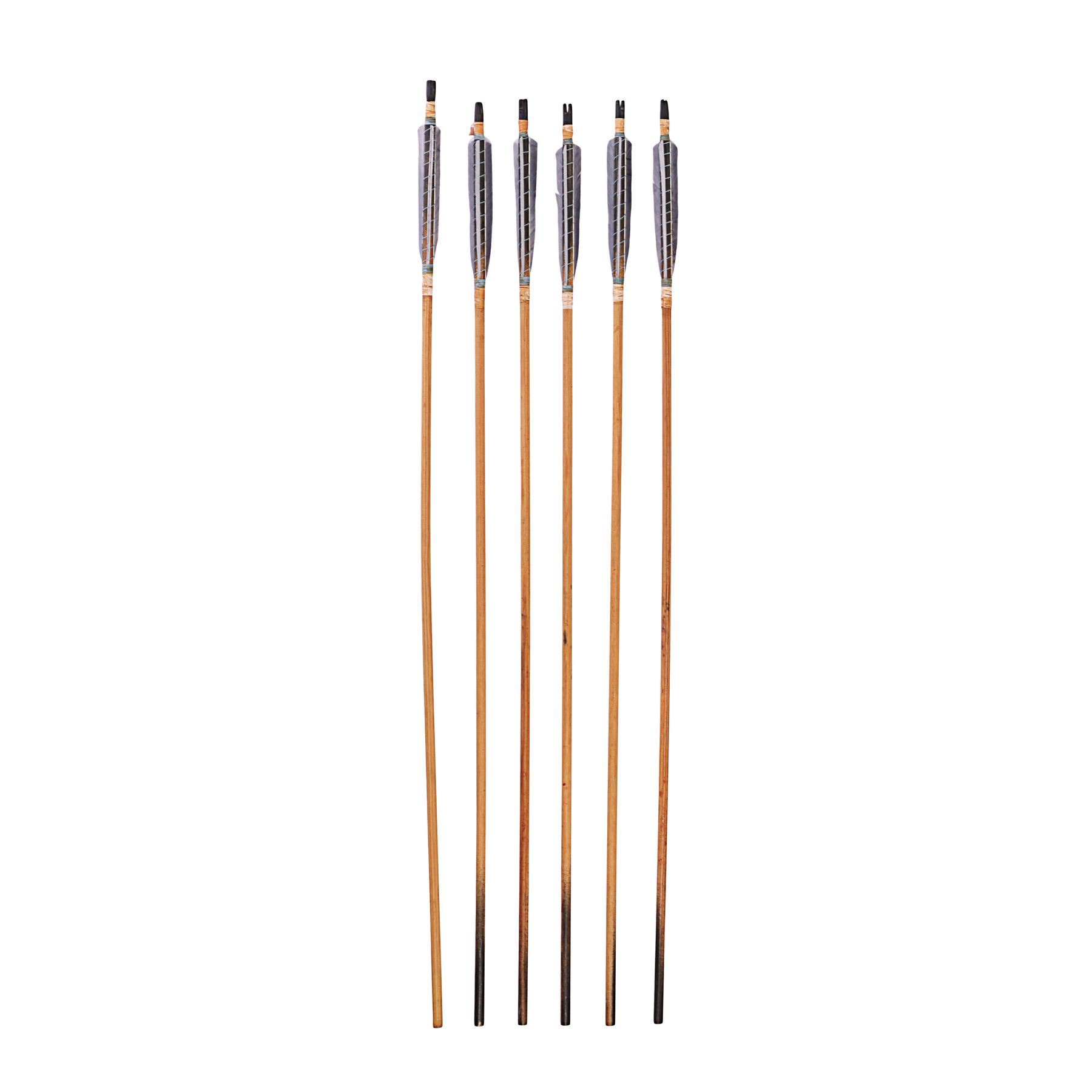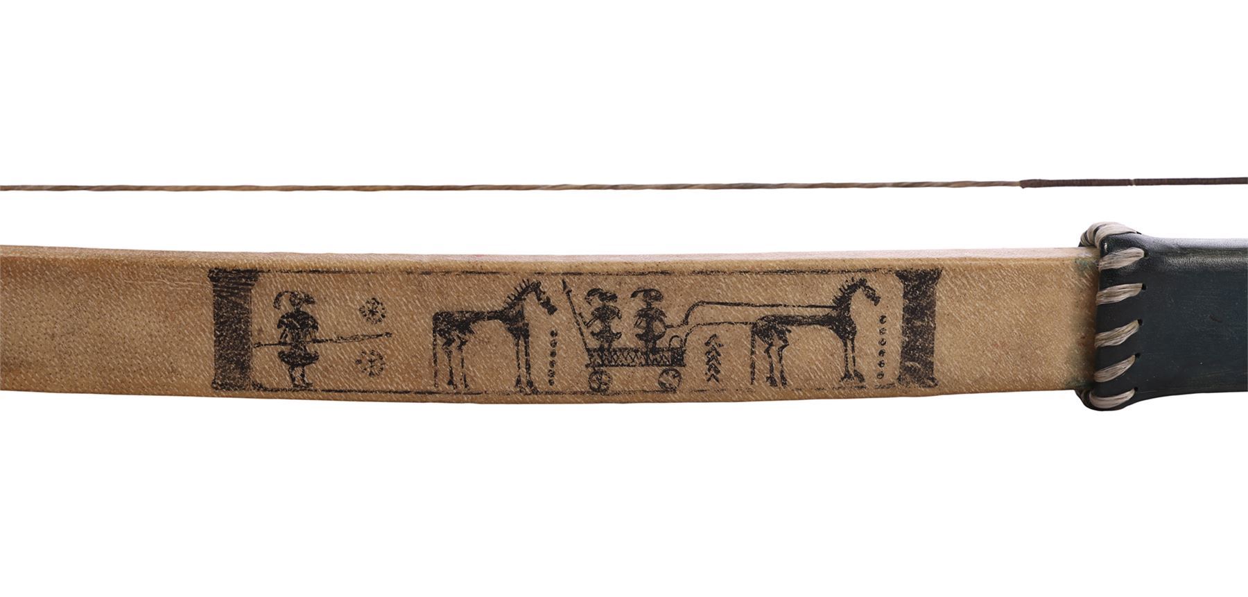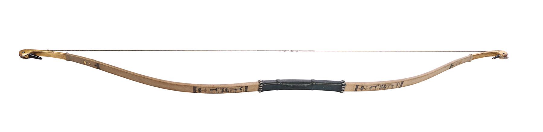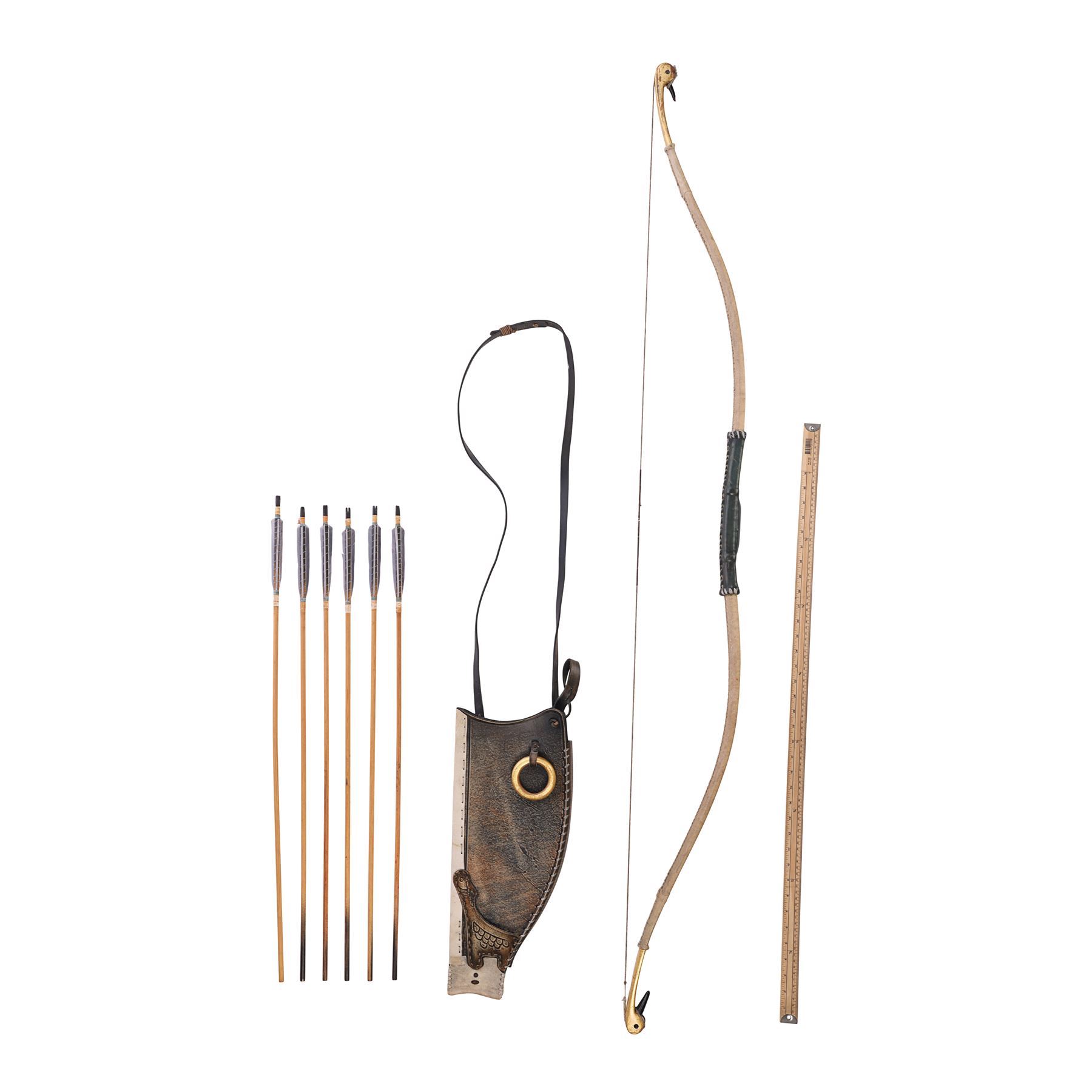 This lot consists of a bow, quiver, and four arrows. The wooden bow is covered in vellum and a dark green leather grip with hand-stitched detailing. The ends of the longbow are finished in gold-color paint and resemble a bird with a black beak. The black leather quiver features a thin leather strap and decorative cream pieces with hand-stitching. One side features a decorative pouch with a scale pattern. A gold-color wooden ring is adhered near the top. Four wooden arrows with gray fletching and darkened blunt ends come with the quiver. This lot exhibits notable paint marks, scratches, scuffs, and mild discoloration. Dimensions: 64.5" x 8" x 4" (164 cm x 20 cm x 10 cm)