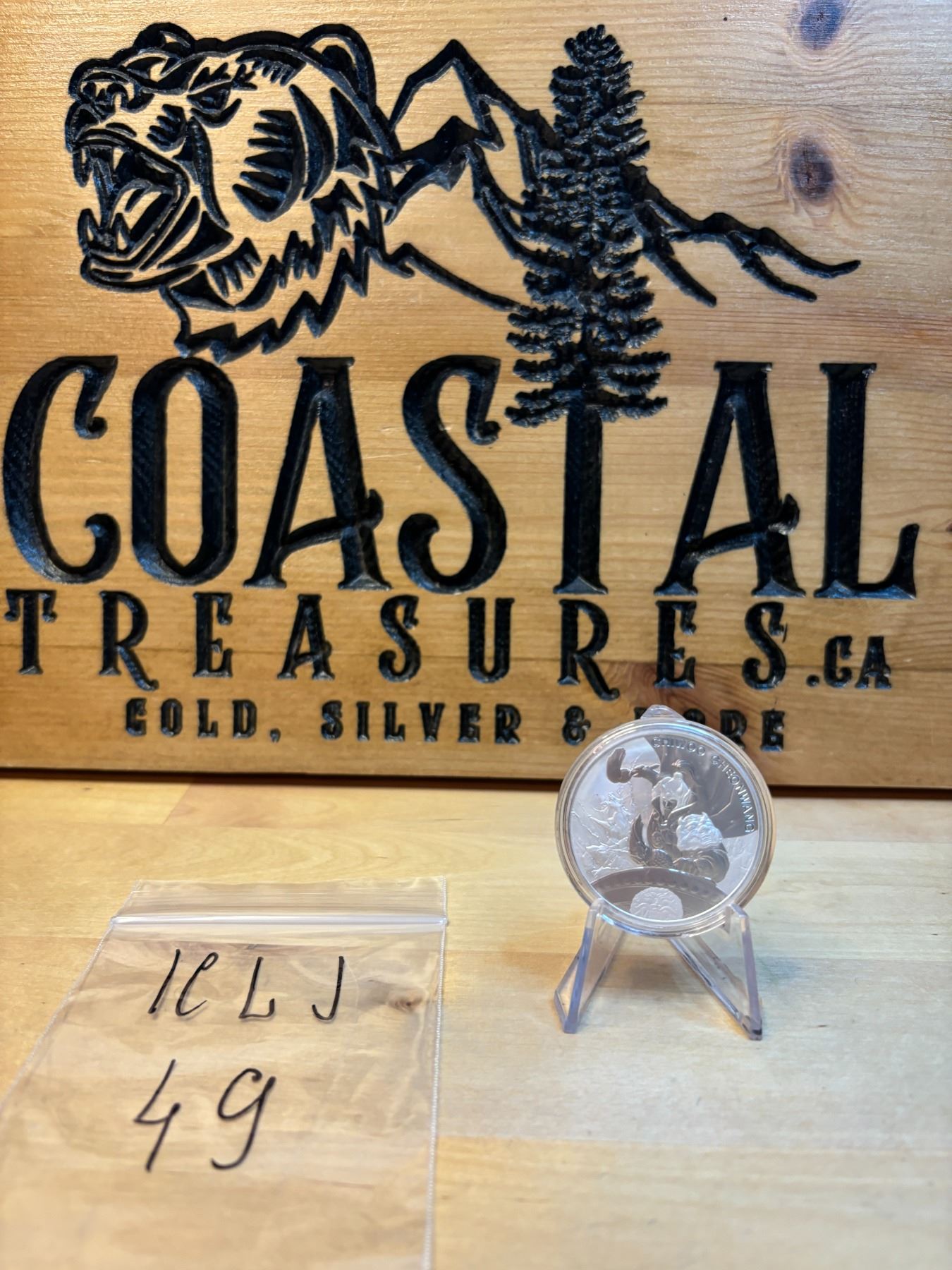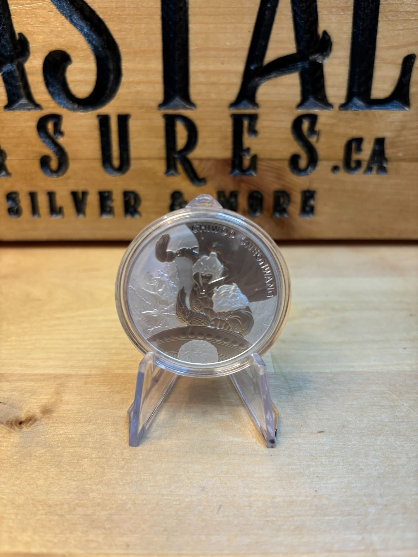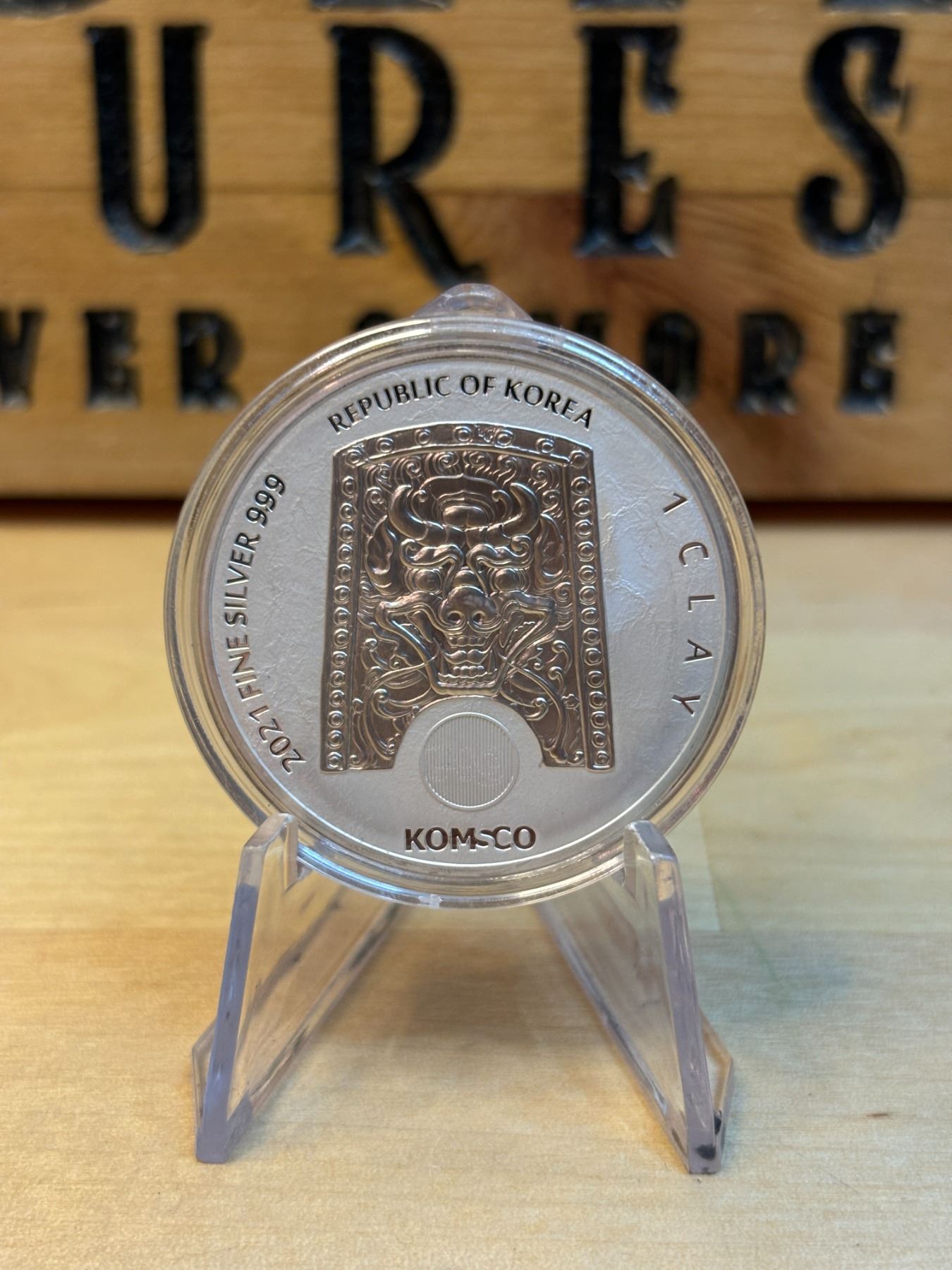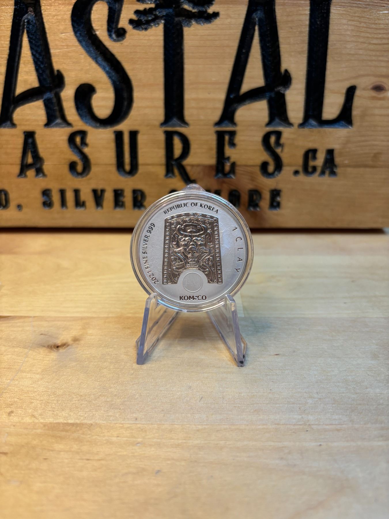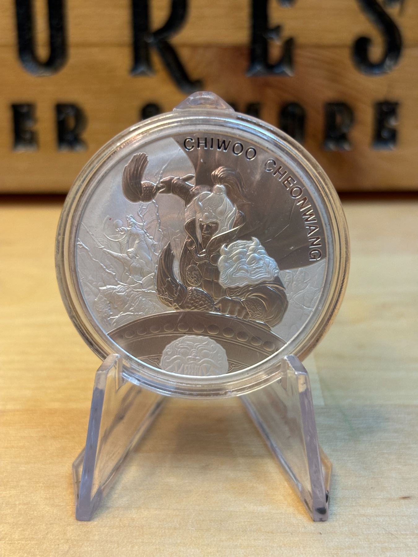 The 1 oz Chiwoo Cheonwang Silver Coin is part of the popular "Chiwoo Cheonwang" series issued by the South Korean Mint (KOMSCO). Made from 1 ounce of .999 fine silver, it features a striking design of Chiwoo Cheonwang, a legendary warrior figure from Korean history, often depicted in armor with a shield and sword. The reverse typically includes elements of Korean heritage, such as traditional motifs or the Korean flag. Known for its intricate details and cultural significance, this coin is highly sought after by collectors and investors for both its artistic design and high silver purity.
