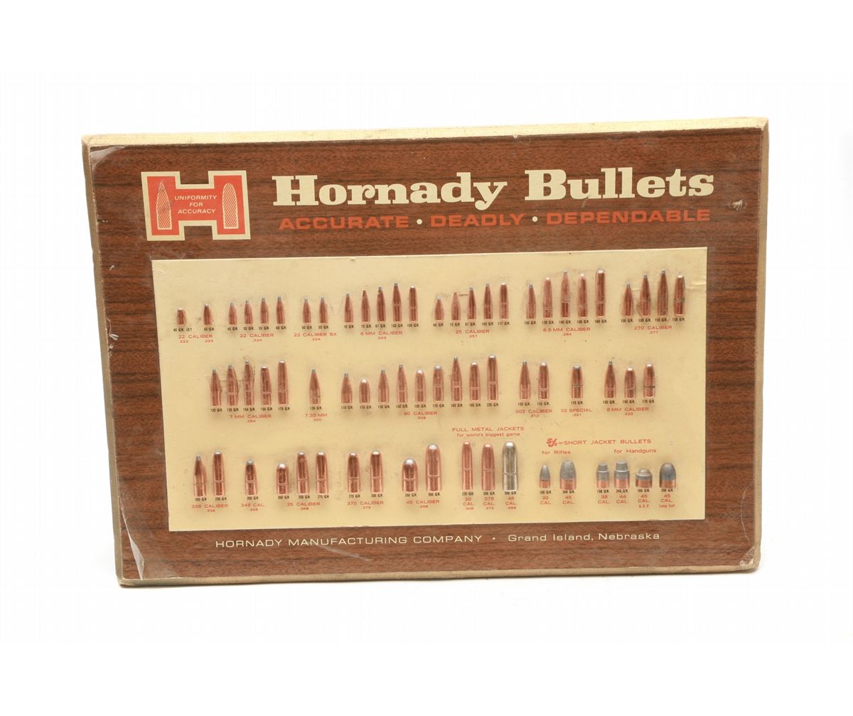 Wood counter or wall Hornady Bullet display board - hard to find display with Short Jacket bullets - complete with 67 bullets from .22 caliber to .45 caliber - wear to wood grain & edges - some laminate peeling at corners - intact counter stand - 18" x 11.5" - non-ffl - 25VVFKIL036