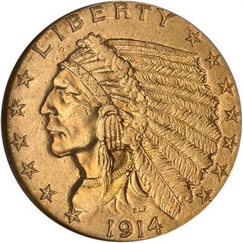 1914 $2.50 Indian. Lustrous and scarcer than the other dates before and after. (#7946)