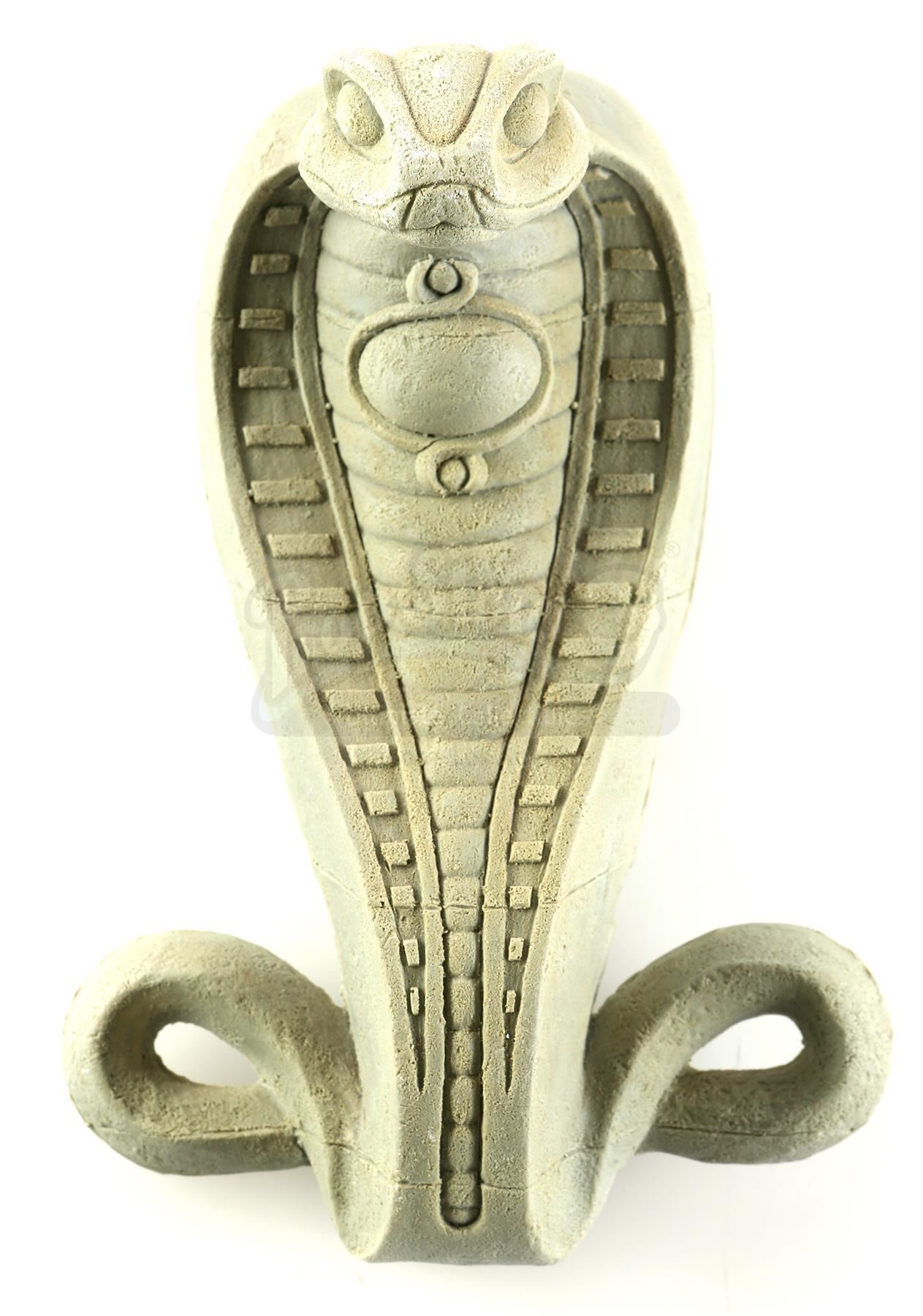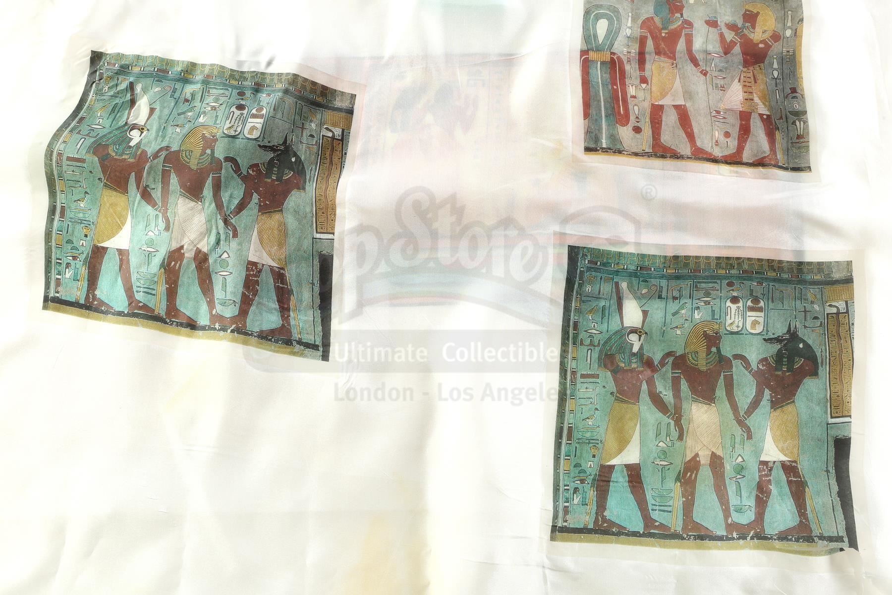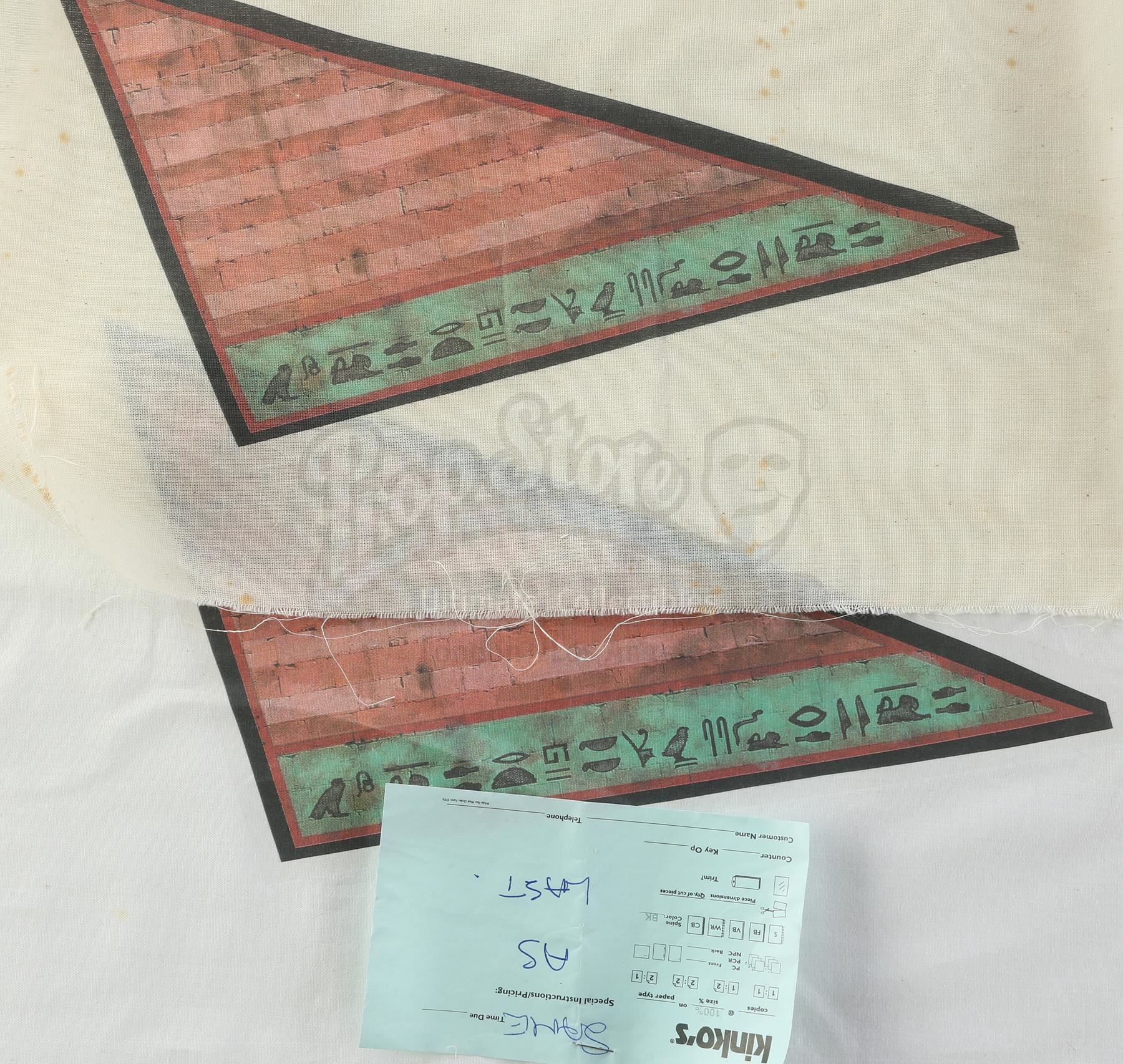 The lot includes six miniature set pieces, including five miniature statues and one miniature sphinx head, production pieces, photos, and a crew hat. Likely made as part of the production of the miniature Thebes and Hamunaptra sets, the pieces remain unpainted and vary in materials as some are made of resin, fiberglass and clay. Also included in the lot are a miniature fire bowl made of wood and resin, 18 mock-up hieroglyphic pieces made of clean resin, and 30 concept Egyptian pictures, 4 of which are printed on paper while the rest are on strips of fabric. A set of 21 behind-the-scenes photos of the miniature sets and a red Industrial LIght & Magic (ILM) VFX crew cap embroidered with the film's title and a beetle hieroglyphic complete the lot. Dimensions: (largest) 16" x 22 1/2" x 1/4" (41 cm x 57 cm x 1 cm); (smallest) 1" x 1/2" (2 1/2 cm x 1 cm)