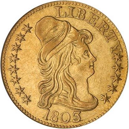 1803 $5 Capped Bust. 3 over 2. A highly original AU58 example of this clear-cut overdate issue with smooth, lustrous yellow to greenish gold surfaces highlighted by warm mellow gold accents and only slight friction on the highest points of the design. The satiny texture adds a good deal to the visual appeal. What's more, the overdate details are plainly evident to the unaided eye. Finally, the surfaces are devoid of all but a few trace marks, and choice as such. Adjustment marks seem to be absent on this handsome specimen, while there is a thin die break below the date extening to the right. (#8084)