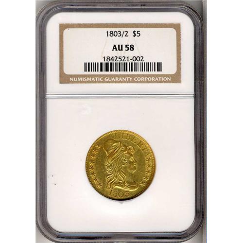 Lot 494 - 1803 $5 Capped Bust. 3 over 2 NGC AU58