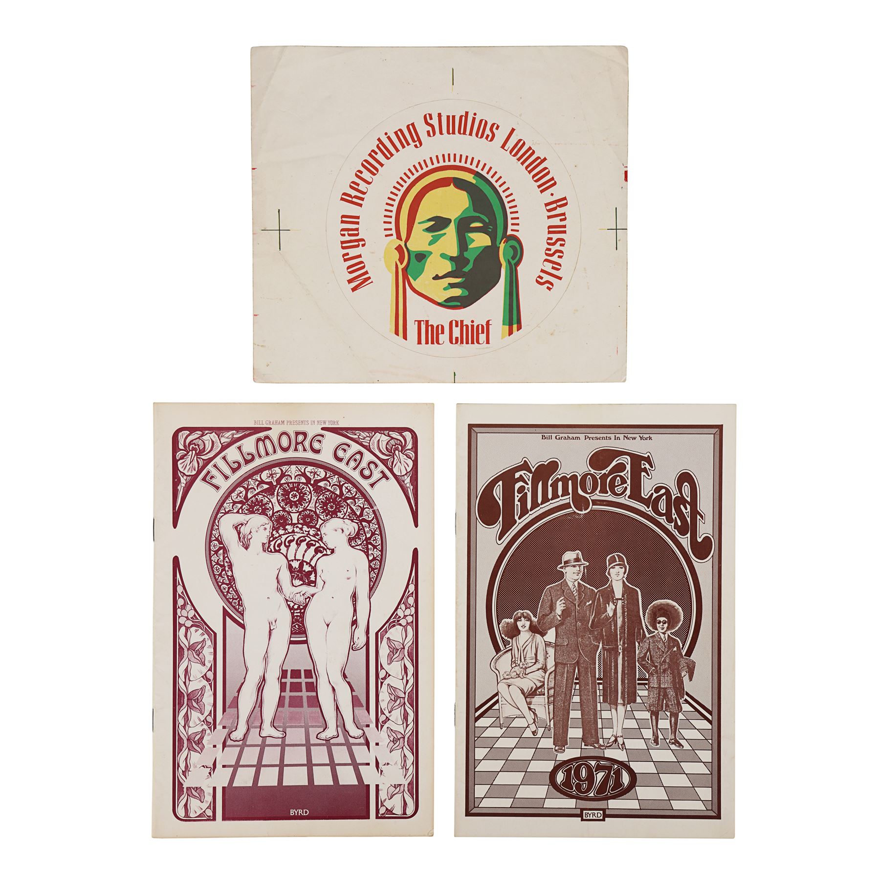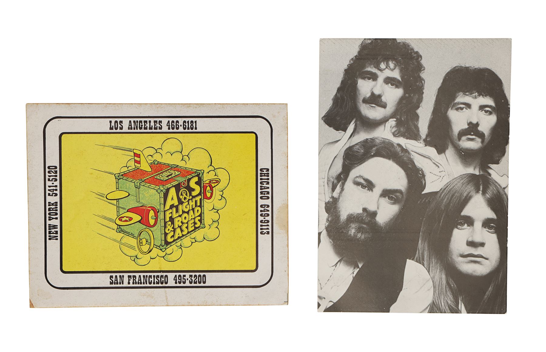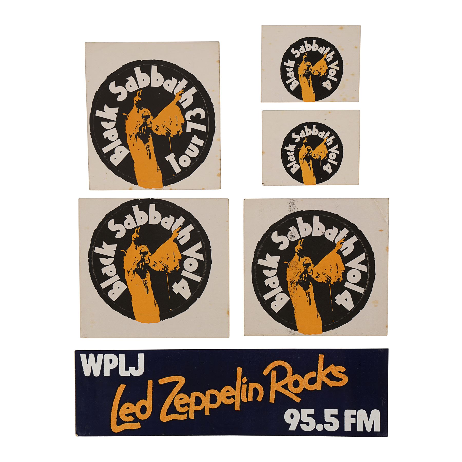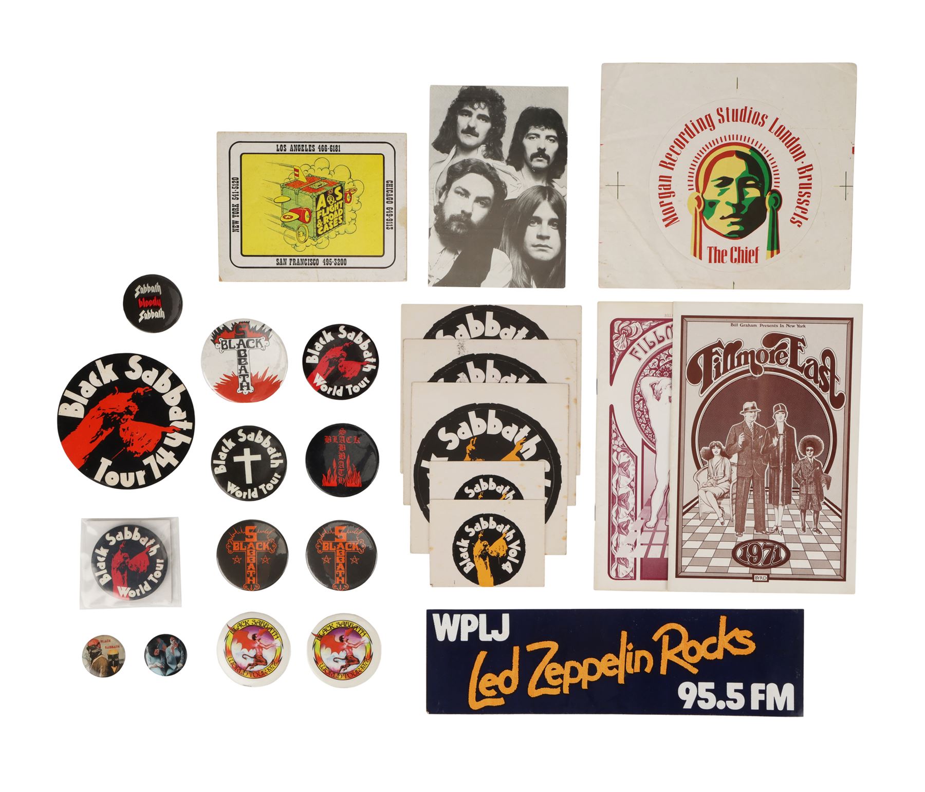 The set comprises twelve various-sized badges; a "Black Sabbath Tour 74" sticker; five "Black Sabbath Vol 4" stickers; a postcard featuring a black-and-white image of the band; two Fillmore East concert programmes; an A&S Flight & Road Cases label; a Morgan Studios sticker; and a "WPLJ, Led Zeppelin Rocks, 95.5 FM" bumper sticker. Some items display minor discolouration and the backs of the badges exhibit tarnishing. Dimensions (concert programme): 21.5 cm x 14 cm (8 1/4" x 5 1/2")