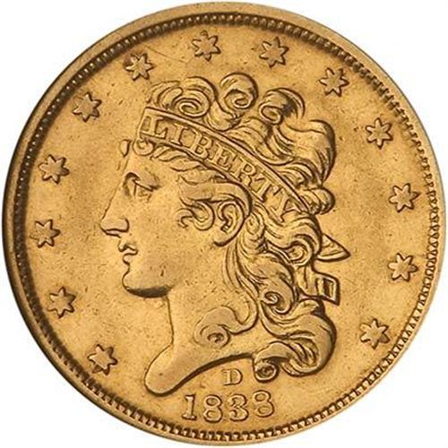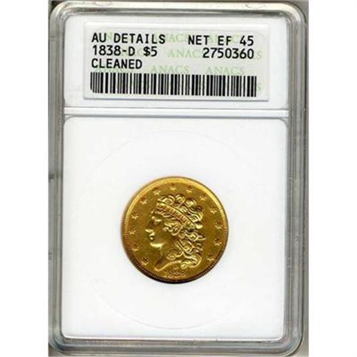 1838-D $5 Classic Head. Scarce. The entire production of 20,583 coins was produced from a single die pair, thus just one variety is known. Dahlonega, Georgia struck gold coins from 1838 to 1861 when it was closed at the time of the War for Southern Secession, also known as the American Civil War. (#8178)