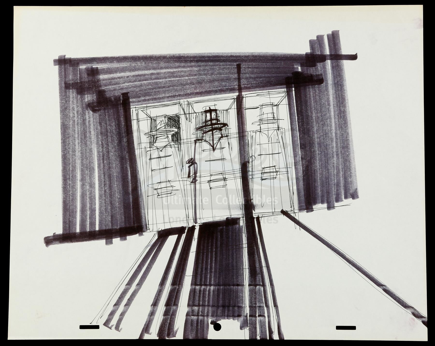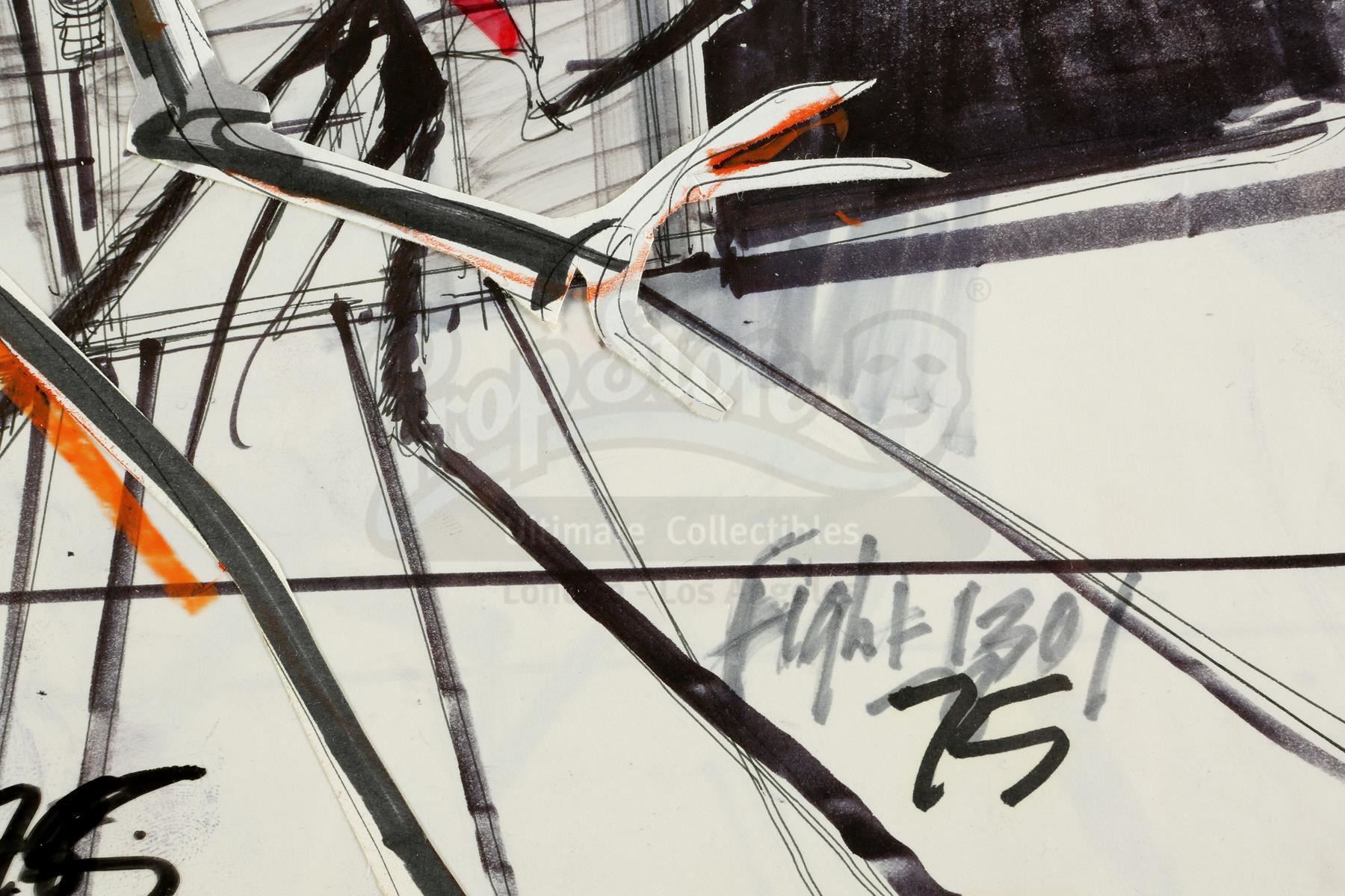 This lot consists of four total pages--two pieces of animation paper stapled together, and an animation paper with a transparent cel sheet over top of it. All are hand-drawn in mixed media and depict the lair sequence. The sheets are marked "1301-SC 75" and "Fight 1301 75" with other small notations and exhibit tiny rips and creases to the edges, but they remain in good overall condition. Dimensions (each): 10 1/2" x 13" (26.75 cm x 33 cm)