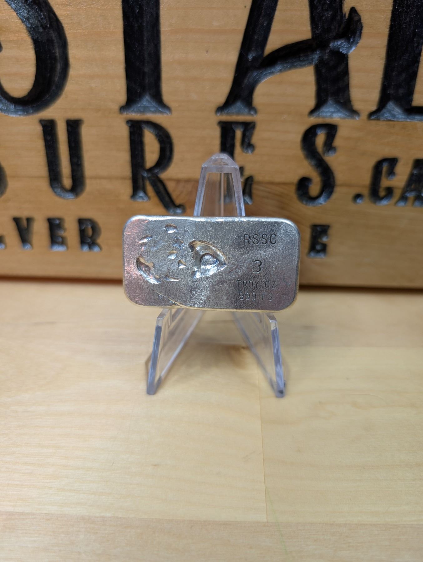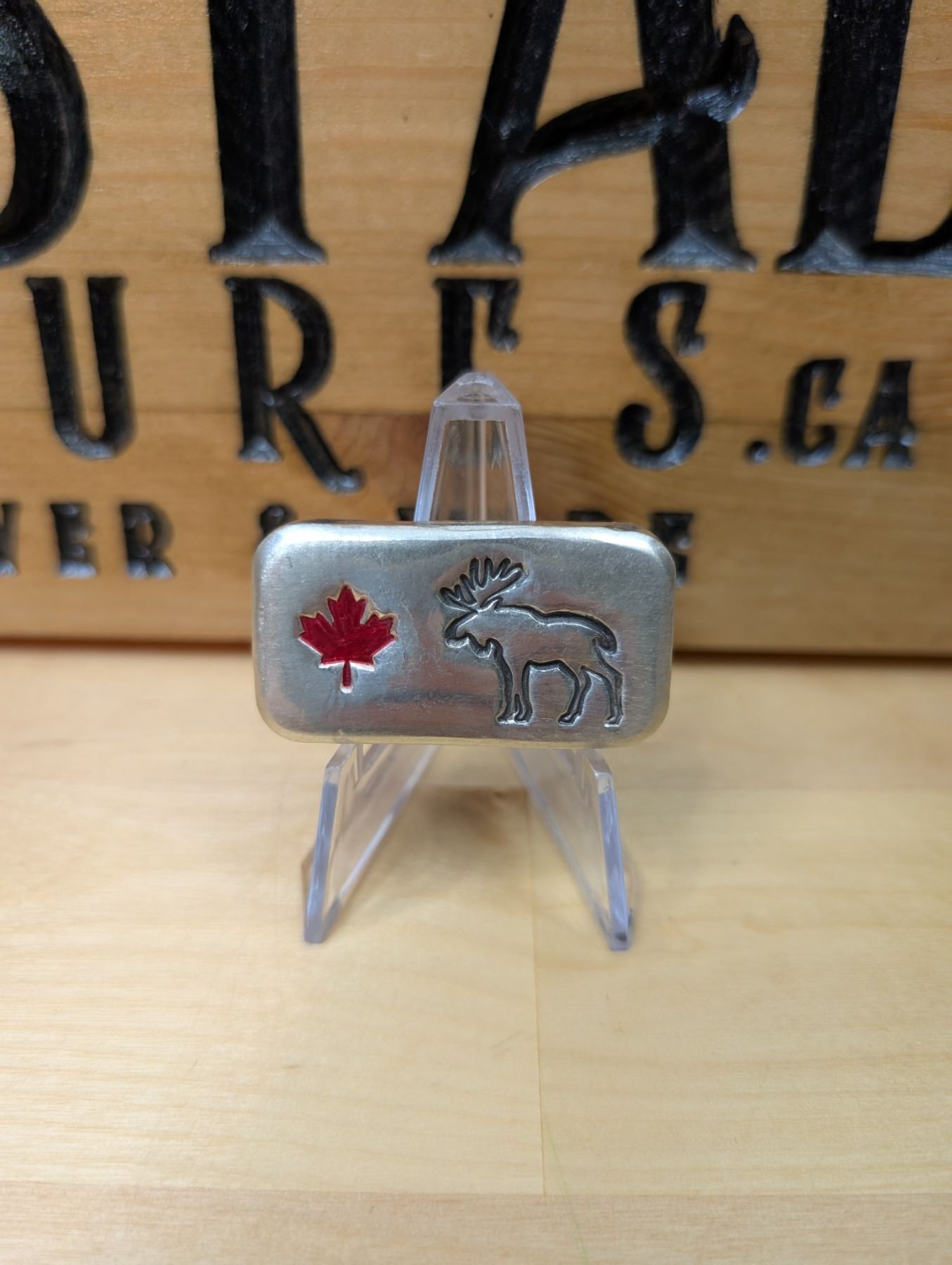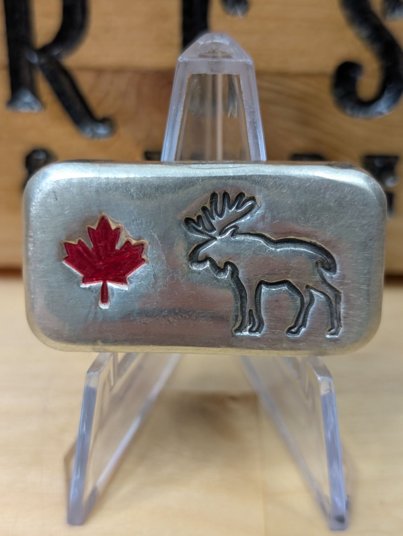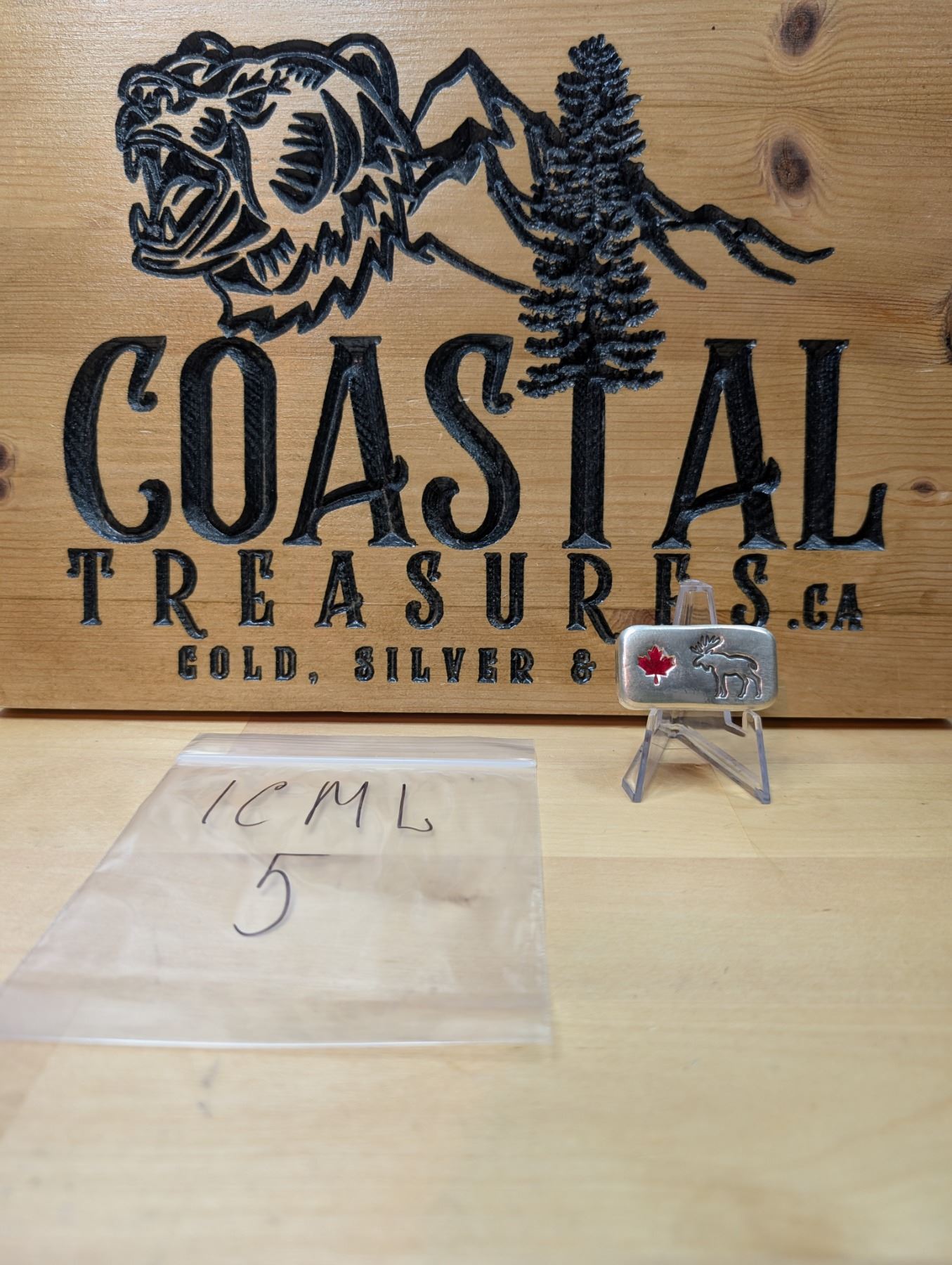 The 3oz Coloured Canadian Moose Silver Bar is a unique silver bar made of 99.9% pure silver. It features a vibrant, image of a majestic Canadian moose, capturing the beauty of this iconic wildlife species. The bar weighs 3 ounces and is often valued by collectors for both its silver content and the intricate design. It combines the appeal of a high-purity silver bar with the visual interest of a colorful wildlife theme.
