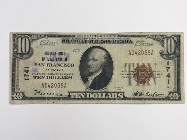 One Lot (5) 1929 $10 San Francisco CA National Currency Notes - Charter 1741.