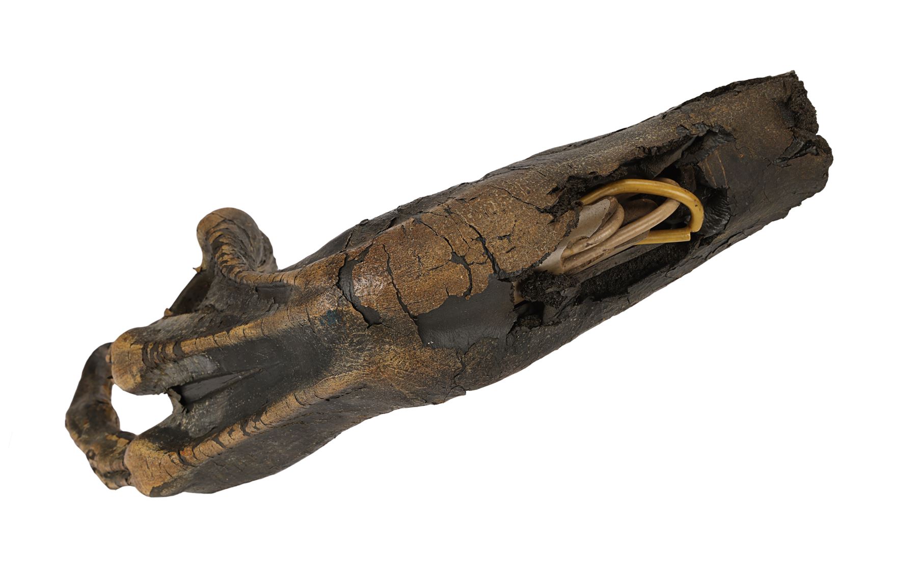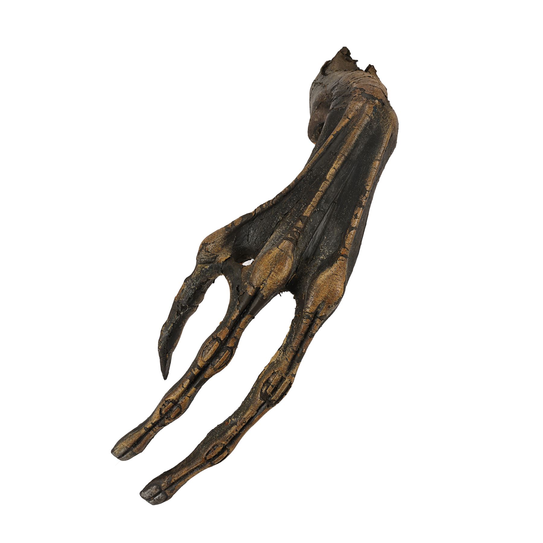 The three-fingered hand is made of foam rubber and features piping and wiring in the arm section, which would have exploded with the creature's acid blood. The hand has wear from production use and age, with the foam rubber becoming dry and fragile, and there are several notable cracks and tears. Dimensions: 48 cm x 21 cm x 14 cm (19" x 8 1/4" x 5 1/2")