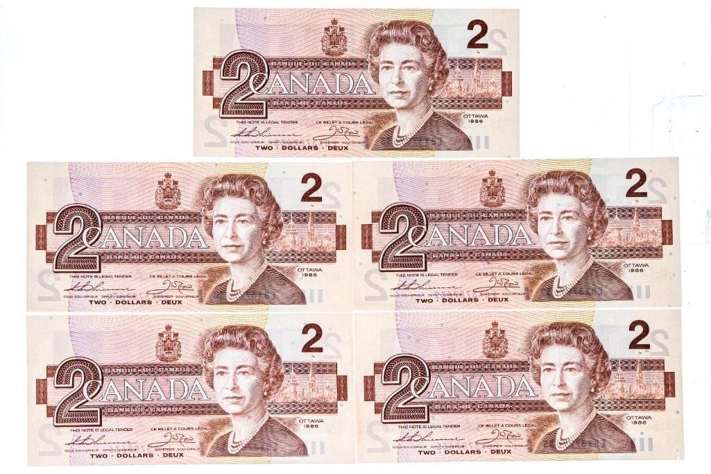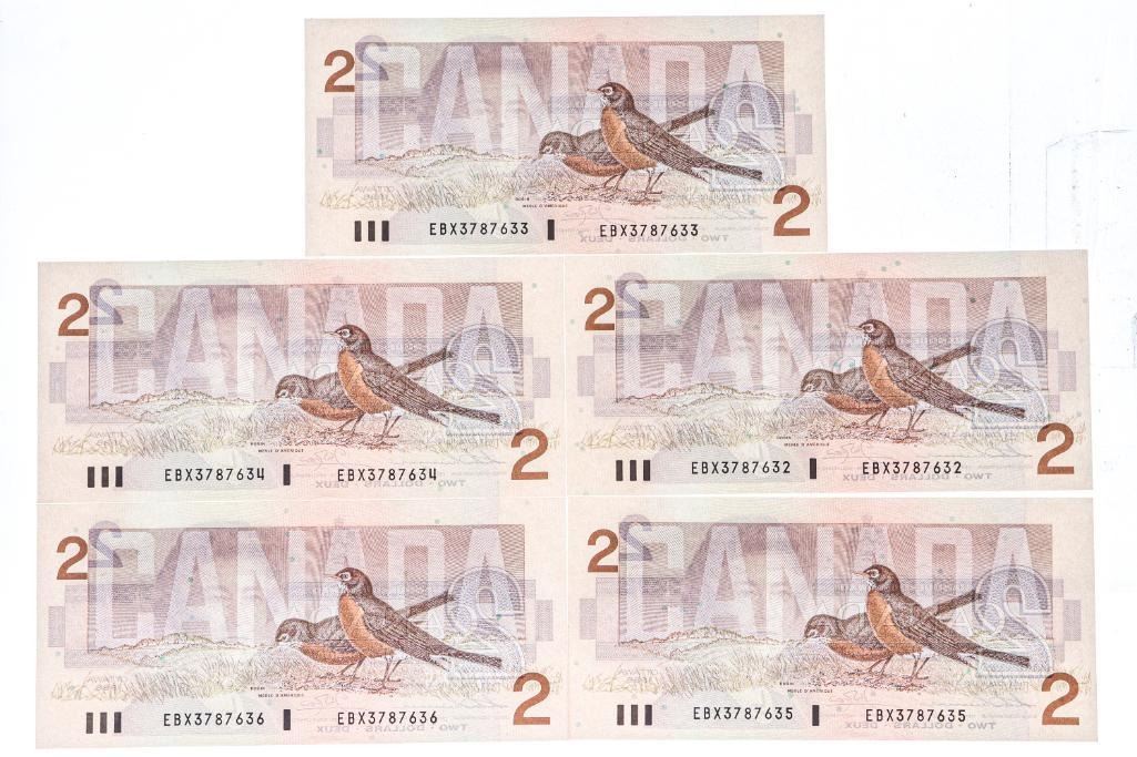 Lot 5 Bank of canada 1986 $2 Gem Unc - 5 in Sequence (EBX)