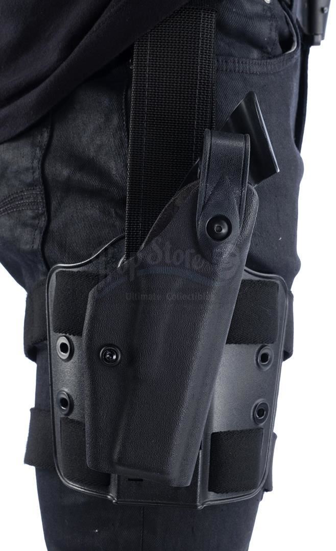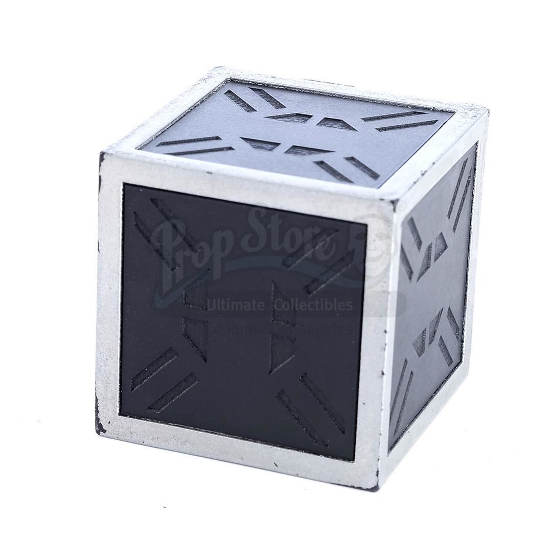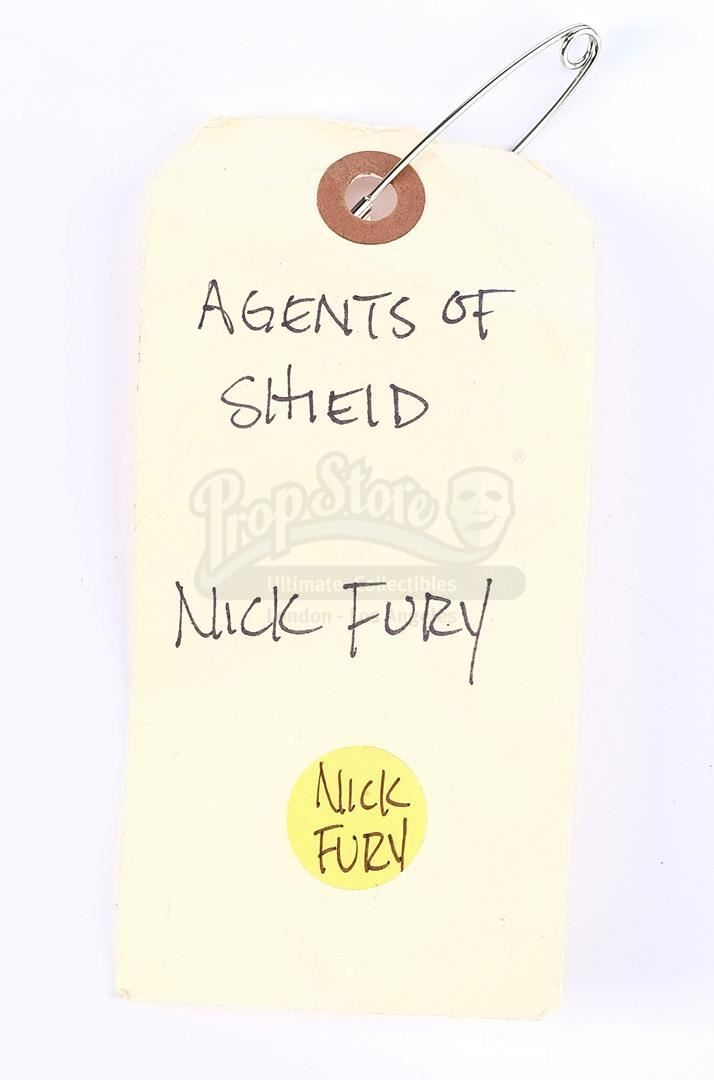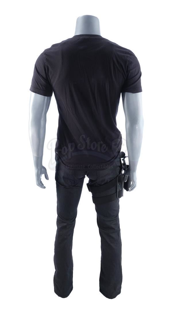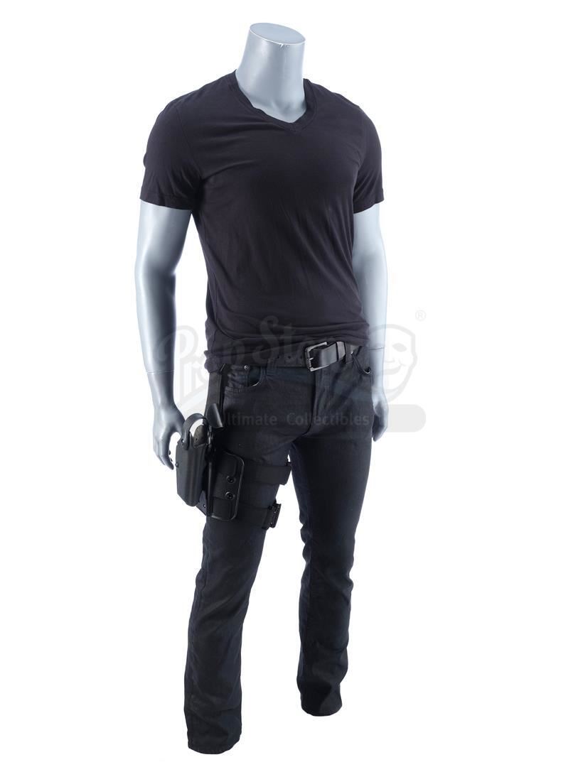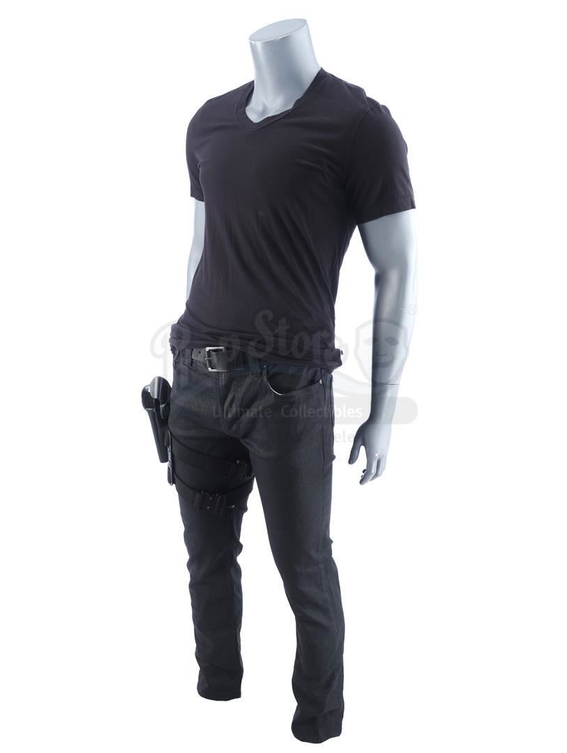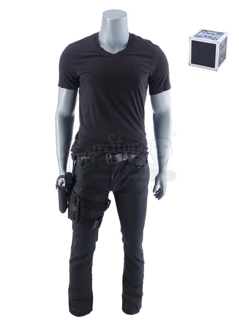 Nick Fury's costume and toolbox from the episode 'The Beginning of the End' (122) of Marvel's Agents of S.H.I.E.L.D. In the episode, Fury wears his costume while helping rescue Phil Coulson and other members of his team from an attack by John Garrett's Hydra team. Later, Fury gives Coulson a high-tech toolbox to help him rebuild S.H.I.E.L.D. This lot consists of a black cotton T-shirt, a black cotton tank top, a pair of black cotton jeans, a black leather belt marked 'N.F. = SLJ', a black urethane gun holster with nylon straps tagged 'Agents of SHIELD NICK FURY', a pair of black cotton socks, and a black and silver resin and rubber toolbox cube with a series of engravings. This lot is in excellent overall condition with some minor wear from production on all items. Dimensions (toolbox): 2" x 2" x 2" (5 cm x 5 cm x 5 cm)