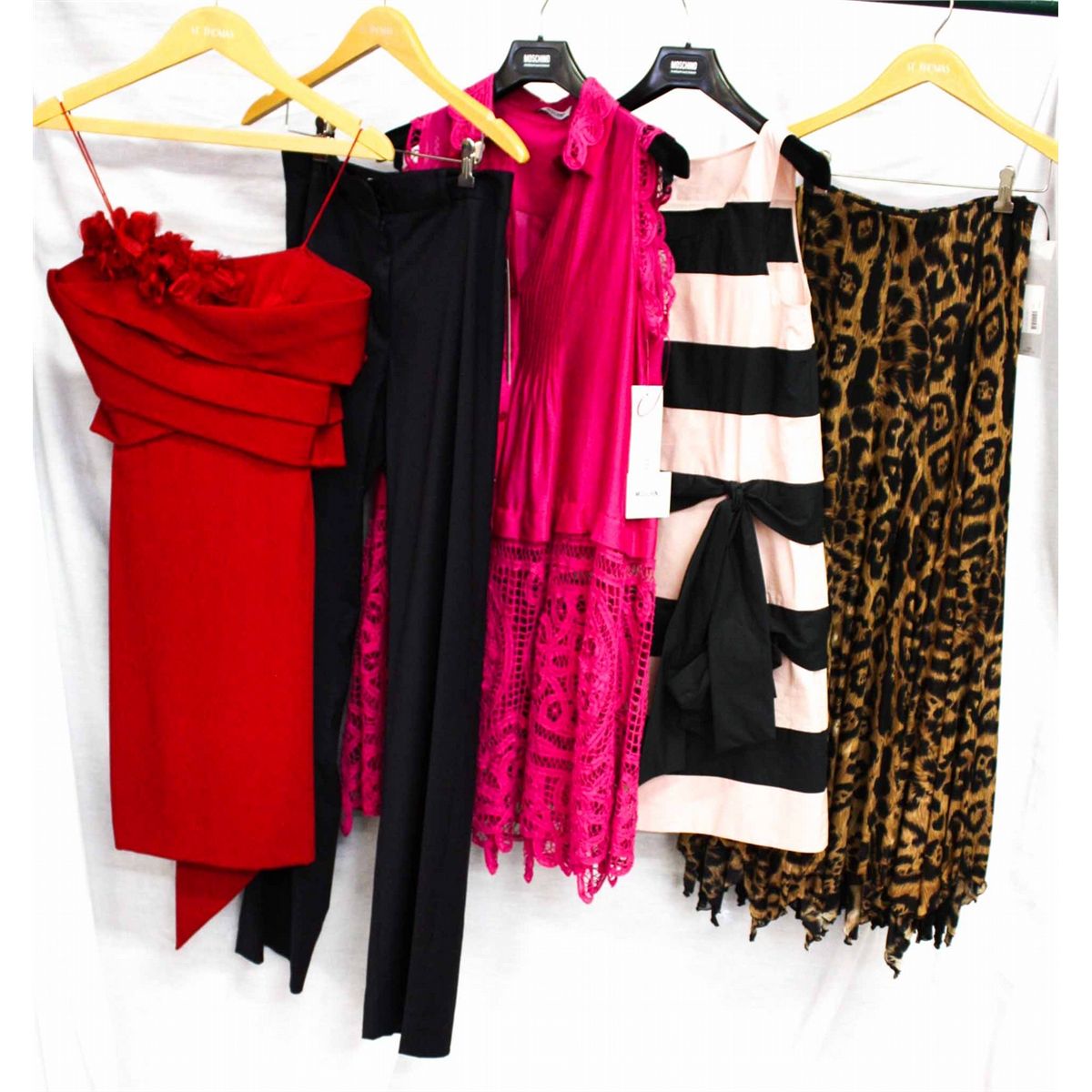 Lot [5] PIECES: [1] Marchesa red strapless dress with flower top, size 6, [1] Teri Jon navy pants, size 6, [1] Moschino flush dress, size 6, [1] Moschino pink dress with black bow, size 6 and [1] Musani skirt, size 6
