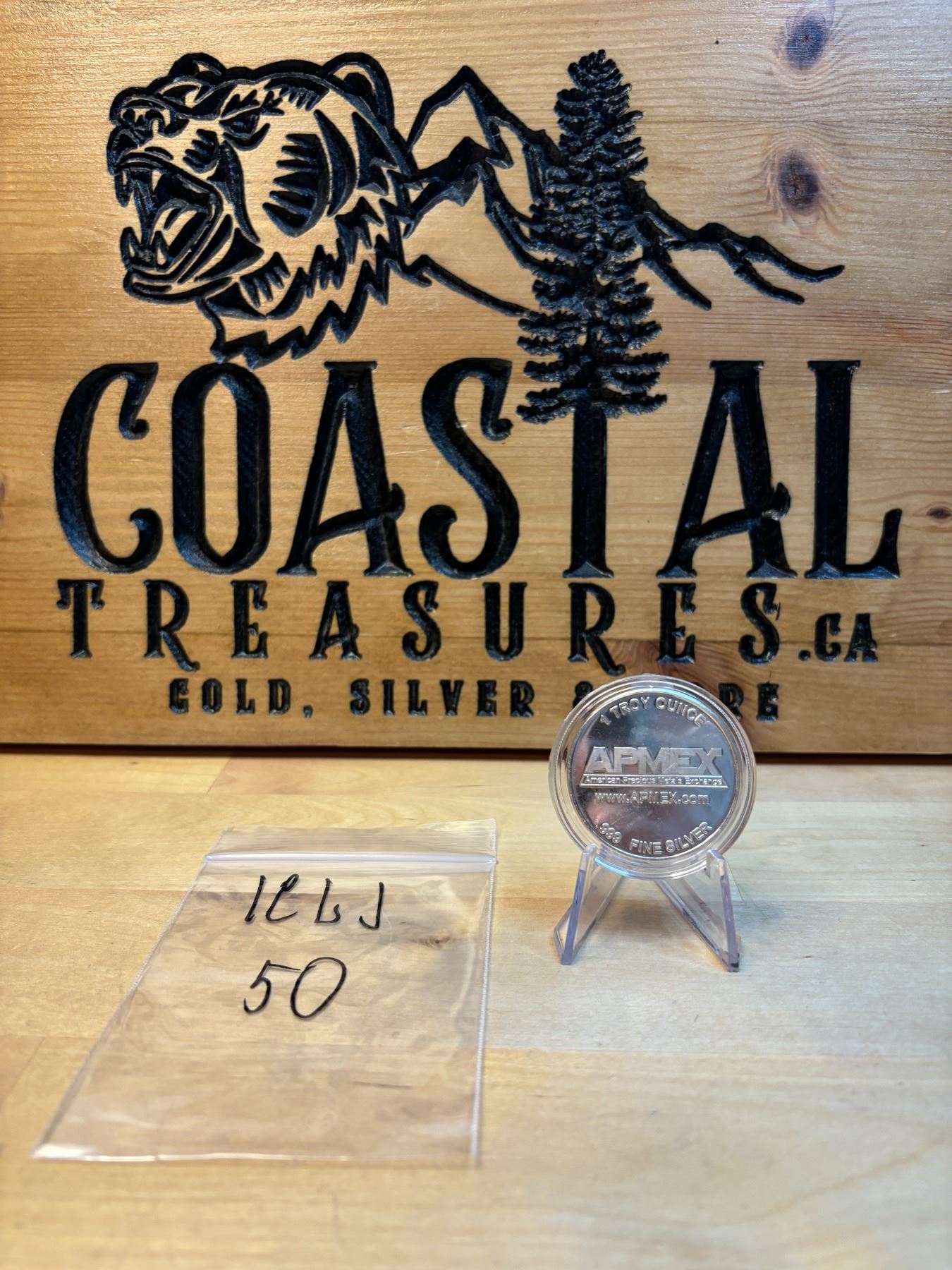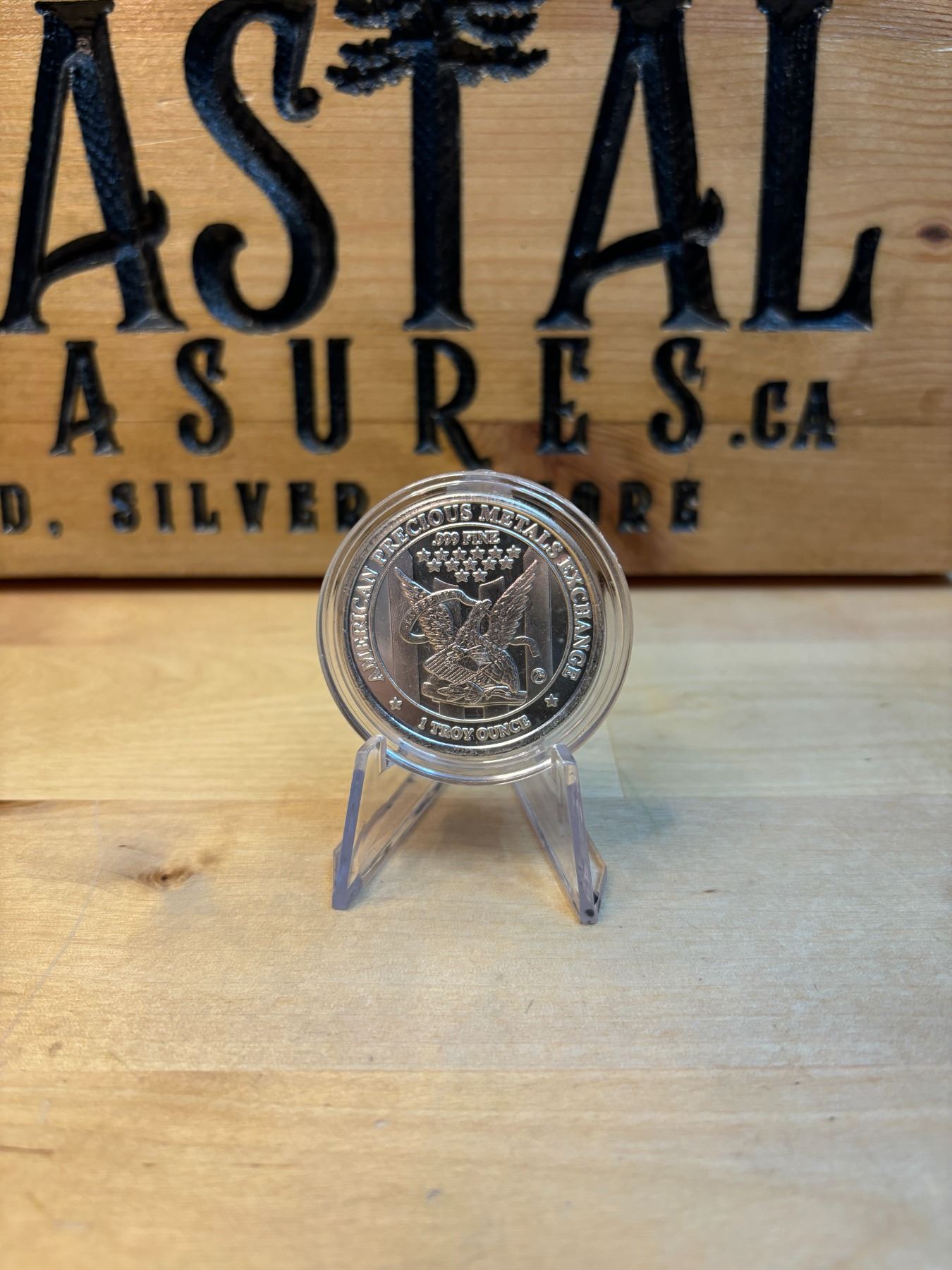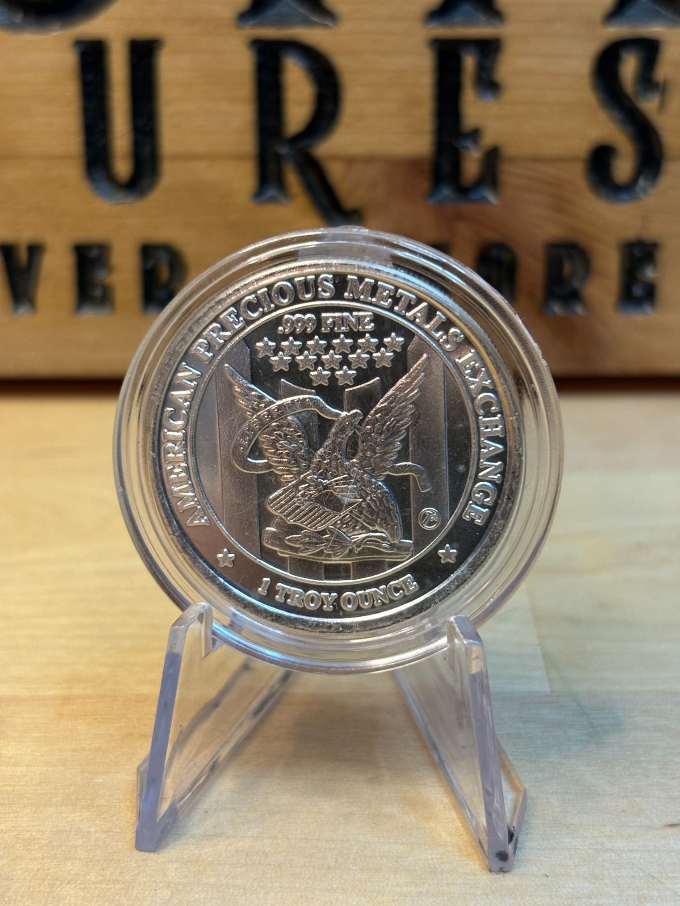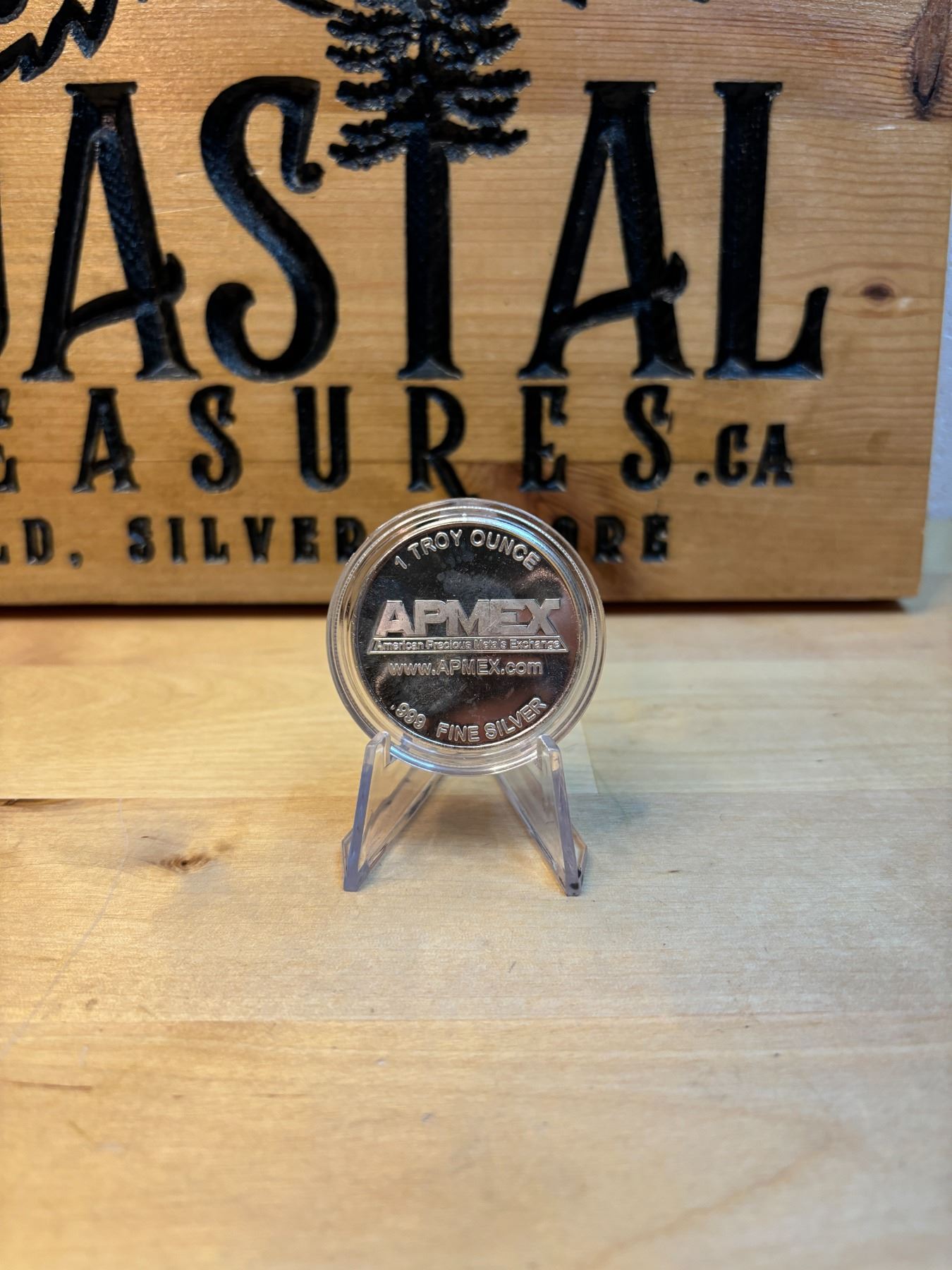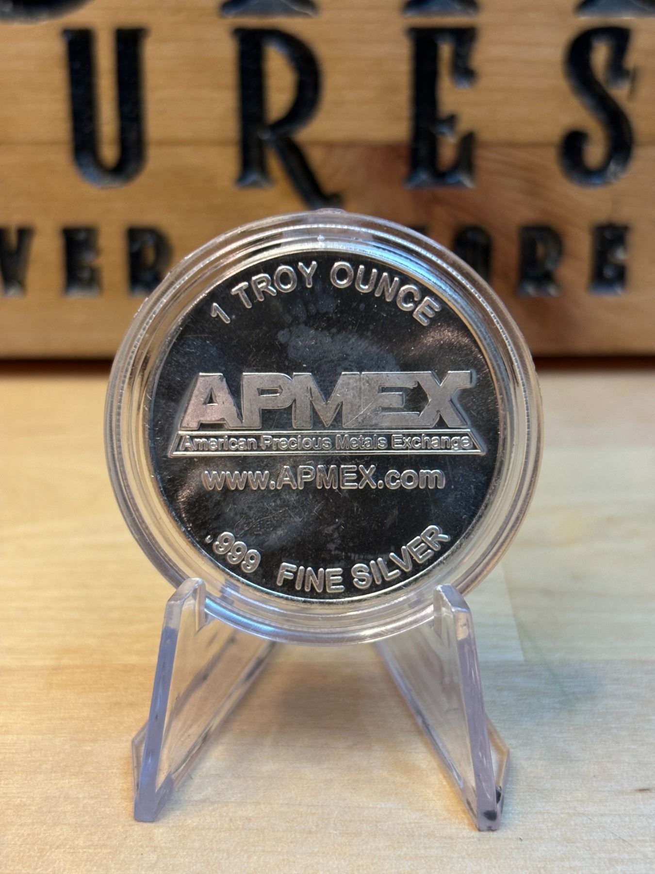 The 1 oz APMEX Silver Round is a bullion round produced by APMEX, a well-known precious metals dealer. It contains 1 ounce of .999 fine silver and typically features the APMEX logo or other simple designs. While these rounds have no face value, their worth is based on the silver content, with a potential premium for their quality and the trusted APMEX brand. These rounds are popular among investors and collectors due to their purity, weight, and the reputation of APMEX as a reliable issuer.