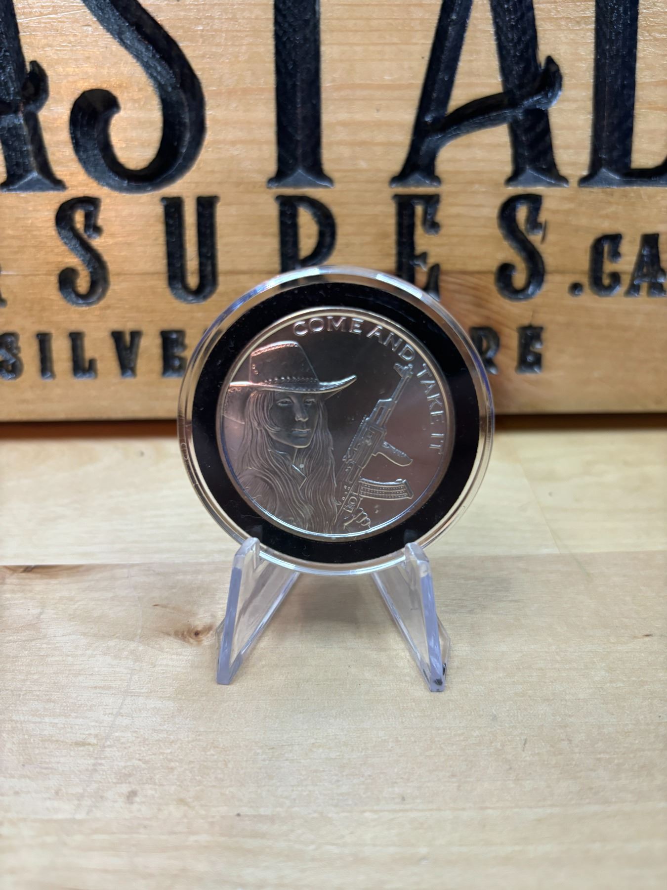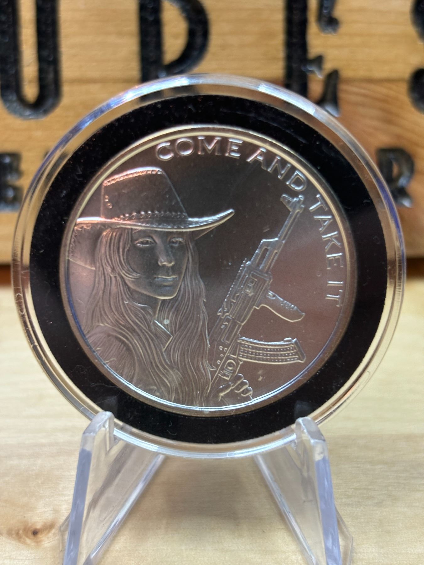 The 1 oz "Come and Take It" Silver Coin or round is inspired by the famous historical slogan from the Battle of Gonzales during the Texas Revolution in 1835. Made from 1 ounce of .999 fine silver, it typically features the image of a cannon, symbolizing the event where Texian rebels resisted Mexican forces. The reverse often displays weight and purity markings. This silver round is popular among collectors, particularly those with an interest in Texas history, revolution, or patriotic themes. Its design, combined with the high silver purity, makes it an appealing piece for both investment and historical significance.
