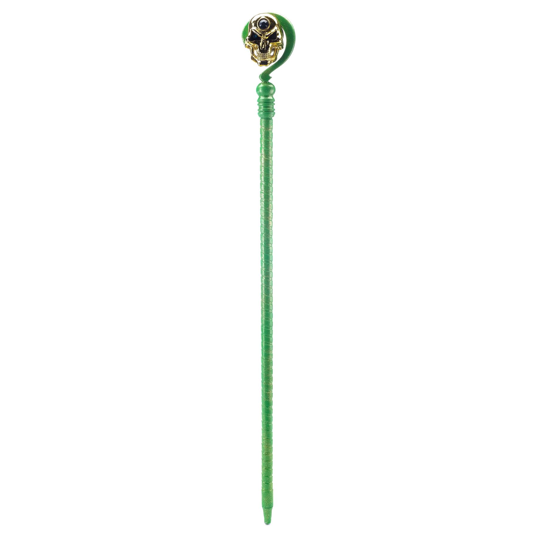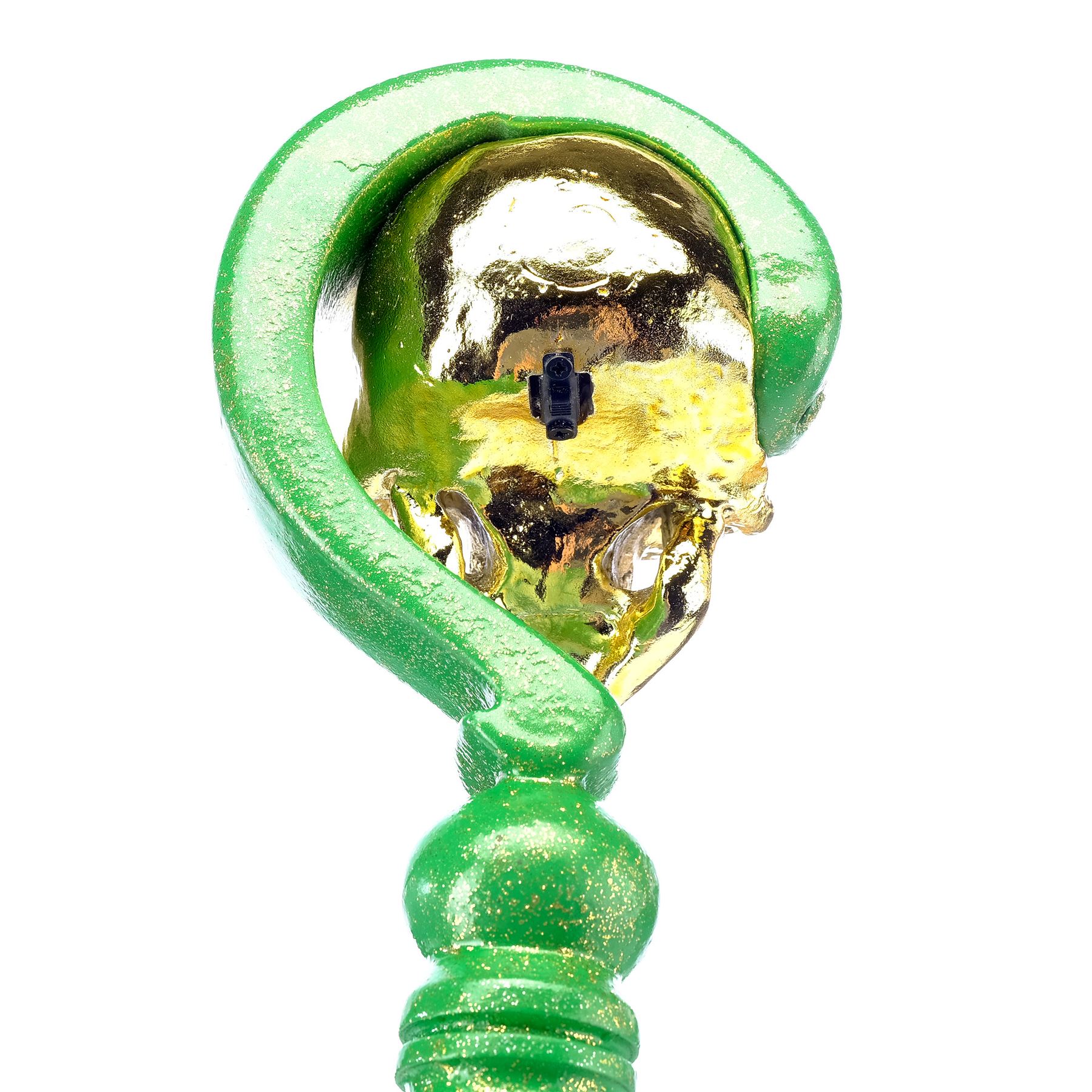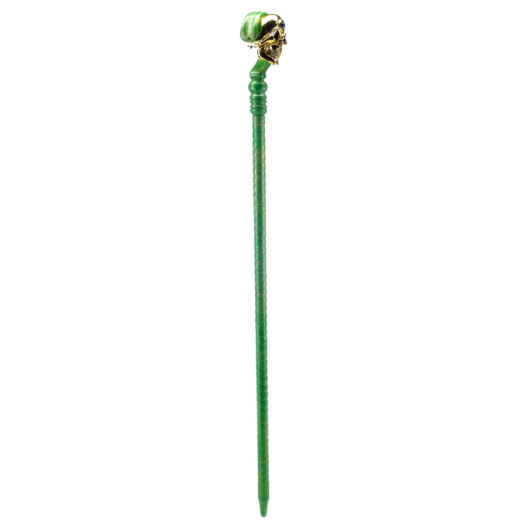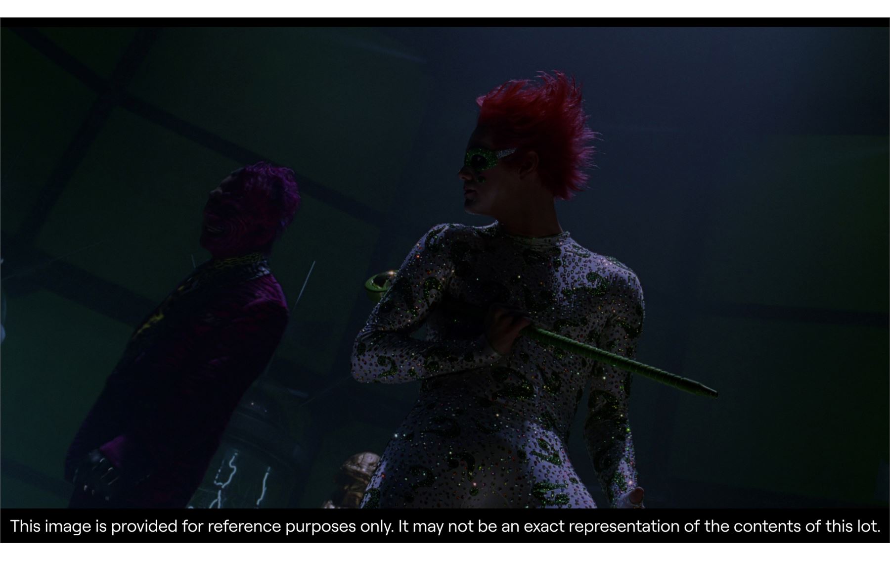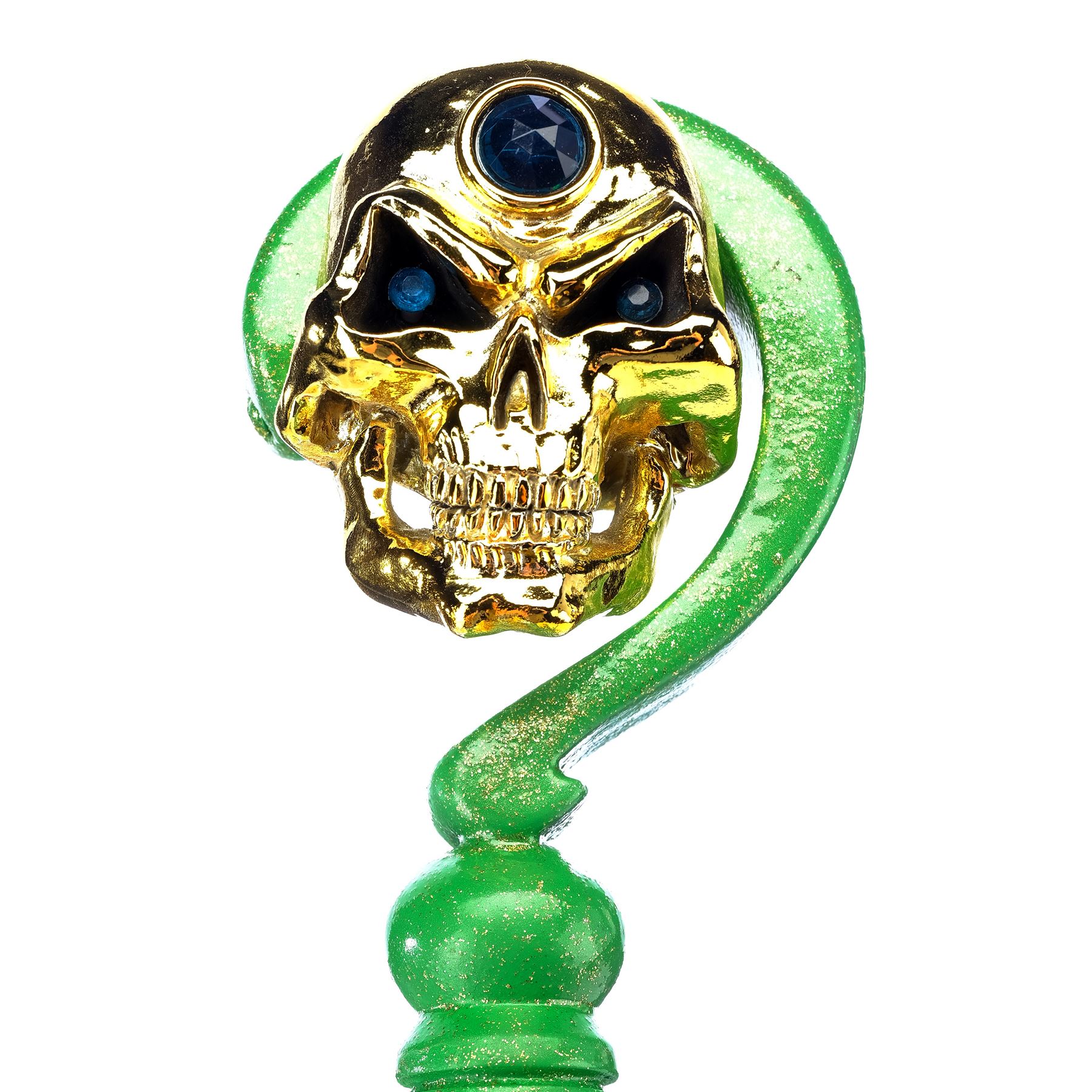 This lot consists of a wooden cane with metal tip painted in bright neon green with a sparkle finish. It features the Riddler's signature question mark symbol as a handle, but with an added inset gold-colour skull in a shiny metallic finish. The skull also features green faux jewels inset to the eyes and forehead. This cane exhibits some chipped paint and scuffing, as well as loose components. Dimensions: 96.75 cm x 10.25 cm x 9 cm (38" x 4" x 3 1/2")