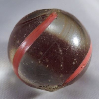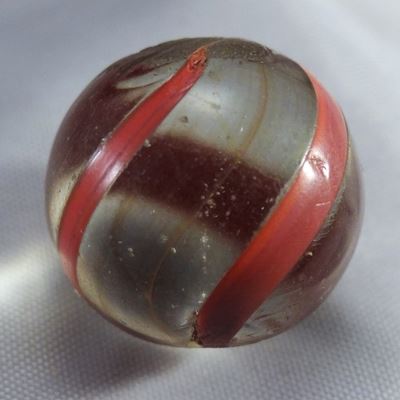 Looks like a Banded Swirl, but it's a type of Submarine. Transparent very lightly smoky gray base glass. Two very wispy stretched bands of red, a third is missing. On the surface are three bands of mixed red and lavender, mirroring the clear spaces in the submarine layer. One very small subsurface moon, in a clear space where the missing submarine band would be. Germany, circa 1860-1920. 21/32". Near Mint(+) (8.9).