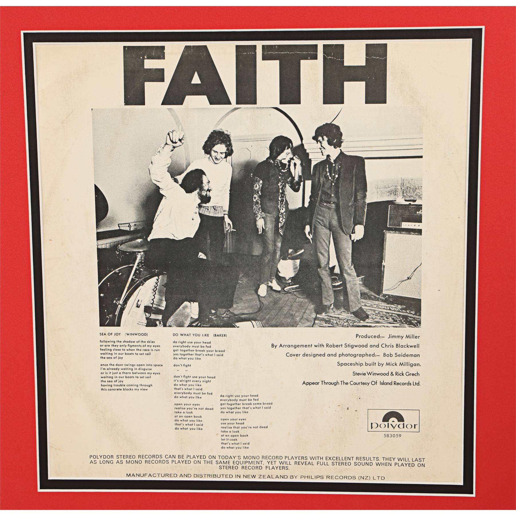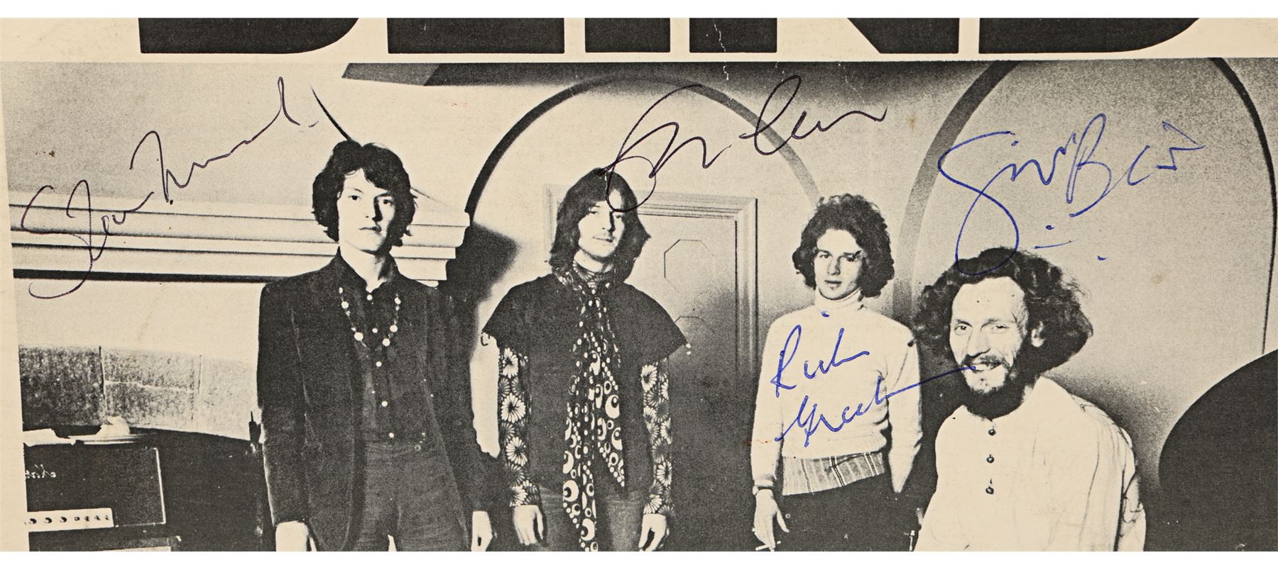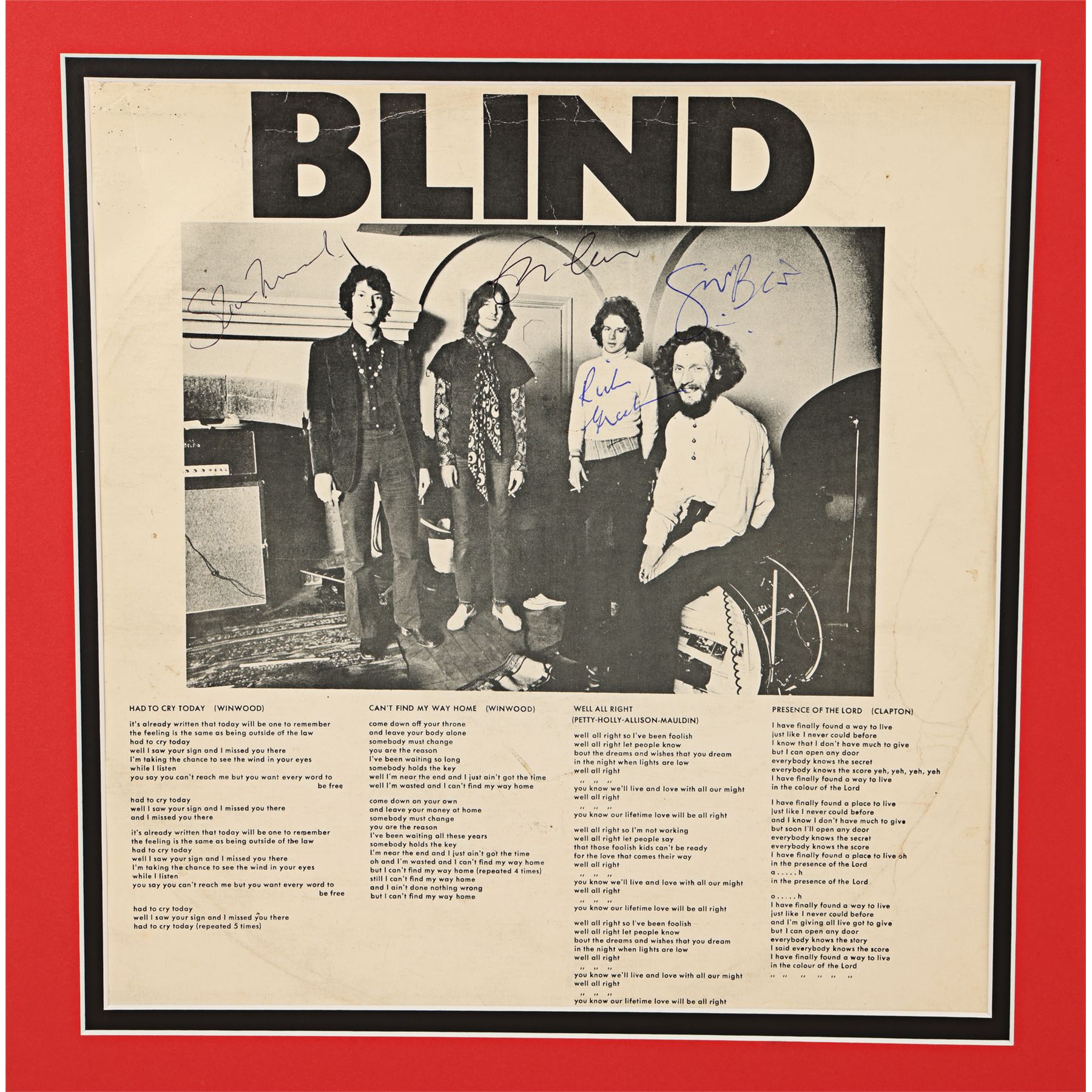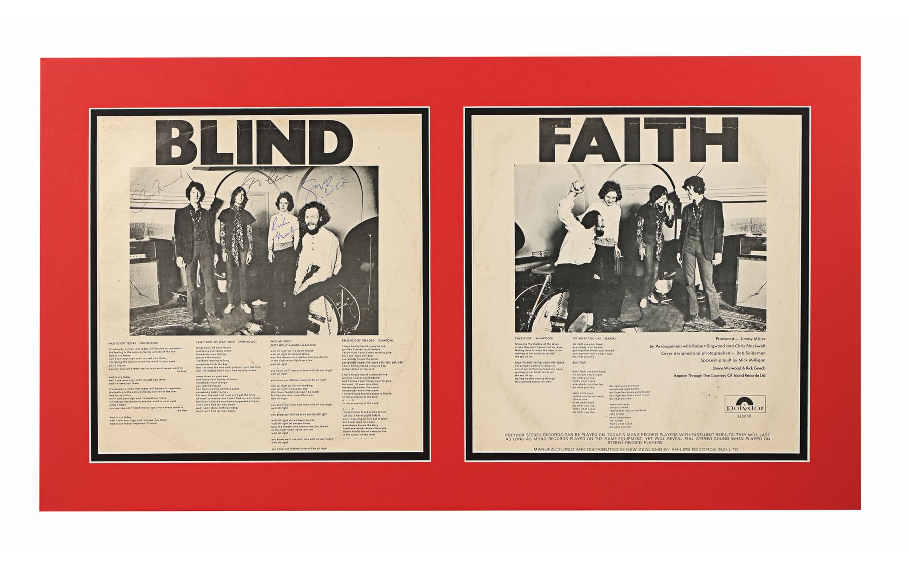 A album sleeve autographed by the members of rock supergroup Blind Faith. The self-titled album, which made it to No. 1 on the UK album charts, featured the musical talents of Steve Winwood, Eric Clapton, Ginger Baker and Ric Grech, all of whom have autographed the inside cover of the sleeve. The sleeve is mounted in a card display with the inside covers visible. Dimensions (display): 40 cm x 70 cm (15 3/4" x 27 1/2")