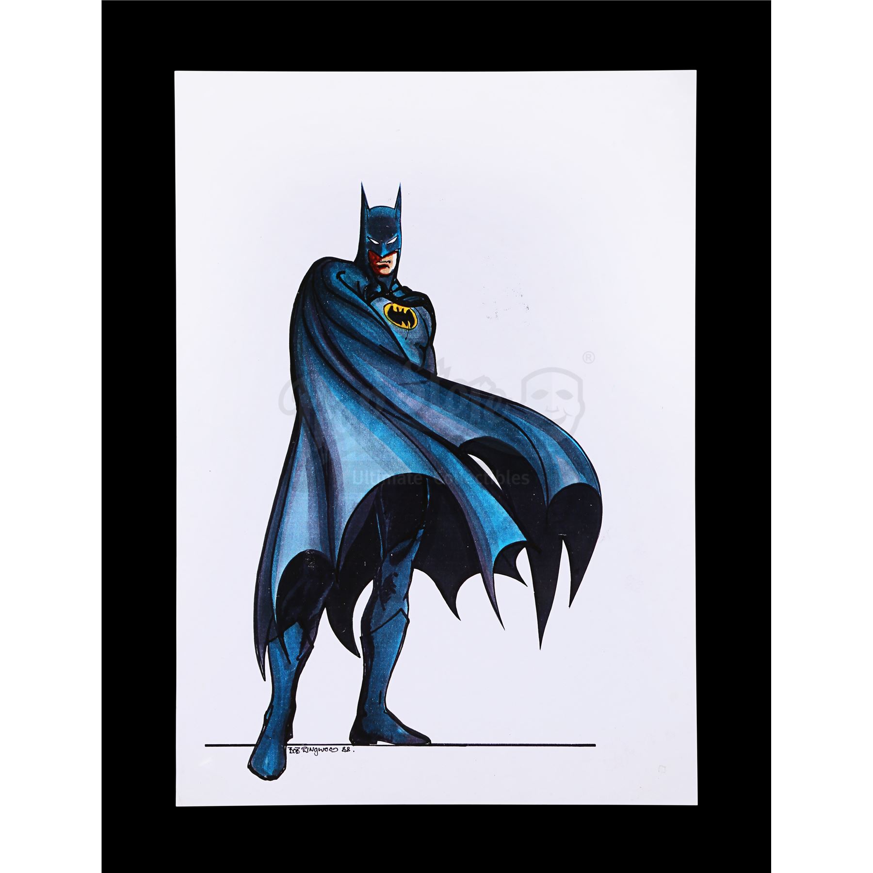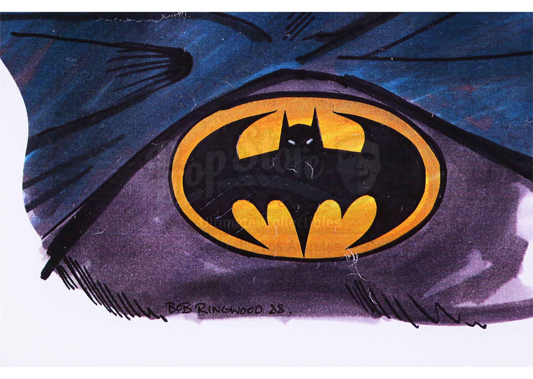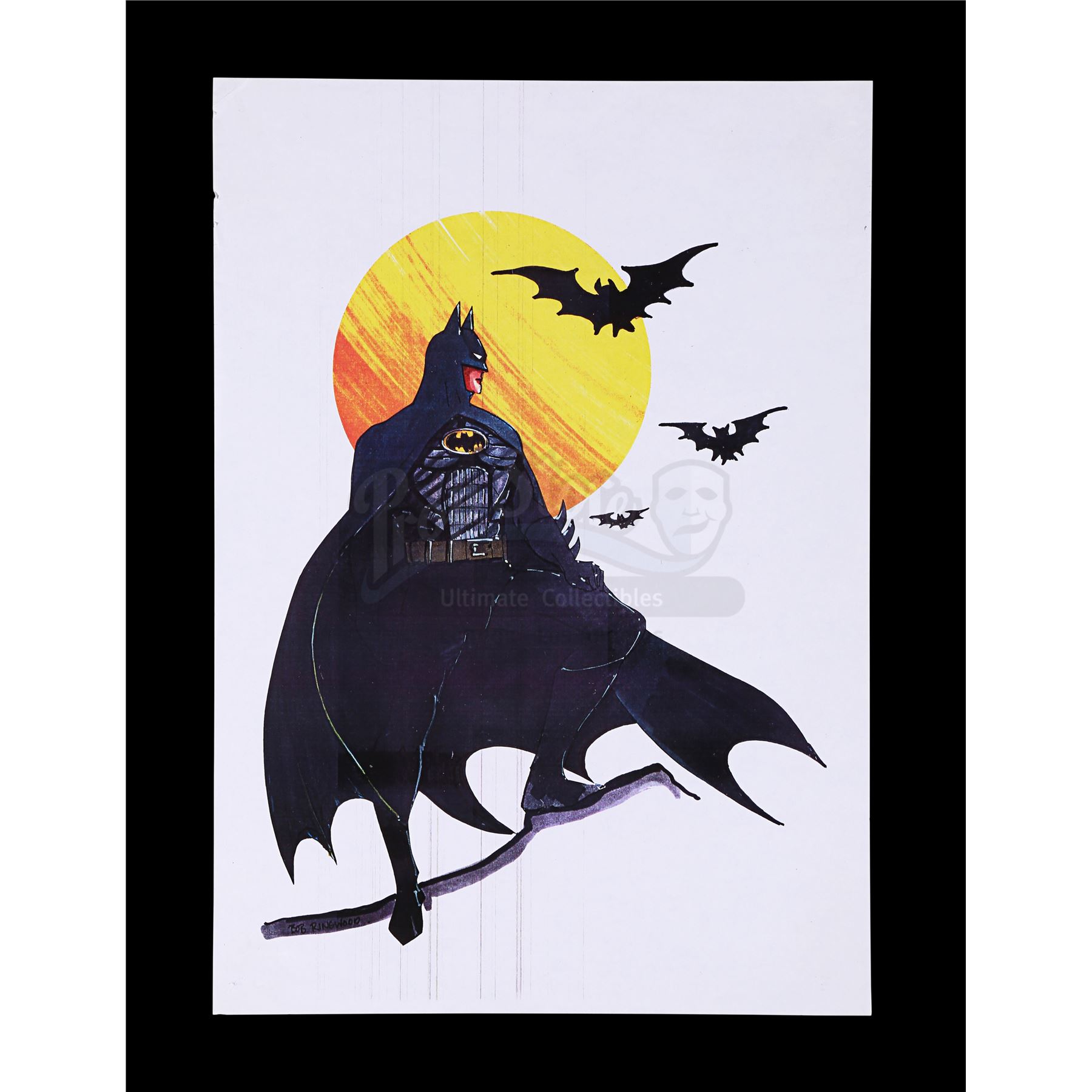This lot will be auctioned on Wednesday, June 30th. The auction will begin at 9:00am PDT and lots are sold sequentially via live auctioneer; tune in to the live streaming broadcast on auction day to follow the pace. Note other lots in the auction may close on June 29th or July 1st. Costume design prints for Batman (Michael Keaton) and The Joker (Jack Nicholson) from the production of Tim Burton's superhero film Batman. This lot was originally part of a Batman prop exhibition displayed at Harrods. The four prints by Academy Award-nominated costume designer Bob Ringwood include two Batman designs, a close-up of his cowl and chest, and an illustration of the Joker. They exhibit light edge wear, pinholes, and fold lines, but are in good overall condition. Dimensions: (largest) 16.5" x 11.5" (42 cm x 29.5 cm) Sold without copyright; see copyright notice in the Buyer's Guide. Estimate: $1,000 - 1,500