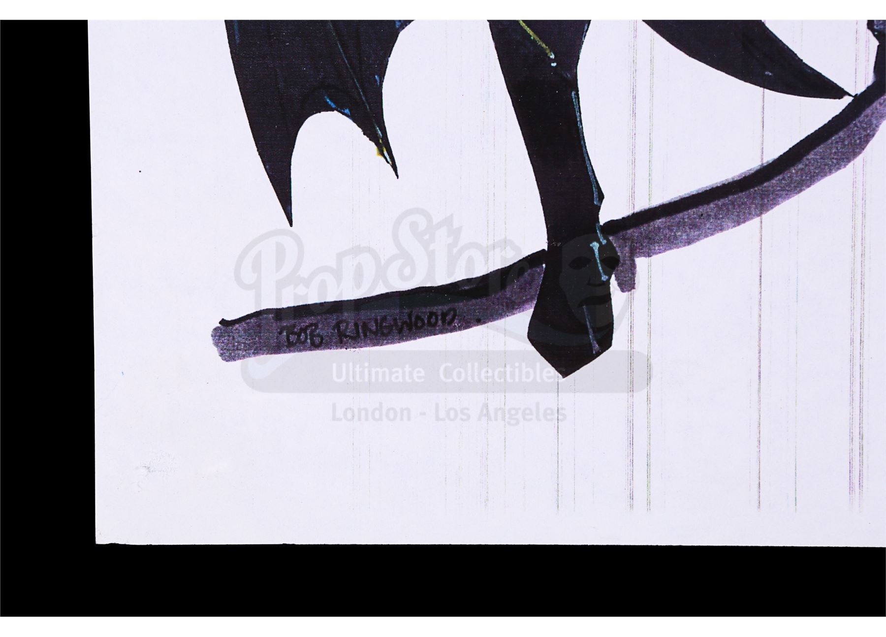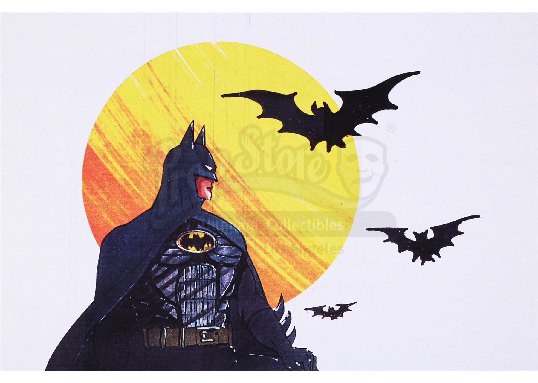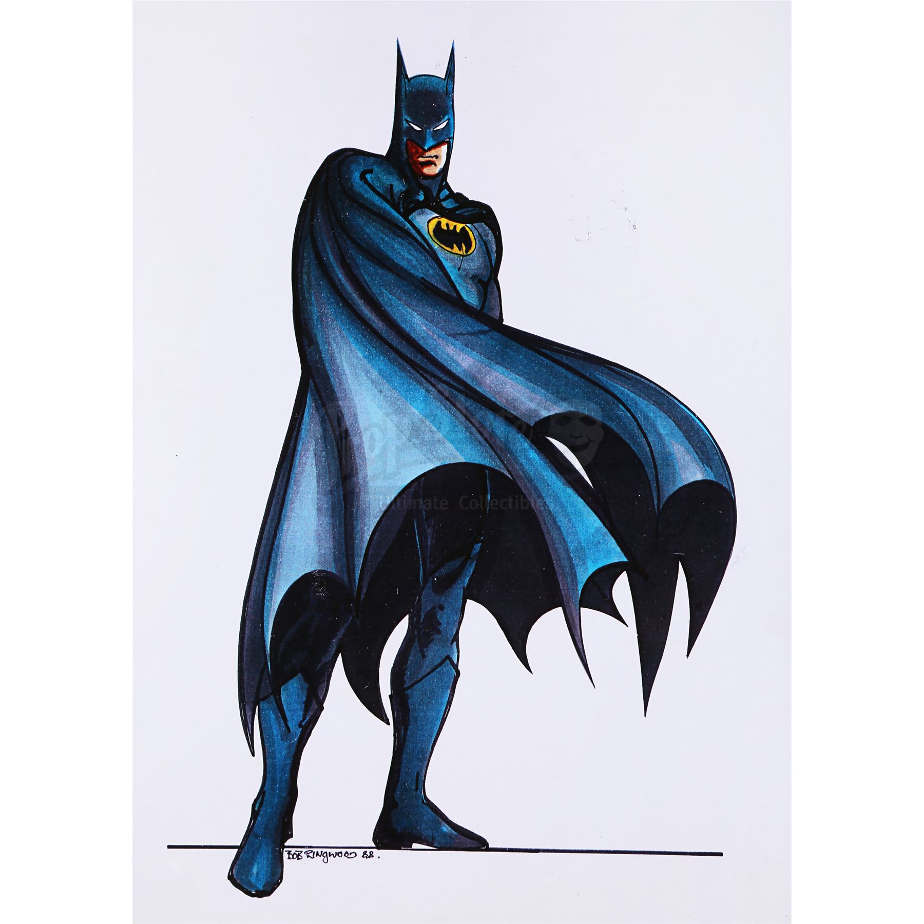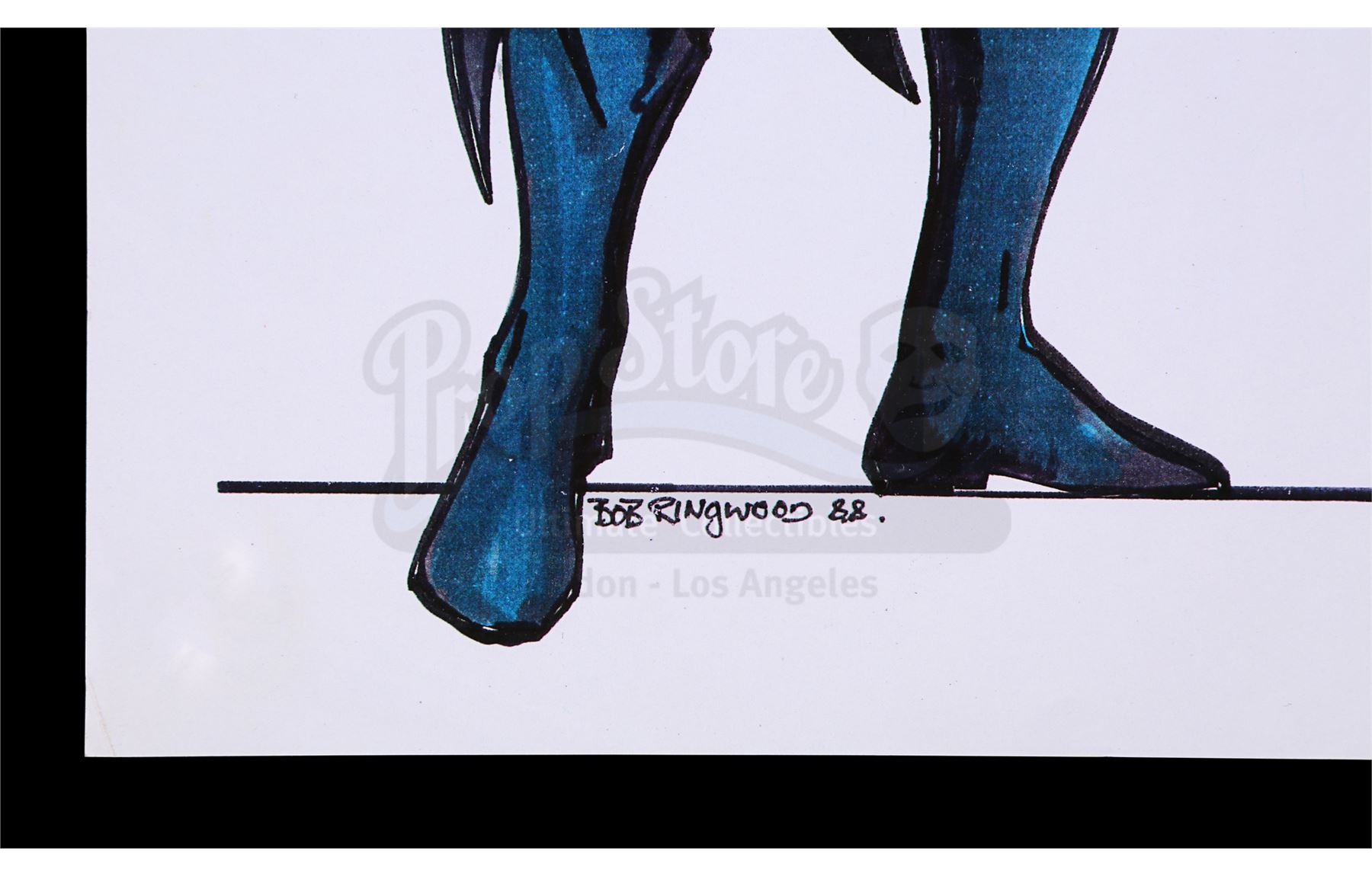 This lot will be auctioned on Wednesday, June 30th. The auction will begin at 9:00am PDT and lots are sold sequentially via live auctioneer; tune in to the live streaming broadcast on auction day to follow the pace. Note other lots in the auction may close on June 29th or July 1st. Costume design prints for Batman (Michael Keaton) and The Joker (Jack Nicholson) from the production of Tim Burton's superhero film Batman. This lot was originally part of a Batman prop exhibition displayed at Harrods. The four prints by Academy Award-nominated costume designer Bob Ringwood include two Batman designs, a close-up of his cowl and chest, and an illustration of the Joker. They exhibit light edge wear, pinholes, and fold lines, but are in good overall condition. Dimensions: (largest) 16.5" x 11.5" (42 cm x 29.5 cm) Sold without copyright; see copyright notice in the Buyer's Guide. Estimate: $1,000 - 1,500