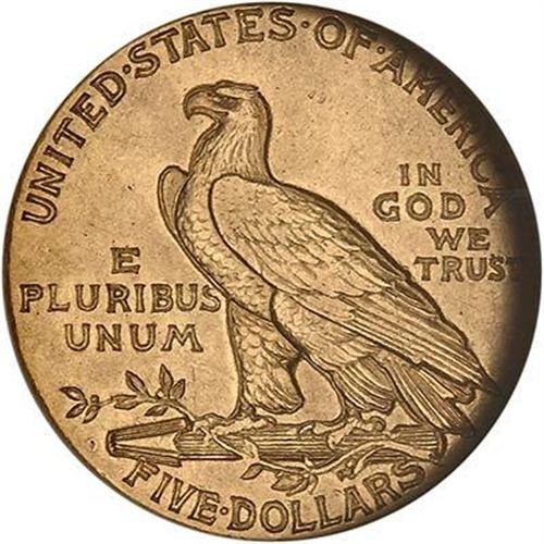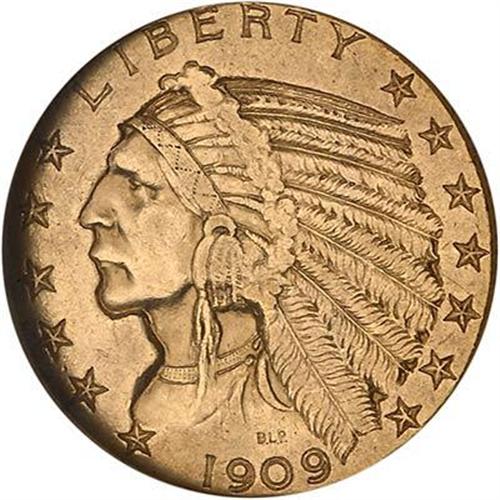 1909-O $5 Indian. Little luster left, and some faint reverse hairlining. Typically sharp for the issue with a plain, clear mintmark that no one will ever confuse with the more typically blobby "D" mintmark for 1909. It is unusual to find that the same year produced the most common date in the series (1909-D) as well as the most highly regarded rarity (1909-O). What a challenge it is for any collector to find a solidly graded, conservative specimen like the present coin. (#8515)