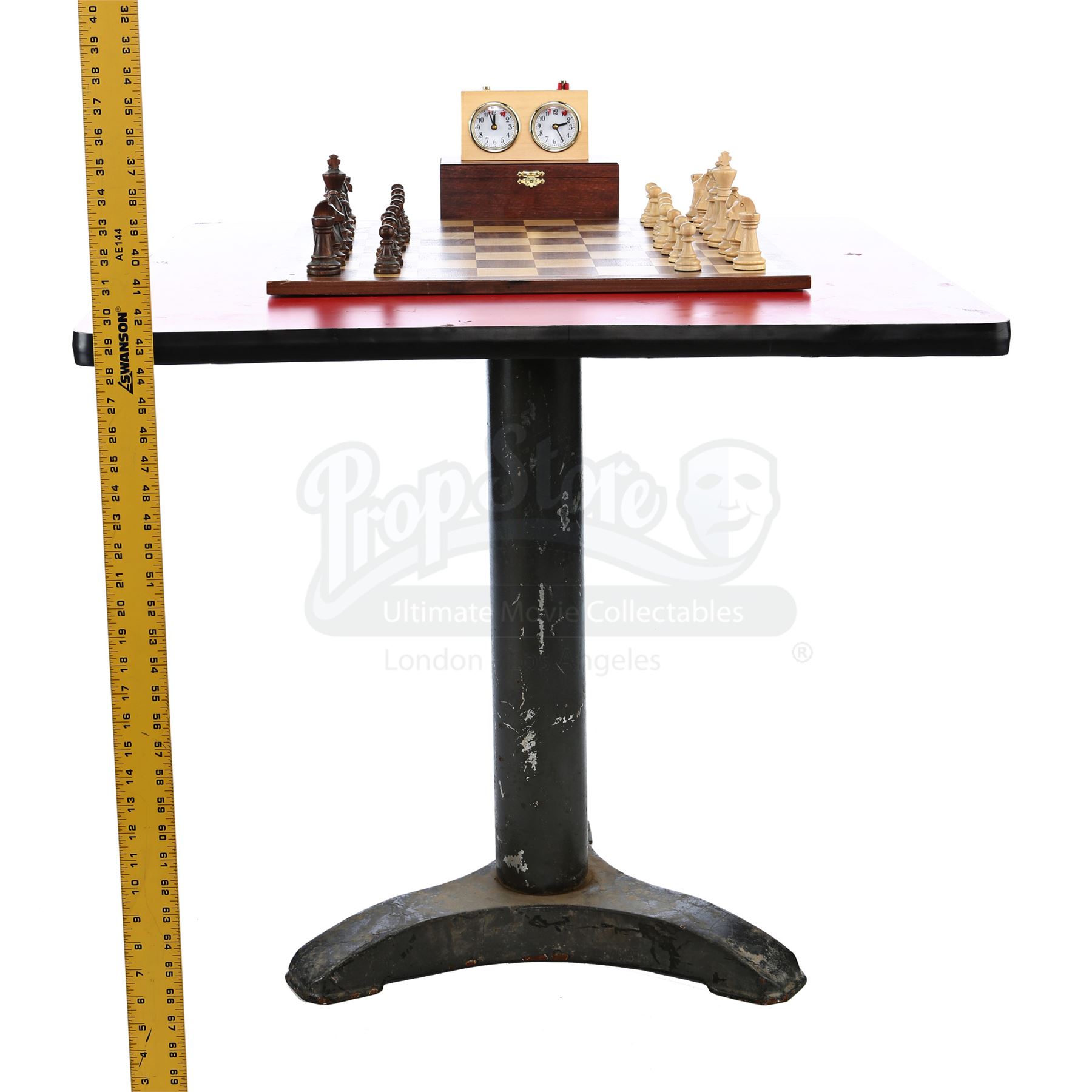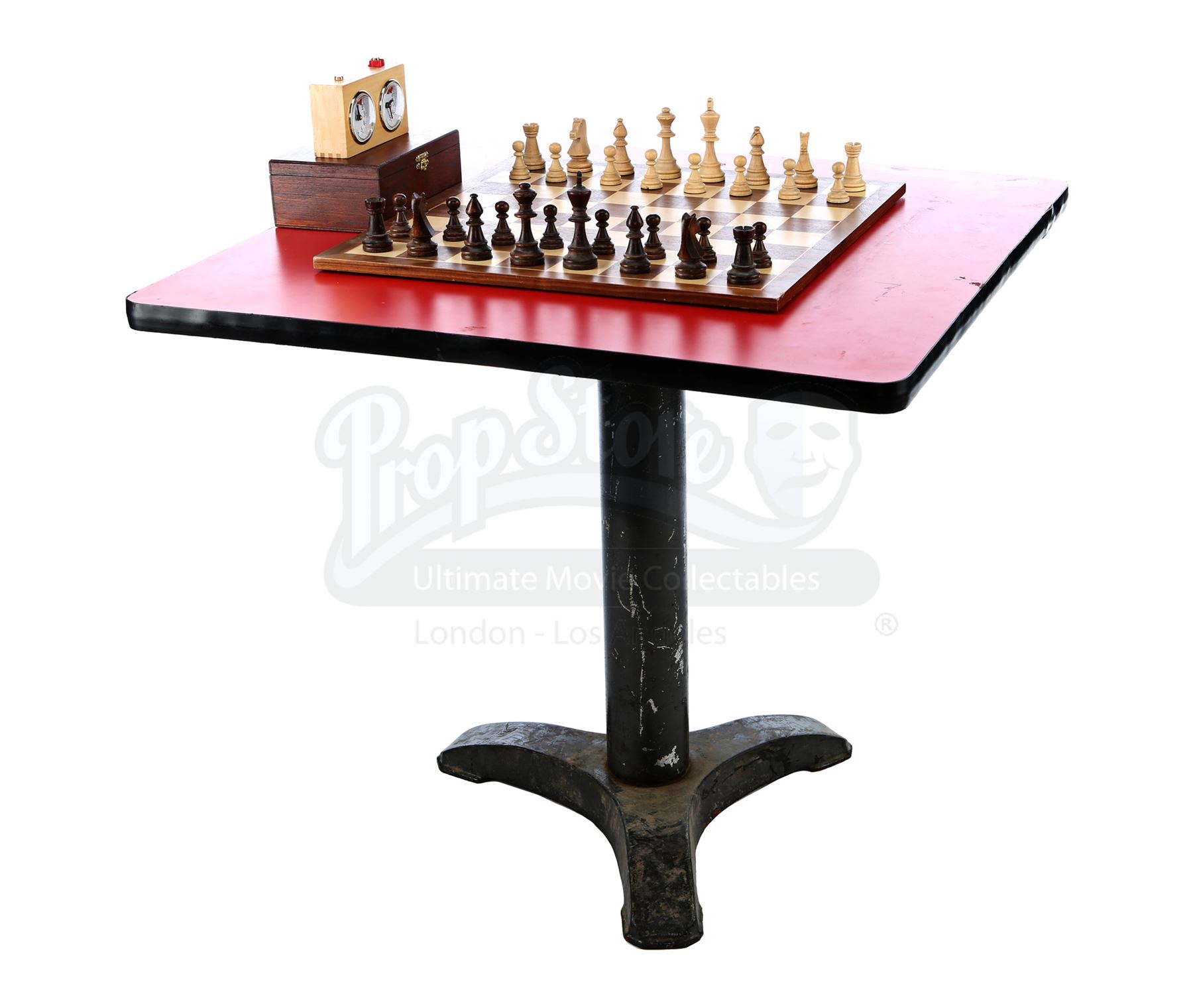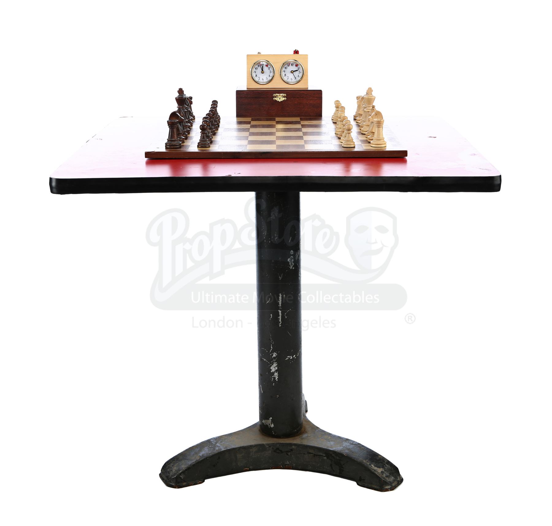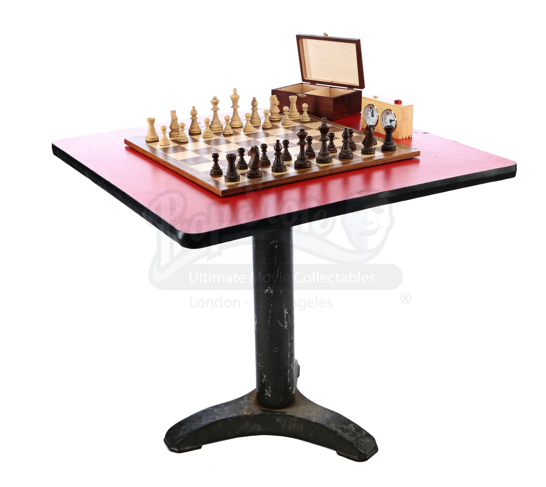 A barber shop chess set table from Seasons 1 and 2 of Marvel's Luke Cage. Bobby Fish plays at the chess table throughout the series, including with his friend Turk Barrett, another regular at Pop's. This lot consists of a wooden chess board labeled ‘Pop’s Location’ underneath, a wooden box containing 32 individual brown and white wooden chess pieces with green felted bottoms, a wood, plastic, and metal chess timer with two clock faces, and a red and black wood, metal, and plastic table. They are in good overall condition with some signs of wear, including beverage stains on the table made by production.