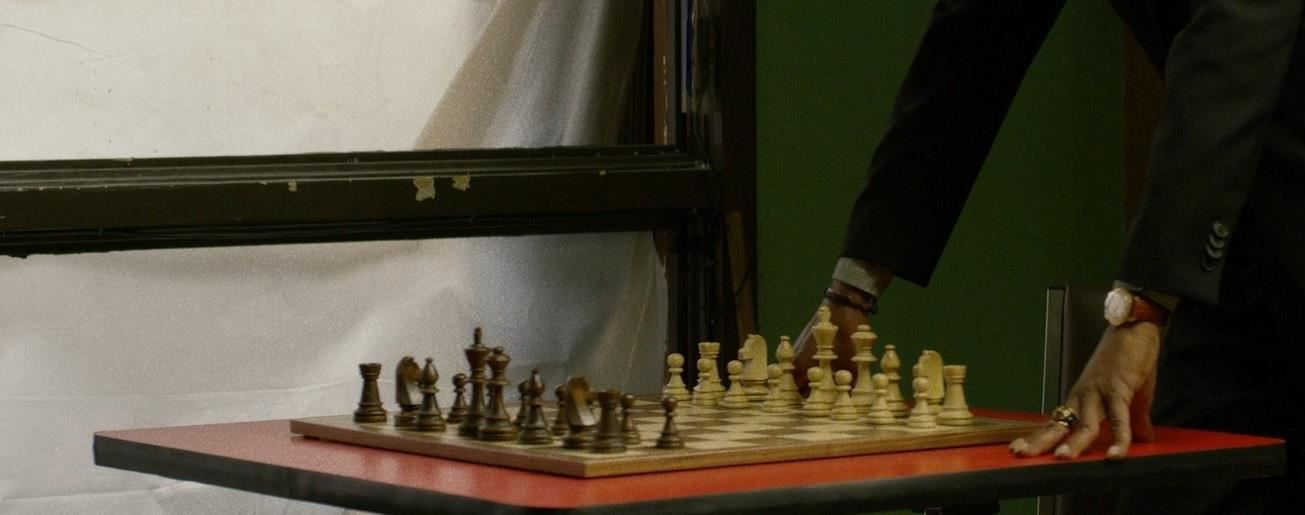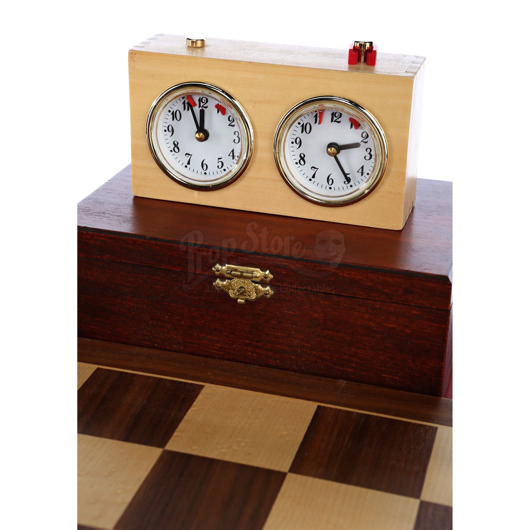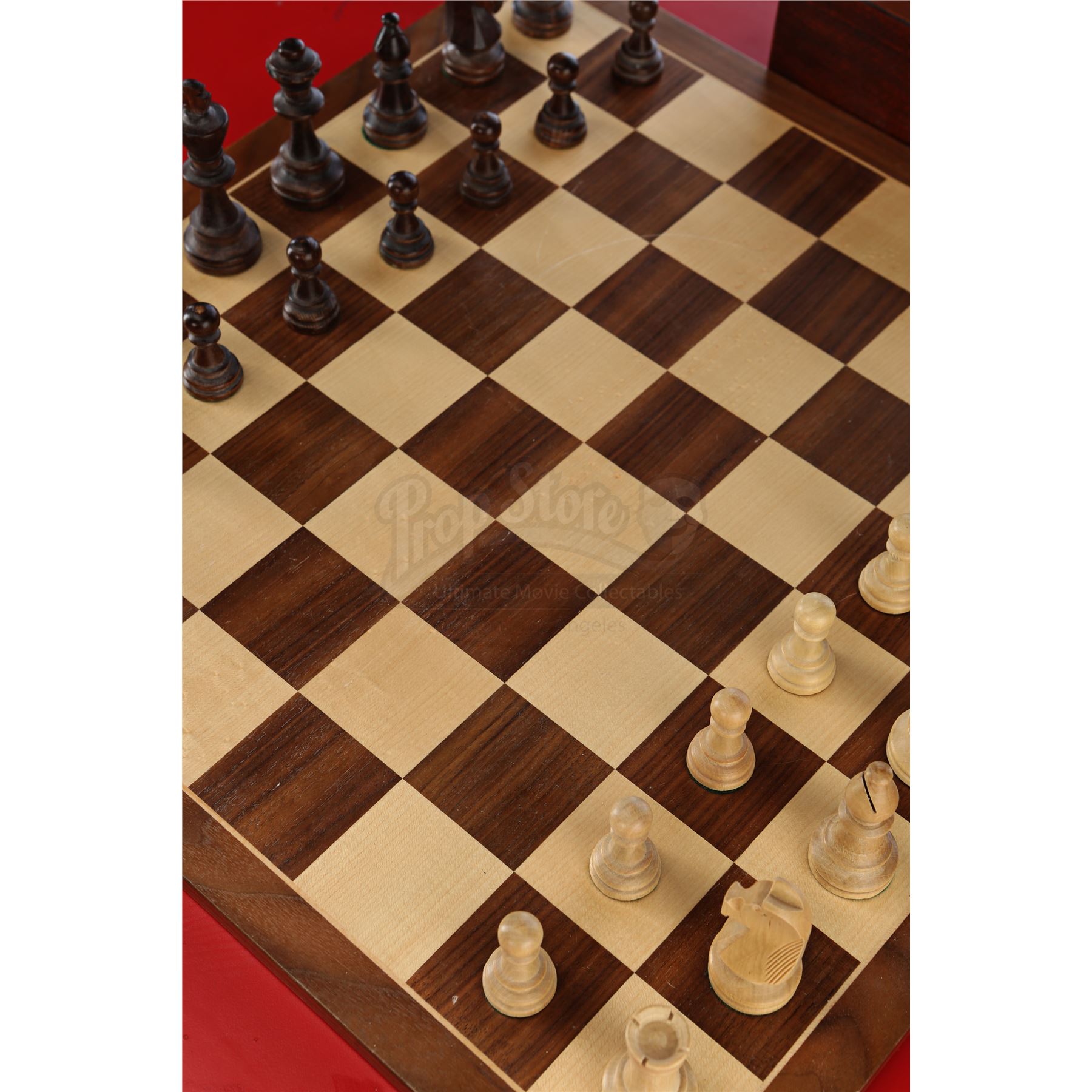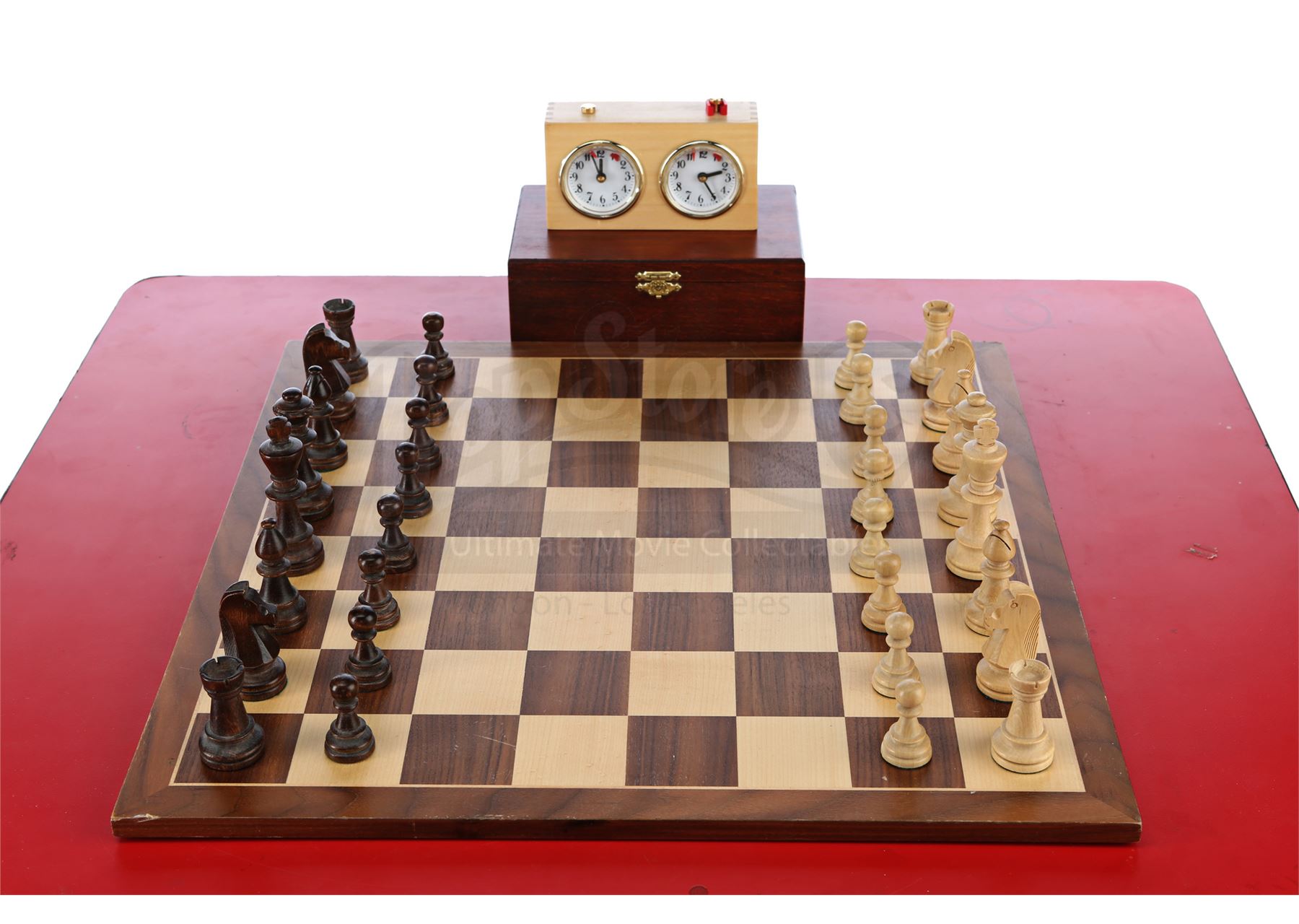 A barber shop chess set table from Seasons 1 and 2 of Marvel's Luke Cage. Bobby Fish plays at the chess table throughout the series, including with his friend Turk Barrett, another regular at Pop's. This lot consists of a wooden chess board labeled ‘Pop’s Location’ underneath, a wooden box containing 32 individual brown and white wooden chess pieces with green felted bottoms, a wood, plastic, and metal chess timer with two clock faces, and a red and black wood, metal, and plastic table. They are in good overall condition with some signs of wear, including beverage stains on the table made by production.