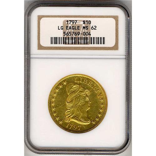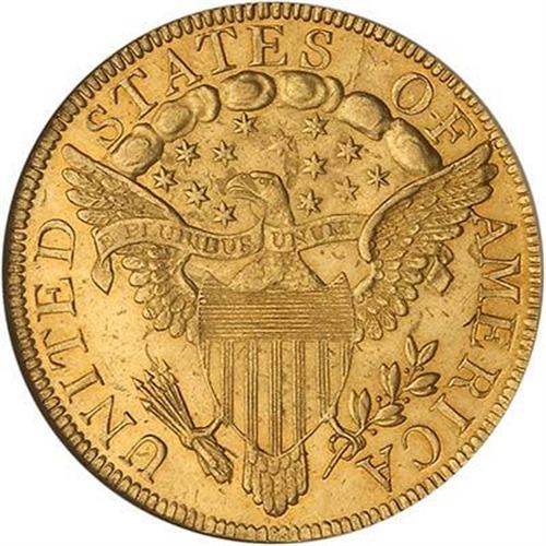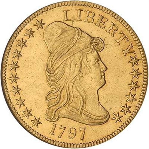 1797 $10 Capped Bust. Large eagle. When the quarter eagle went into production for the first time, in 1796, it bore the same obverse as on the eagle and half eagle, but a new reverse, generally known as the heraldic eagle.