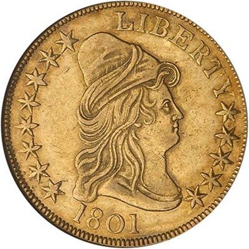 1801 $10 Capped Bust. A lustrous and well preserved toned example of this later issue, with rims very choice and the hair standing out in strong relief. Liberty's drapery is also well detailed on this high grade example. A coin that should attract a lot of attention from bidders. (#8564)
