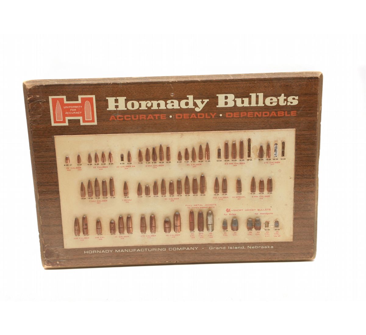 Wood counter or wall Hornady Bullet display board - hard to find display with Short Jacket bullets - 60 bullets from .22 caliber to .45 caliber (missing 7 bullets) - shows wear to wood grain & edges - counter stand missing from back - 18" x 11.5" - non-ffl - 25VVFKIL038
