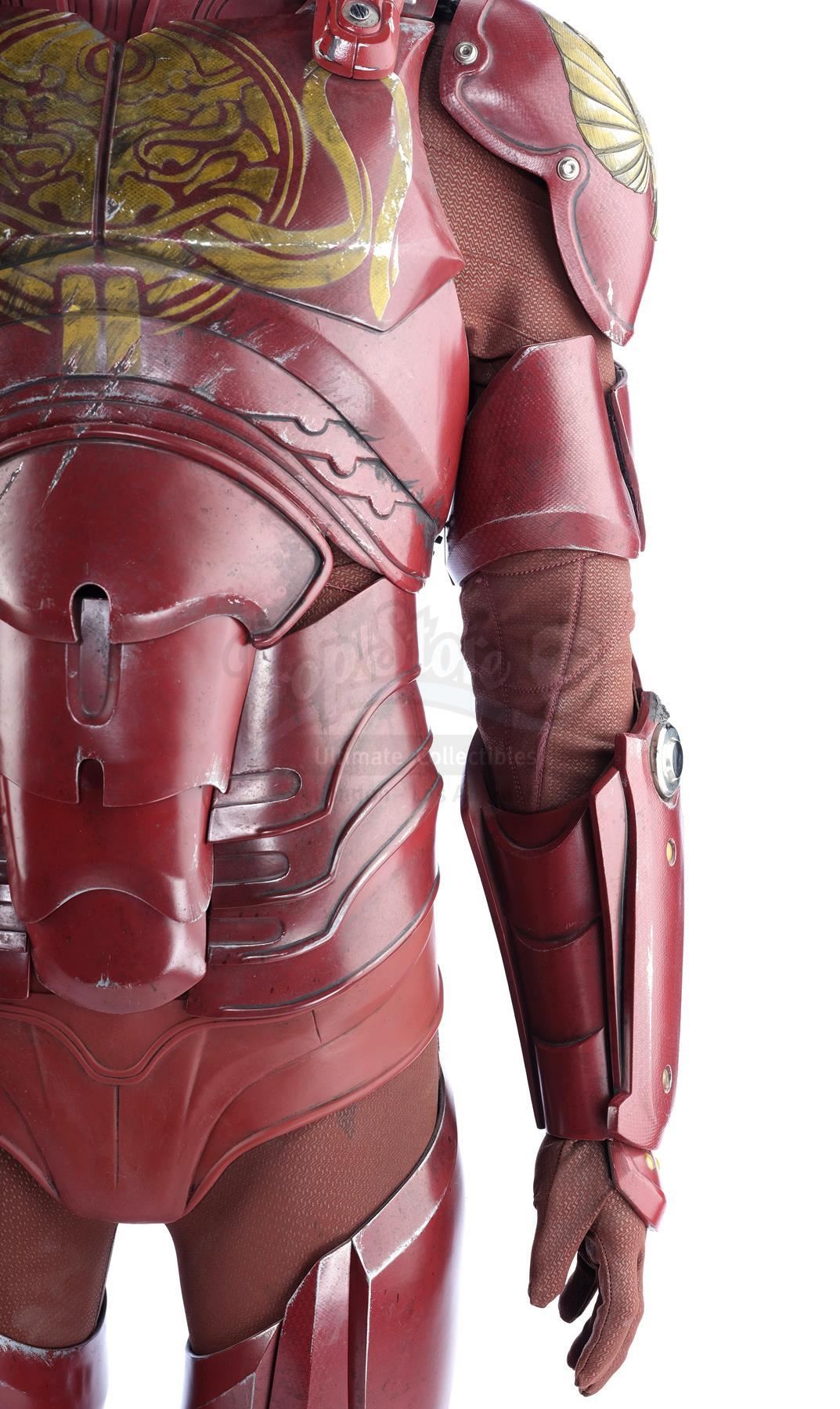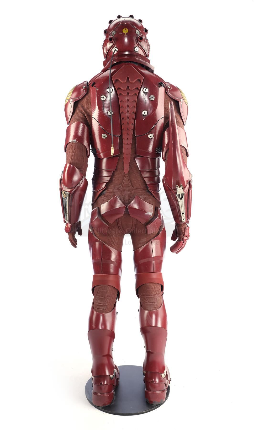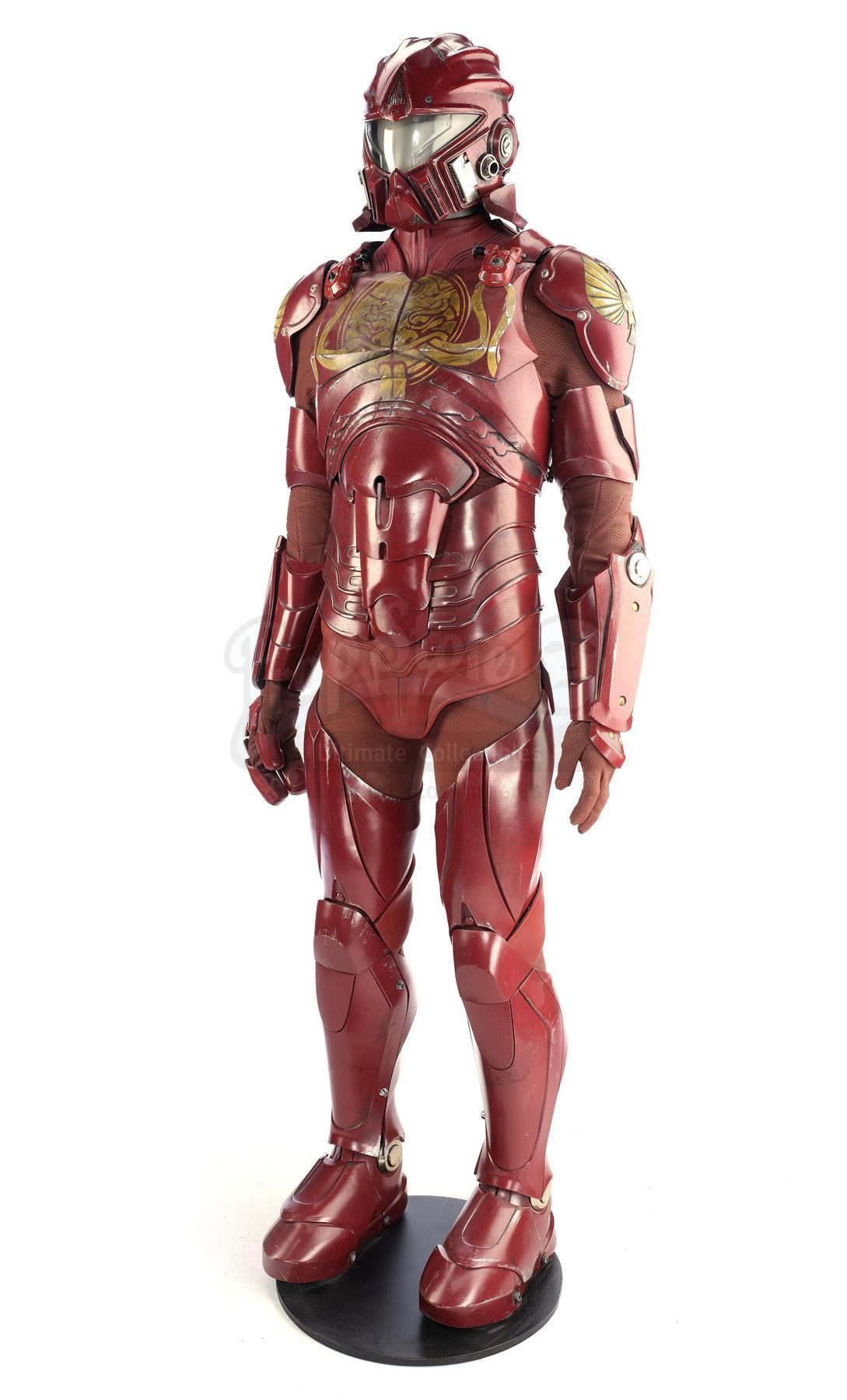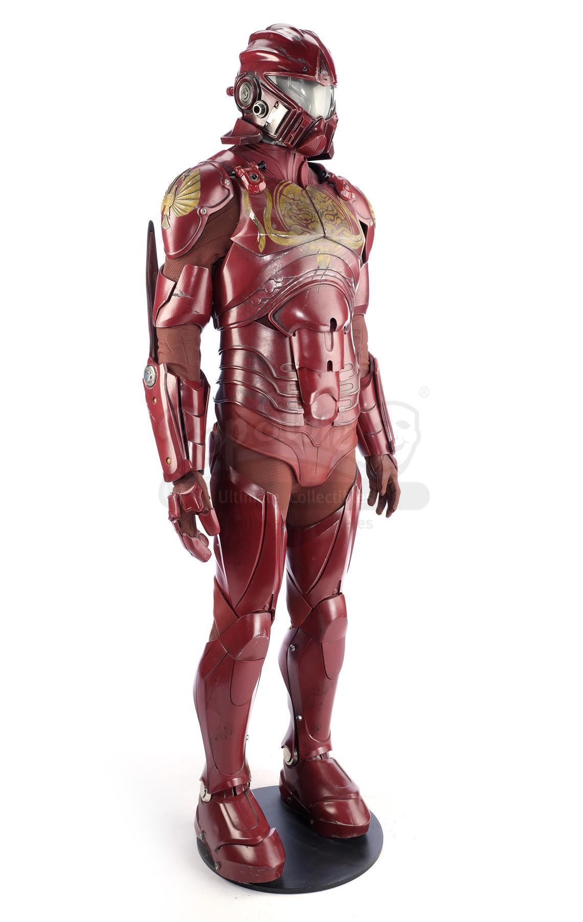 Created by Legacy Effects for the film, this zip-back drivesuit features urethane armor affixed with a fabric bodysuit and rubber neck, spine, and codpieces for mobility. The gloves are constructed of Spandex with urethane covers, while the boots are sneakers encased in a urethane shell. The suit is painted dark red with a goldtone dragon logo on the chest and the Pan Pacific Defense Corps (PPDC) symbol on both shoulders and lined with lights, albeit no longer connected to a power source.