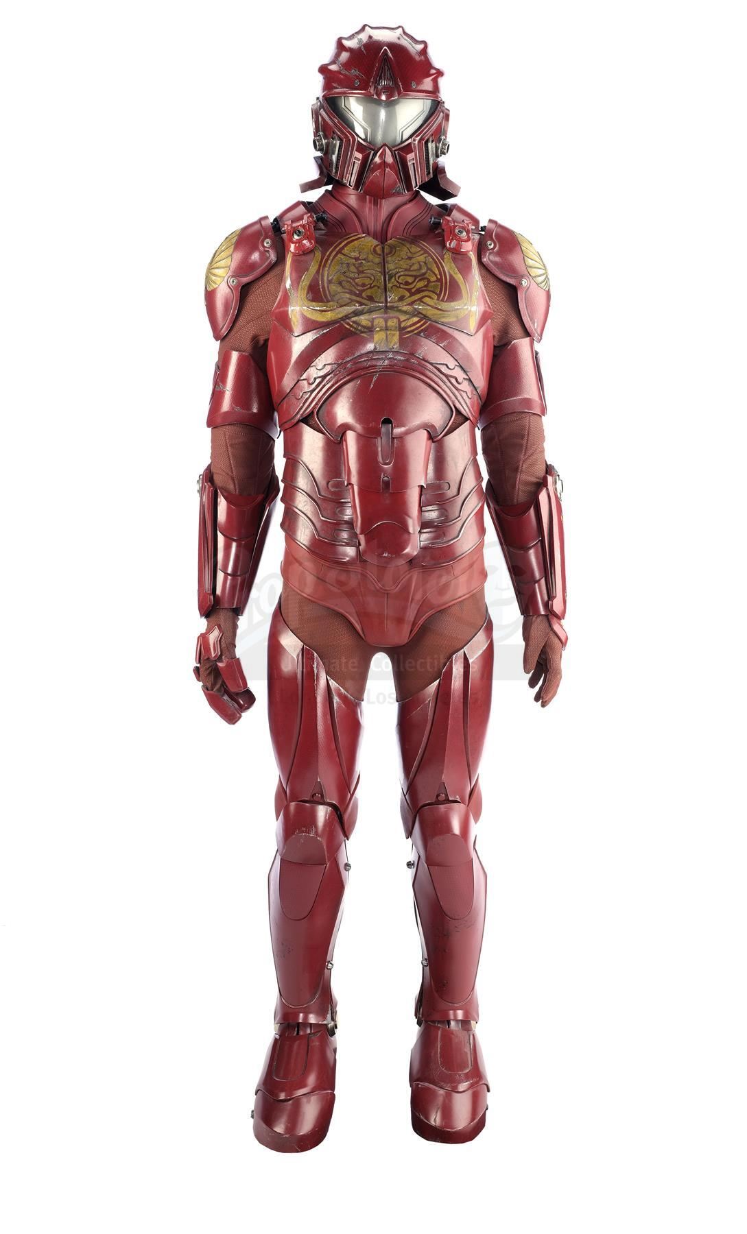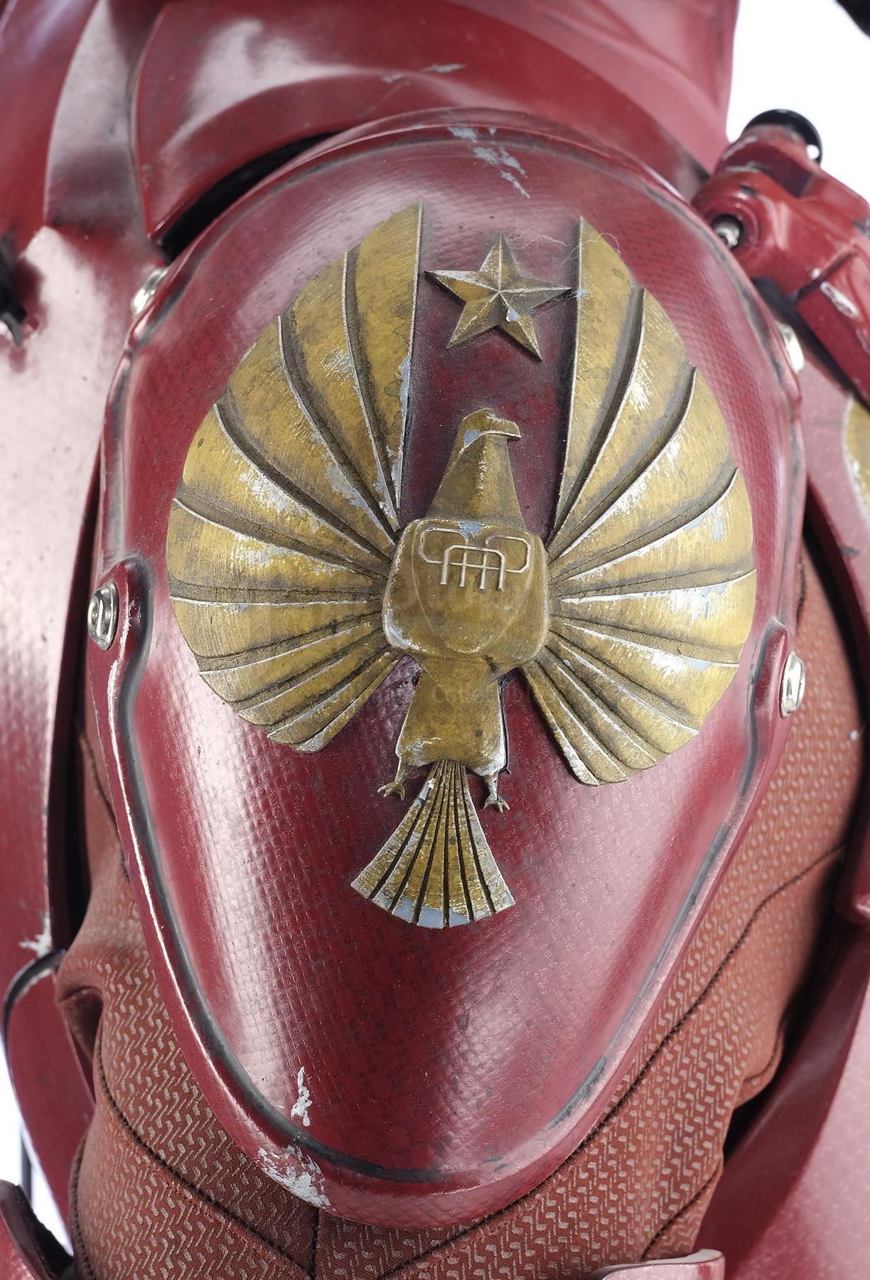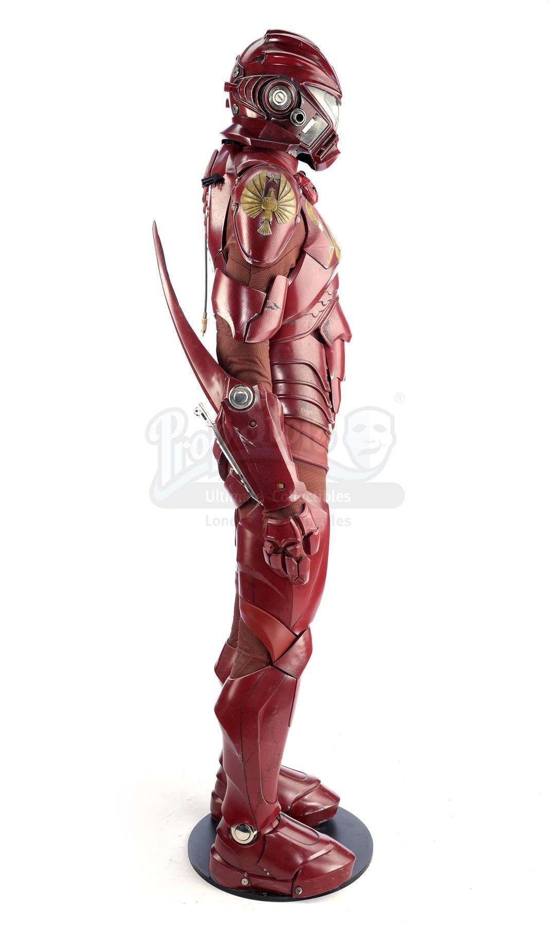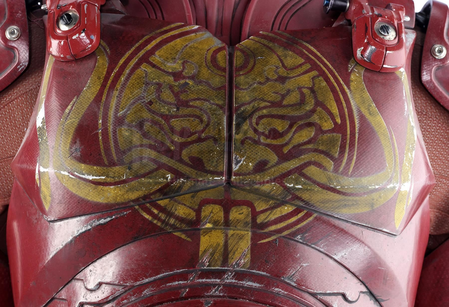 Created by Legacy Effects for the film, this zip-back drivesuit features urethane armor affixed with a fabric bodysuit and rubber neck, spine, and codpieces for mobility. The gloves are constructed of Spandex with urethane covers, while the boots are sneakers encased in a urethane shell. The suit is painted dark red with a goldtone dragon logo on the chest and the Pan Pacific Defense Corps (PPDC) symbol on both shoulders and lined with lights, albeit no longer connected to a power source.