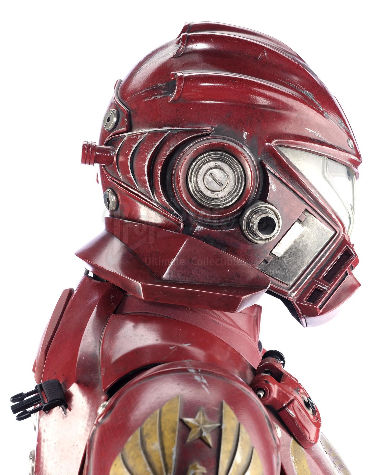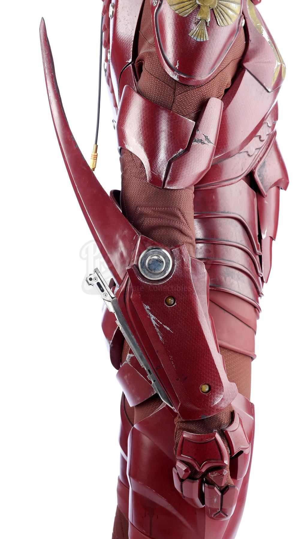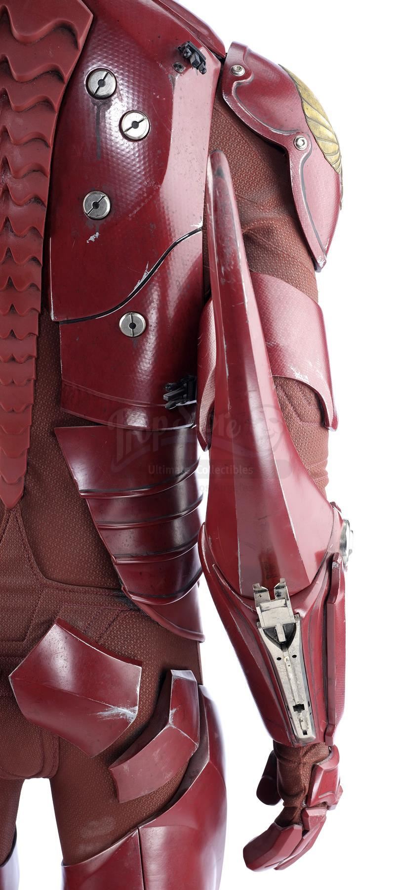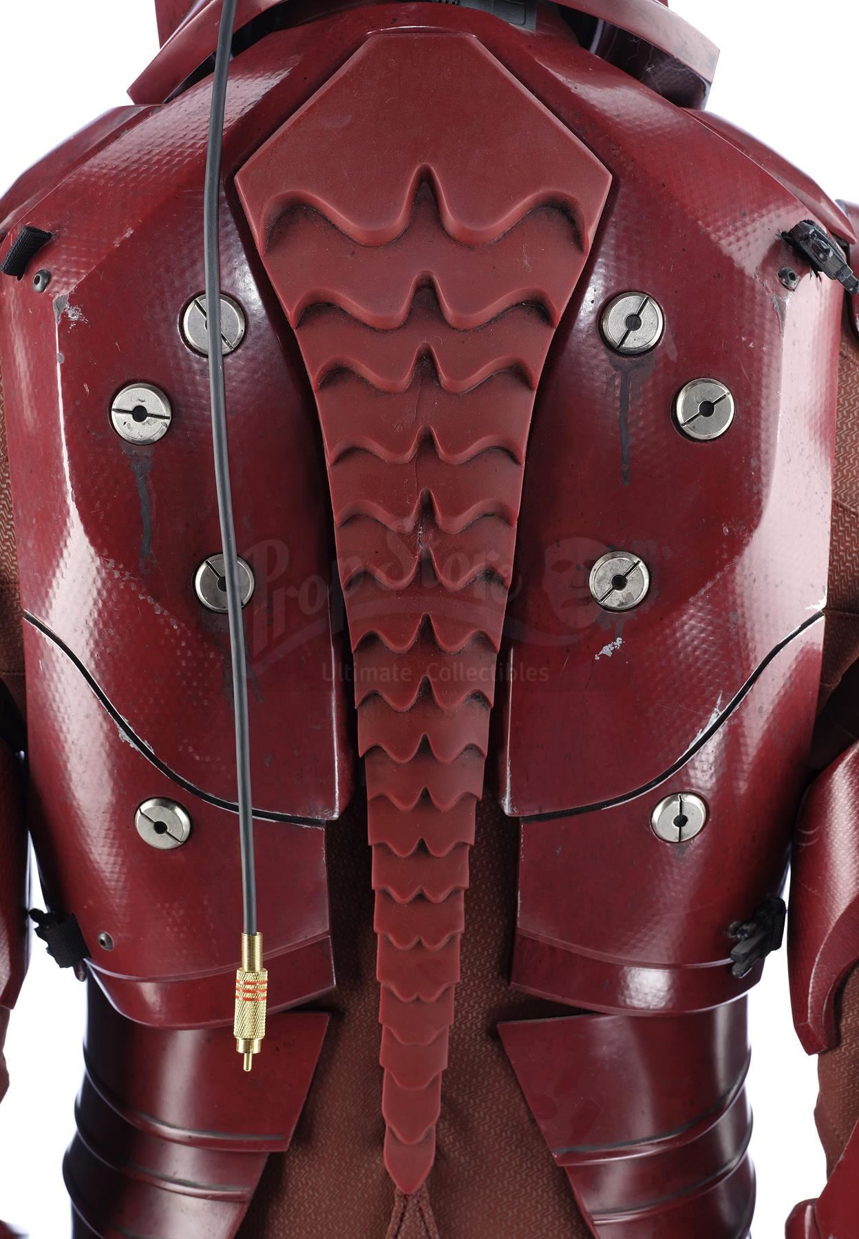 Created by Legacy Effects for the film, this zip-back drivesuit features urethane armor affixed with a fabric bodysuit and rubber neck, spine, and codpieces for mobility. The gloves are constructed of Spandex with urethane covers, while the boots are sneakers encased in a urethane shell. The suit is painted dark red with a goldtone dragon logo on the chest and the Pan Pacific Defense Corps (PPDC) symbol on both shoulders and lined with lights, albeit no longer connected to a power source.