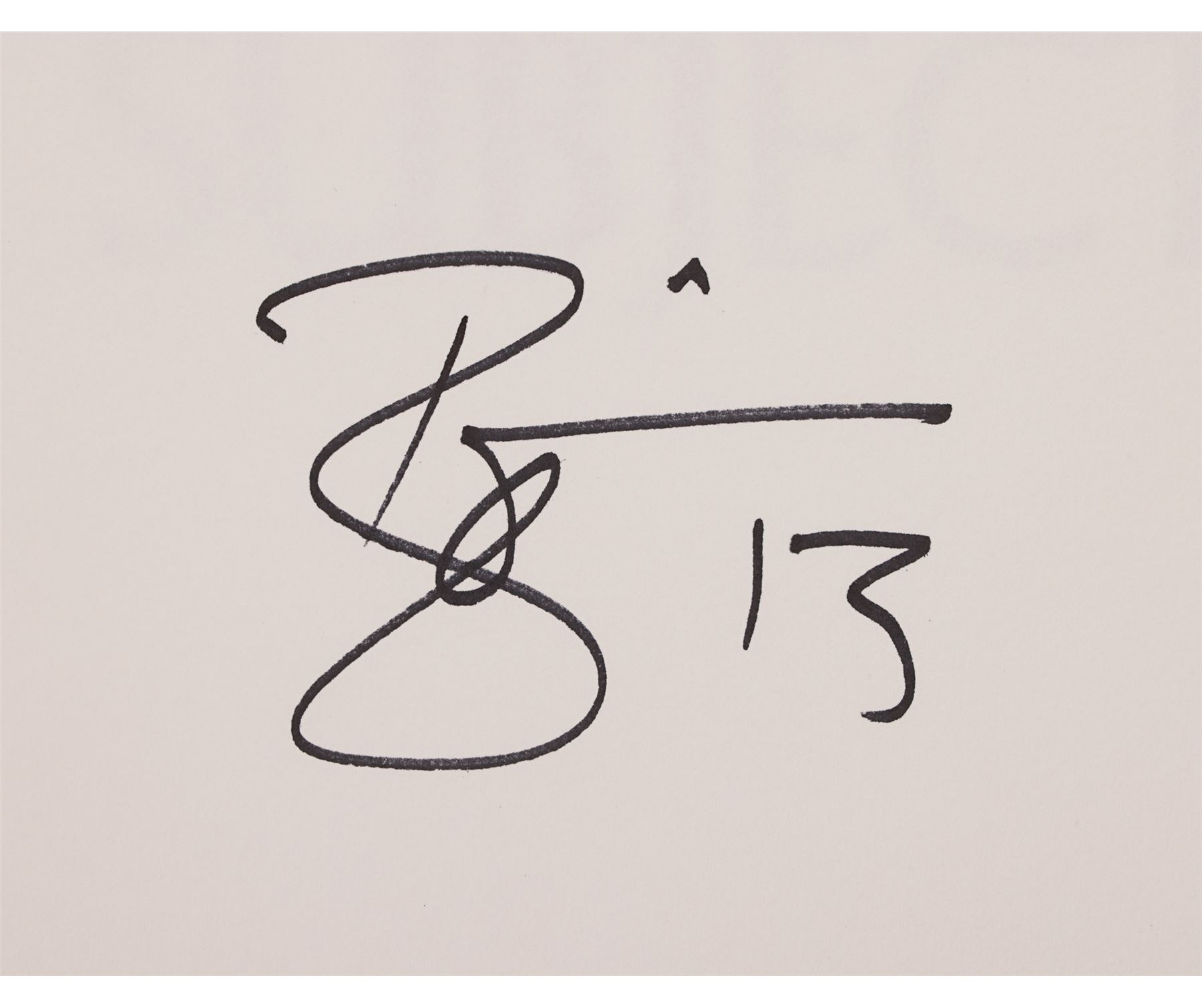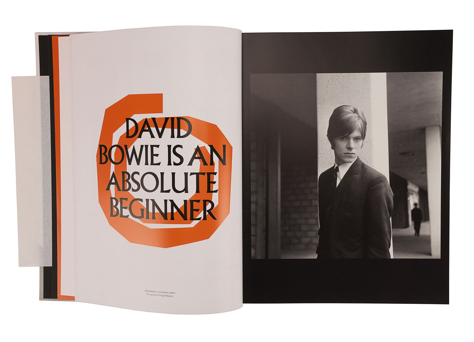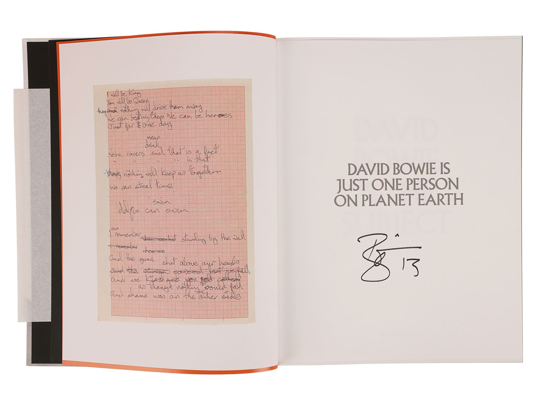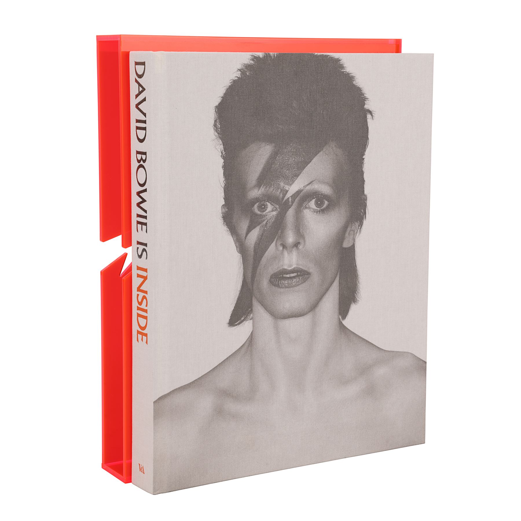 The title page is autographed in black ink by Bowie, and dated "13". The book comes with a neon orange acrylic slipcase featuring laser-cut detailing, as well as its original box. The case displays some light surface scratching, and the box displays signs of wear. Dimensions (book in case): 33 cm x 25.5 cm x 4.5 cm (13" x 10" x 1 3/4")