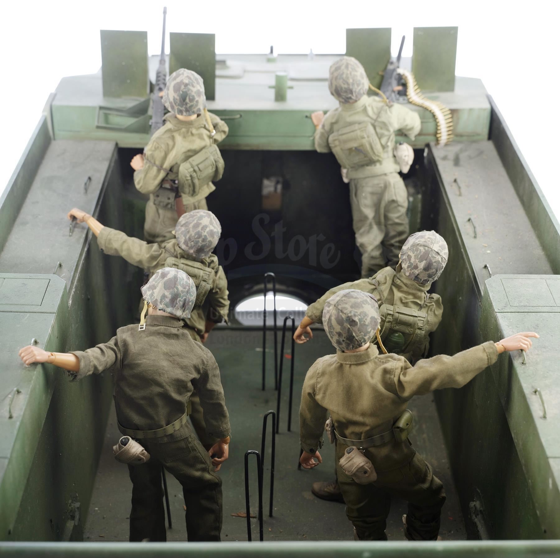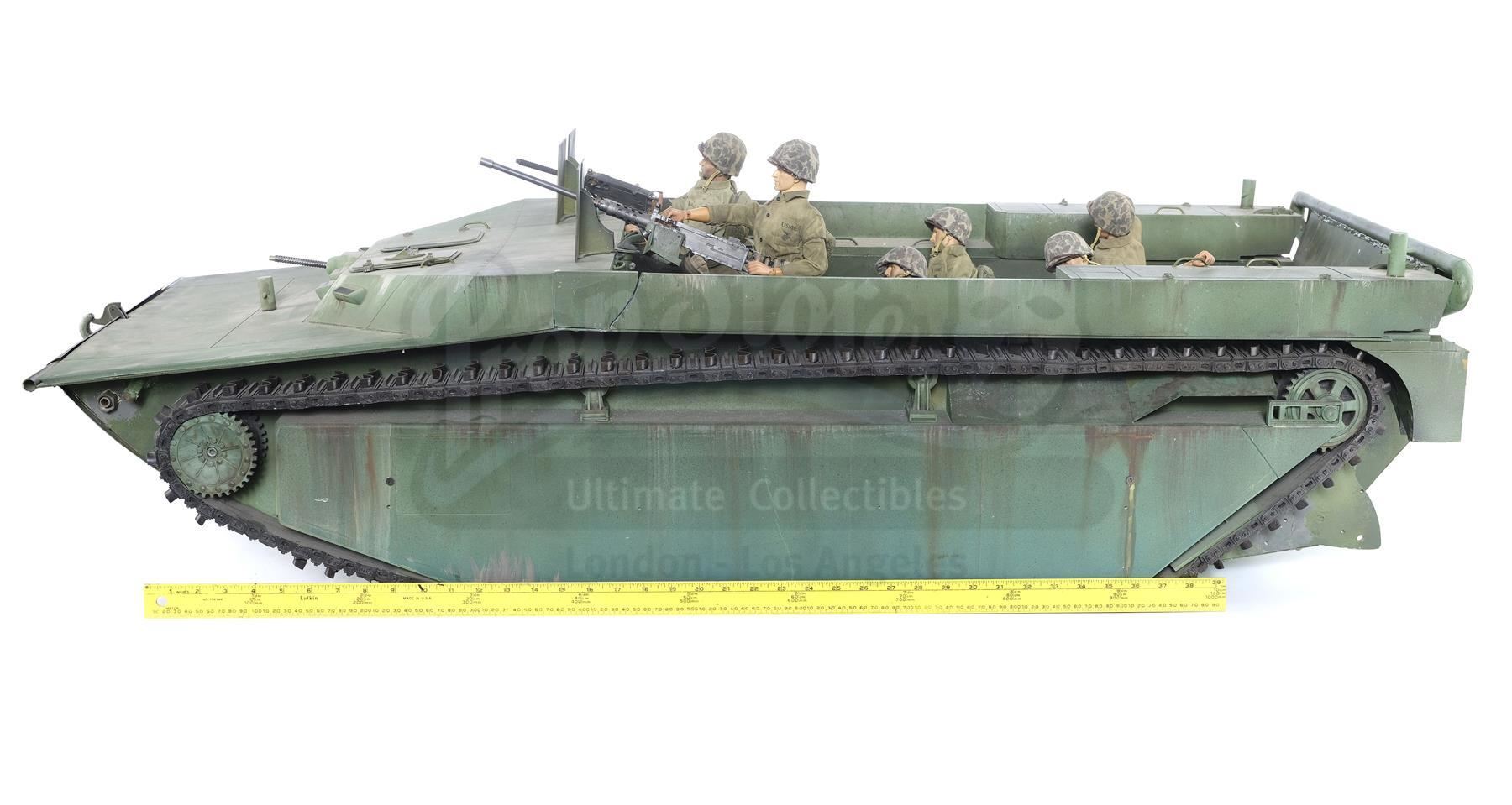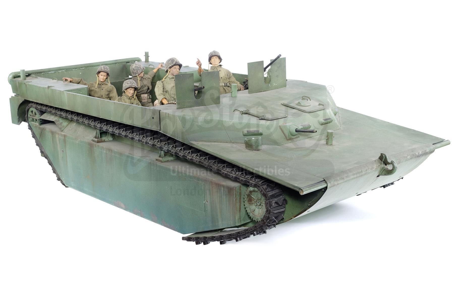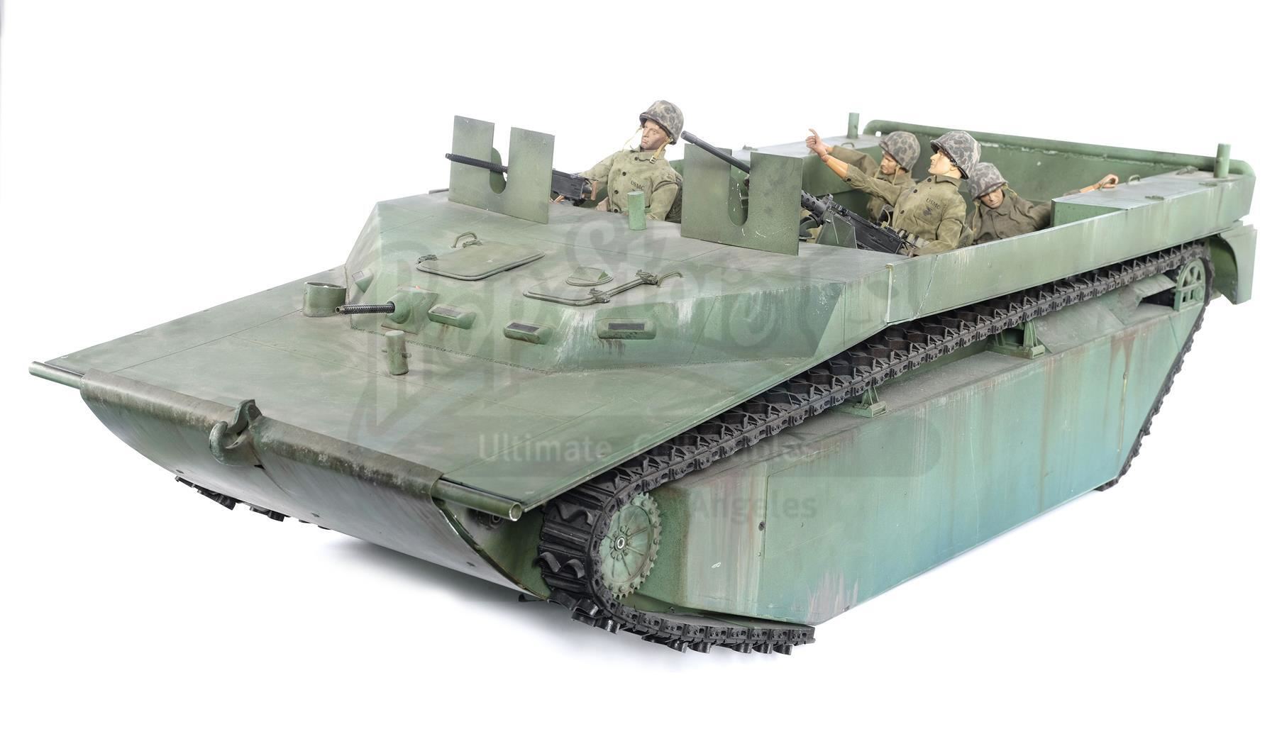 An Amphtrack model miniature with soldier figures from the production of the Emmy Award-winning television mini-series The Pacific. In the episode "Gloucester/Pavuvu/Banika" (104), an amphibious vehicle submerged underwater exploded, and sent members of the United States Marine Corps flying. This miniature version of the Amphtrack vehicle was custom-built for the explosion sequence.