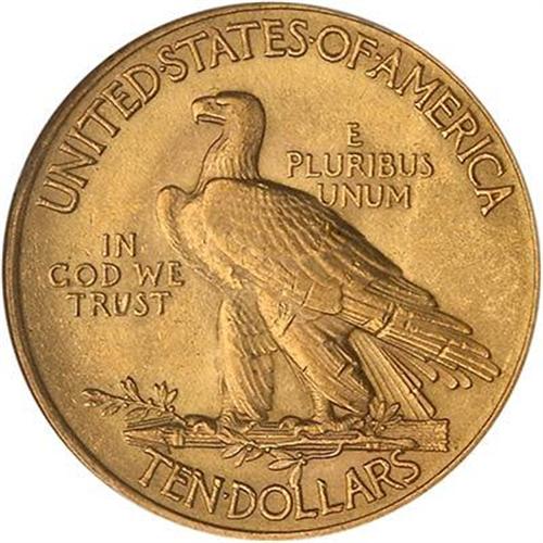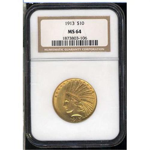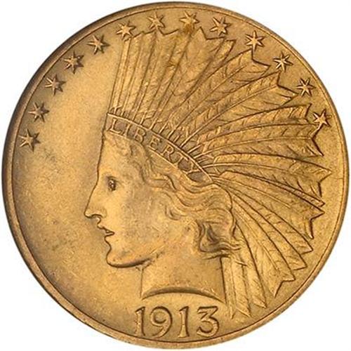 1913 $10 Indian. Both sides are soaked in in copper-gold iridescence that accents the ample remaining luster. A better than average impression was left by the recoil of the dies that struck this 1913 Indian ten. (#8873)