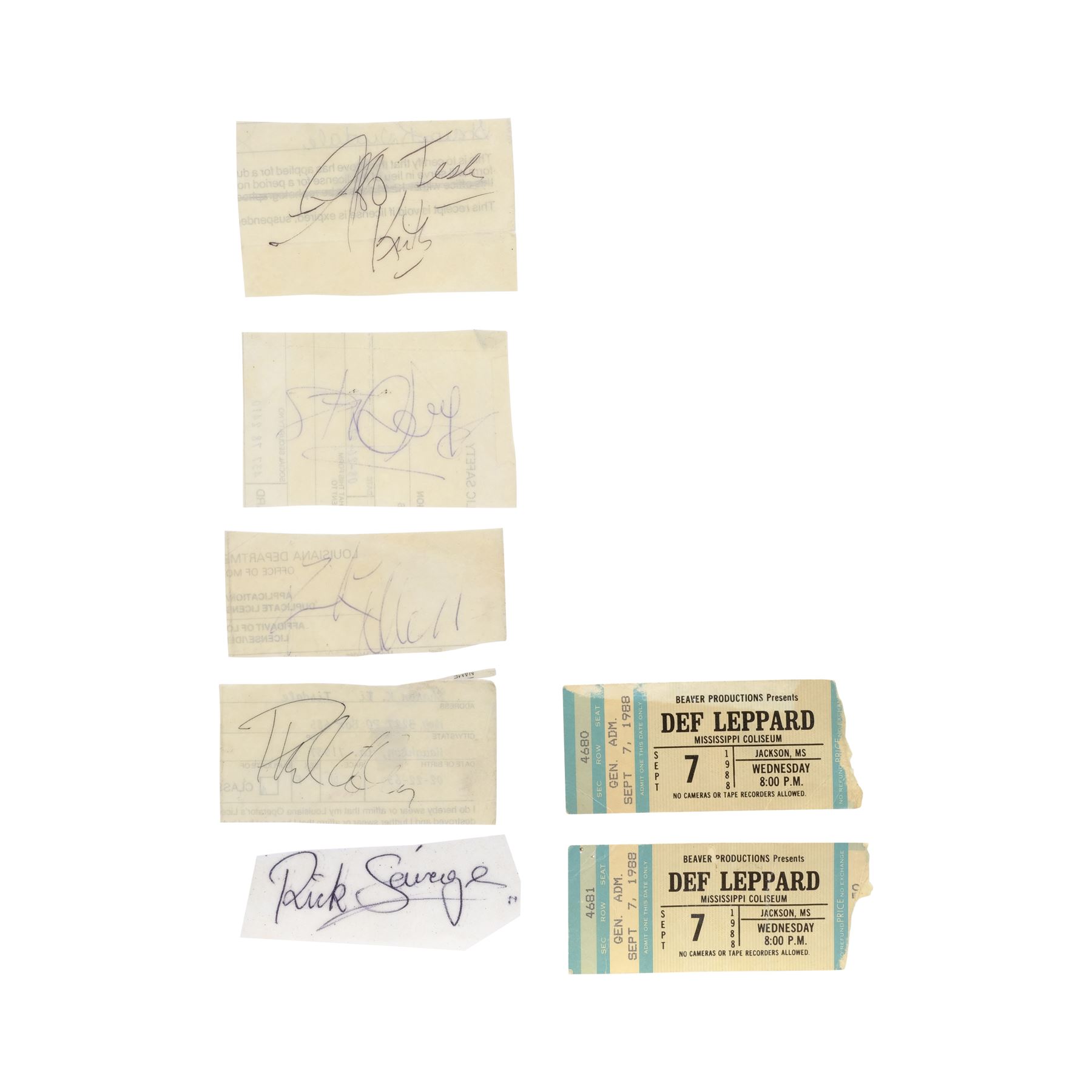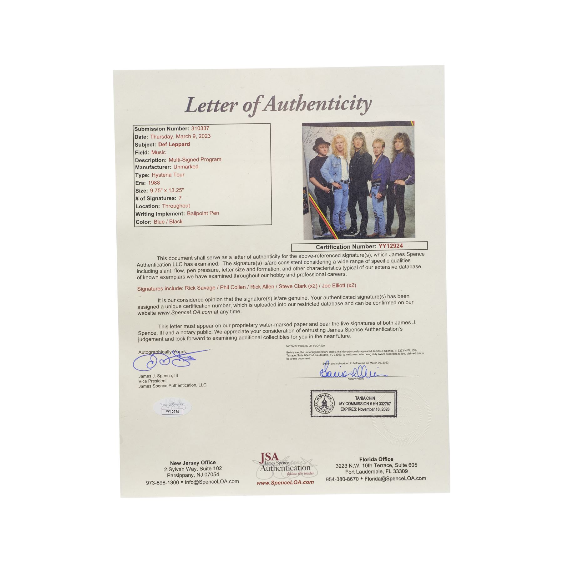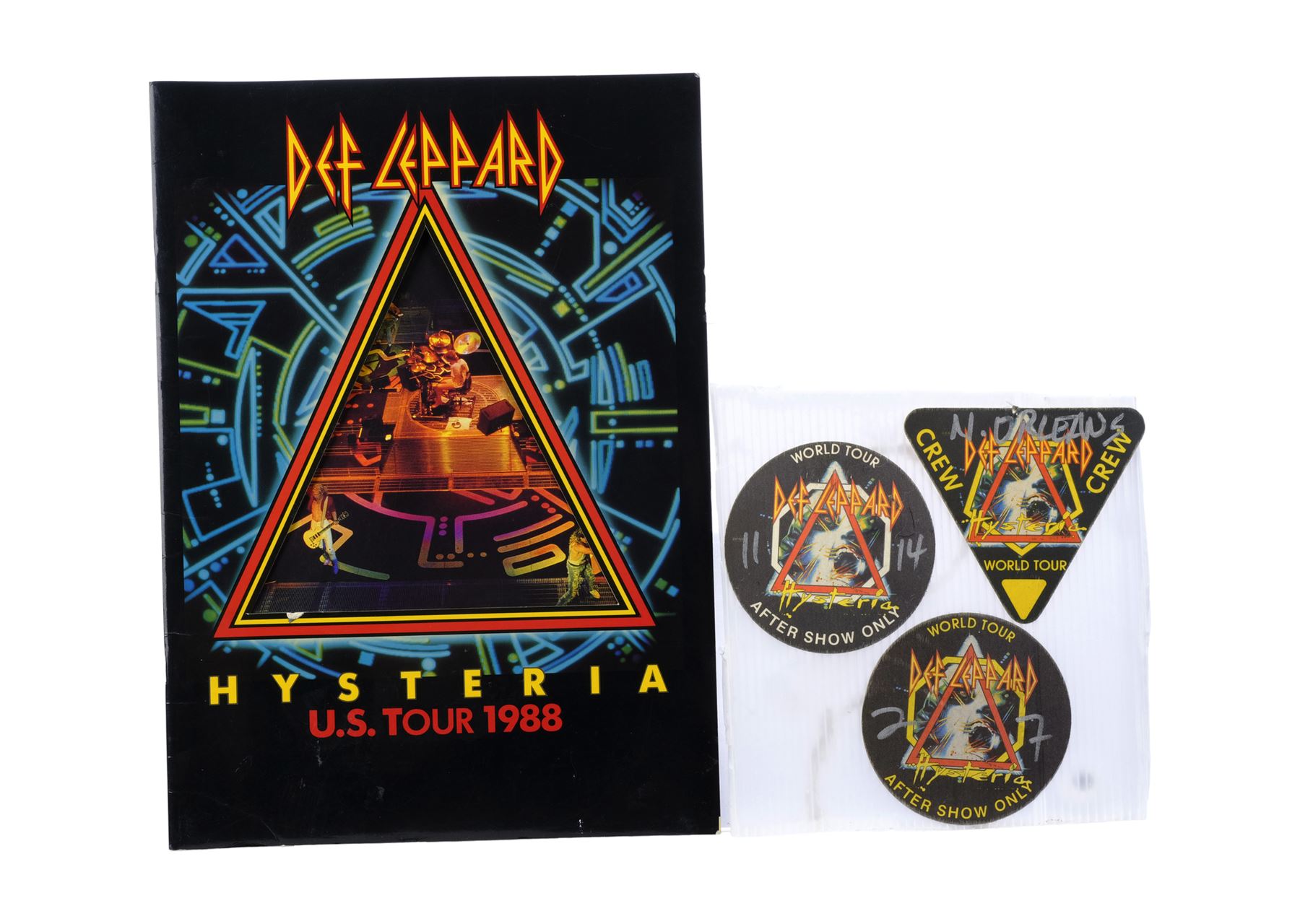 This lot consists of a 1987 Hysteria vinyl record, a 1988 Hysteria tour book, three 1988 VIP backstage passes, and two ticket stubs. The album is autographed by Joe Elliot, Phil Collen, Steve Clark, Rick Savage, and Rick Allen. The book features the autographs of Phil Collen, Steve Clark, Rick Allen, as well as Joe Elliott and Rick Savage autographed twice. Included is a letter of authenticity.This lot exhibits edge wear and fading and minor tears. Dimensions: 51 cm x 37 cm x 12.75 cm (20" x 14.5" x 5")