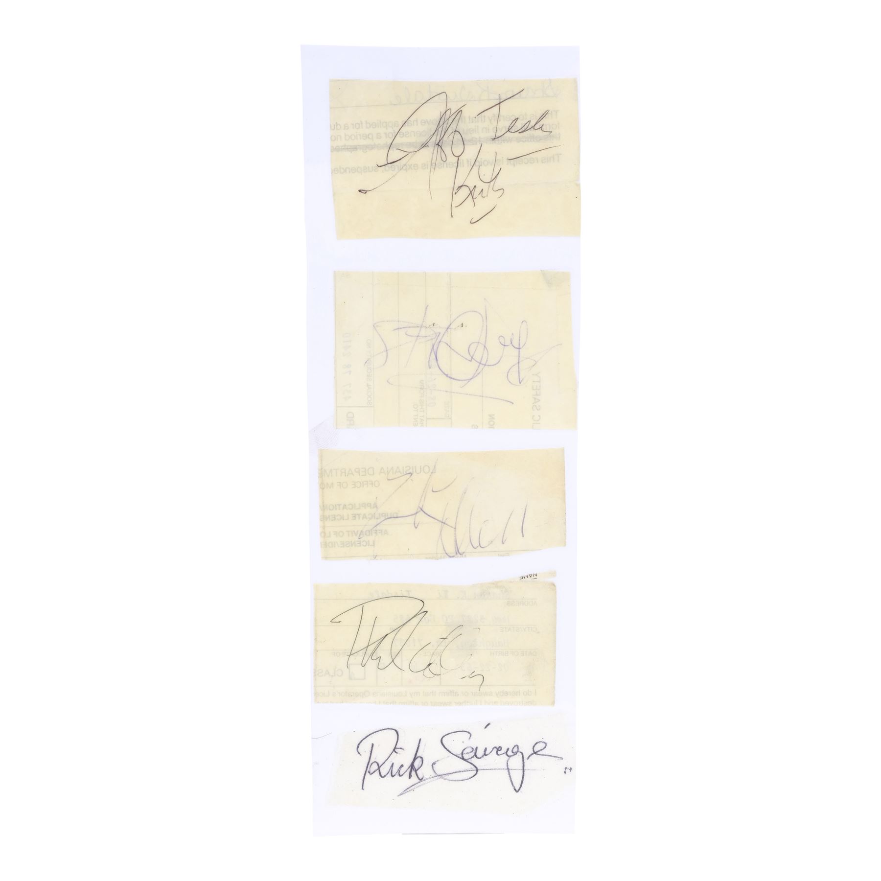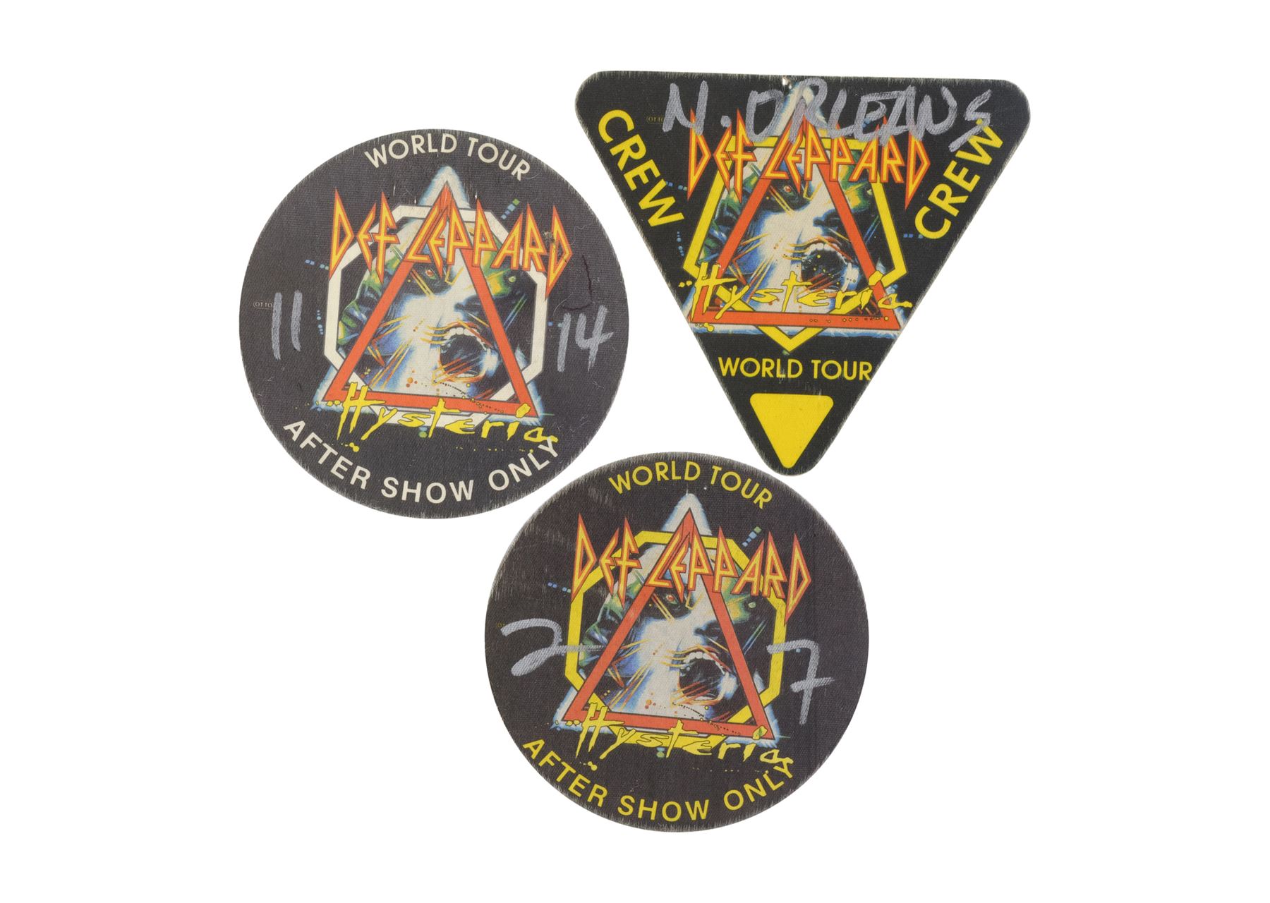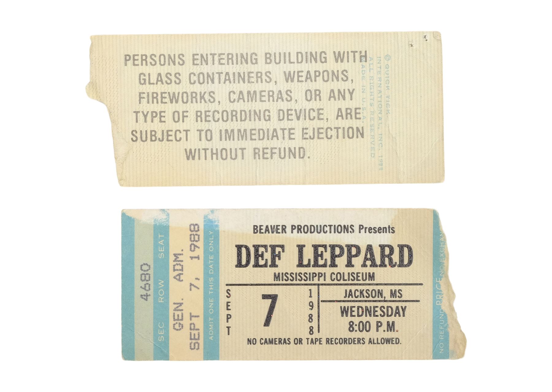 This lot consists of a 1987 Hysteria vinyl record, a 1988 Hysteria tour book, three 1988 VIP backstage passes, and two ticket stubs. The album is autographed by Joe Elliot, Phil Collen, Steve Clark, Rick Savage, and Rick Allen. The book features the autographs of Phil Collen, Steve Clark, Rick Allen, as well as Joe Elliott and Rick Savage autographed twice. Included is a letter of authenticity.This lot exhibits edge wear and fading and minor tears. Dimensions: 51 cm x 37 cm x 12.75 cm (20" x 14.5" x 5")