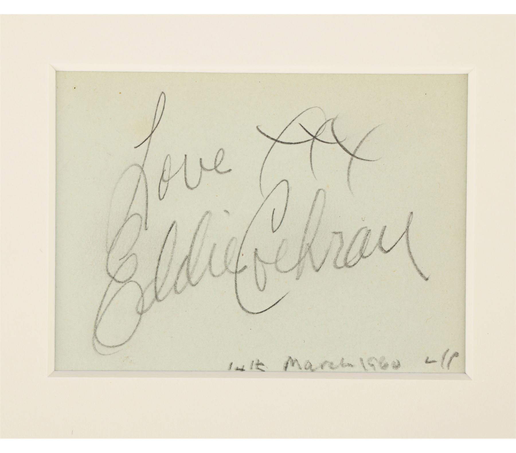 The autograph reads "Love Eddie Cochran" and is dated "4th March 1960". It is handwritten on a small piece of white paper, displayed within a white cardboard frame. A printed colour picture of Cochran with his guitar is situated above. The Variety concert programme features several artists that performed for the week, headlined by American rockstar Gene Vincent and notes it was Cochran's first live performance in England. The programme exhibits creasing and marks. Dimensions (autograph display): 35.25 cm x 23.5 cm (13 3/4" x 9 1/4")