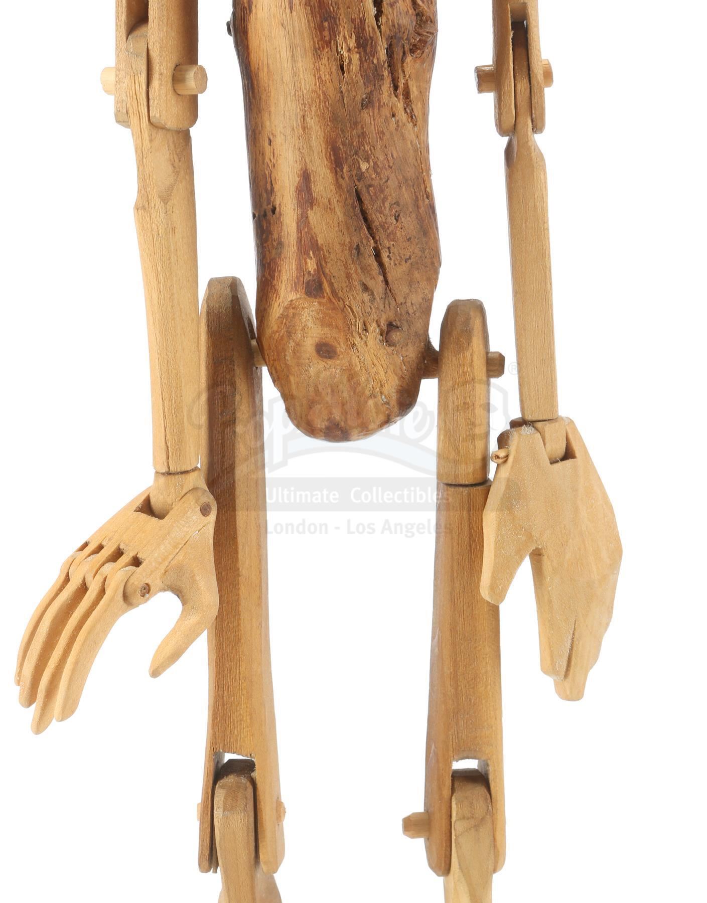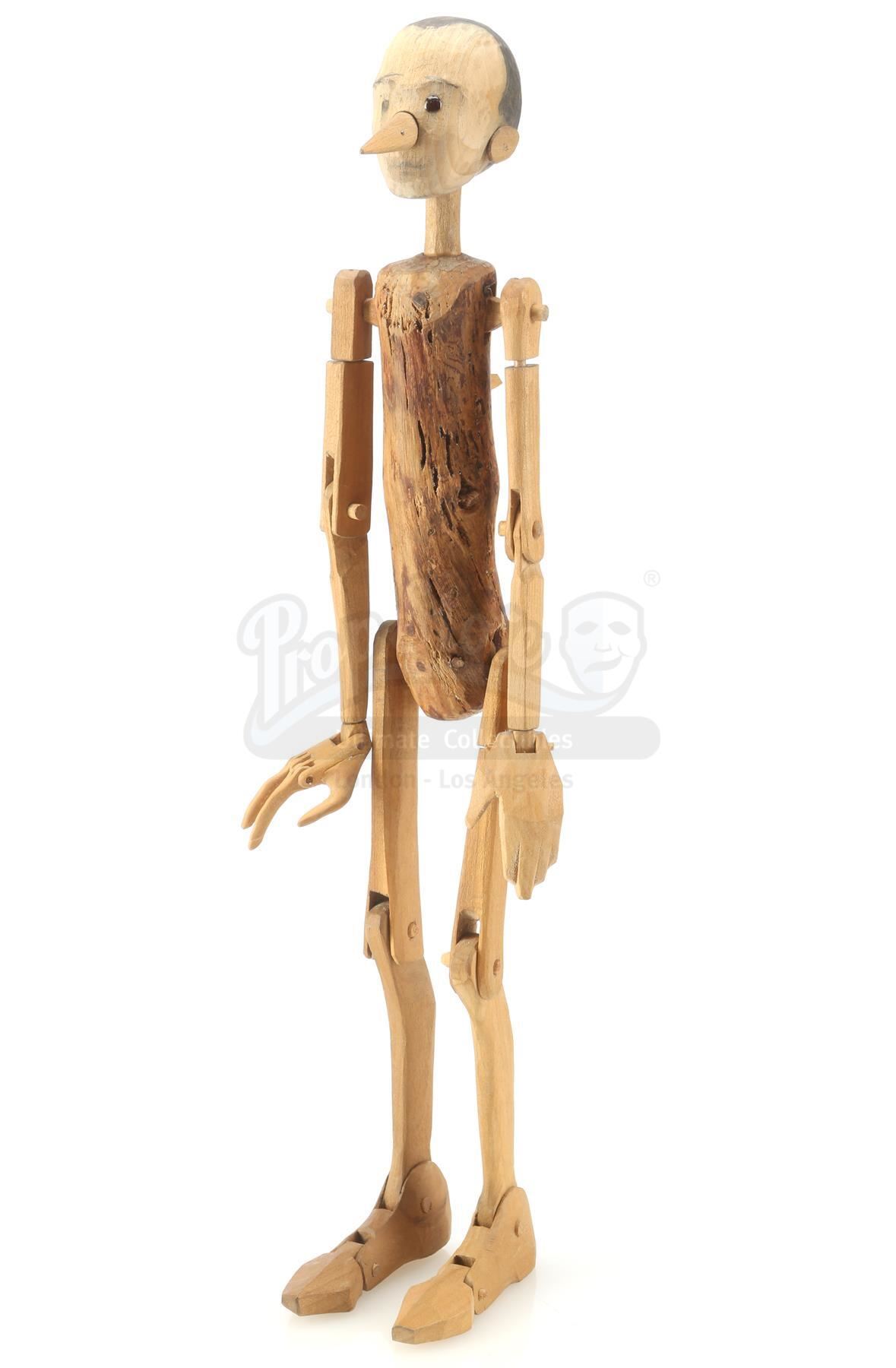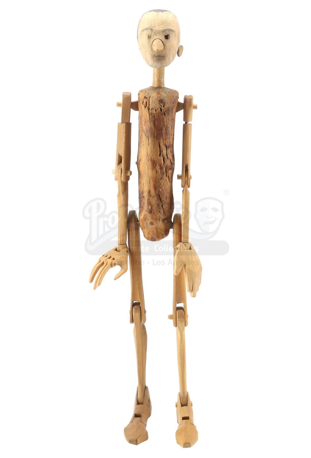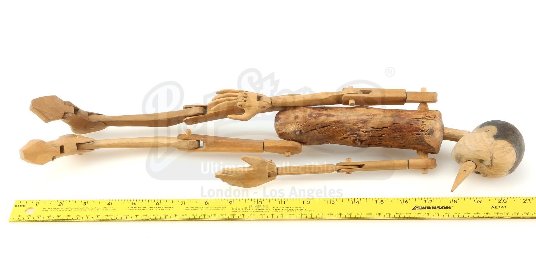 Made almost entirely of unpainted wood, this puppet features wooden-peg joints at the shoulders, elbows, wrists, fingers, hips, knees, ankles, and midfoot. The torso is a small log, roughly finished, with knots throughout. The head and neck are held by a piece of elastic that runs out the back of the torso to a small wooden winding mechanism that can tighten so that the head stands up or, when let go, lets the head droop over. The hair is painted on, lightly, in black, while the mouth and eyebrows are drawn on in pencil. The eye is made of a semi-transparent brown acrylic. The long, pointed nose is a separate piece of wood plugged into the face. The puppet is in good overall condition with some wear from handling and age, including a missing eye and ear, and a general looseness in the wooden joints. Includes a letter of authenticity from Phil Tippett.
