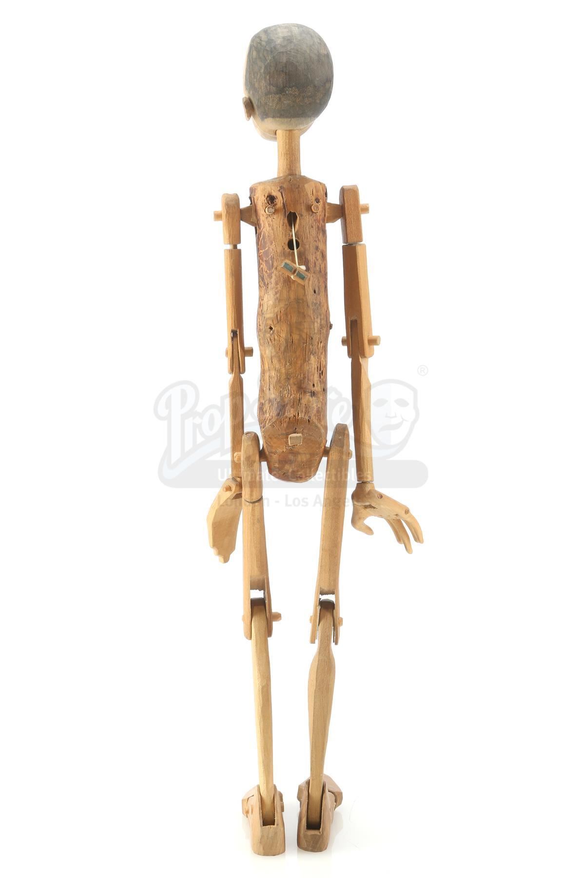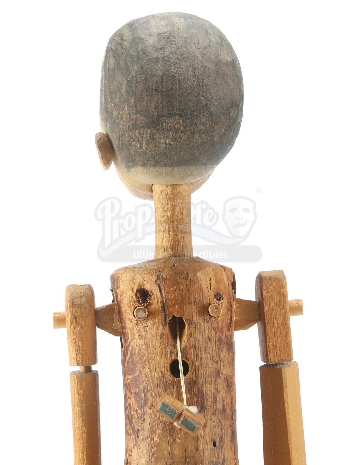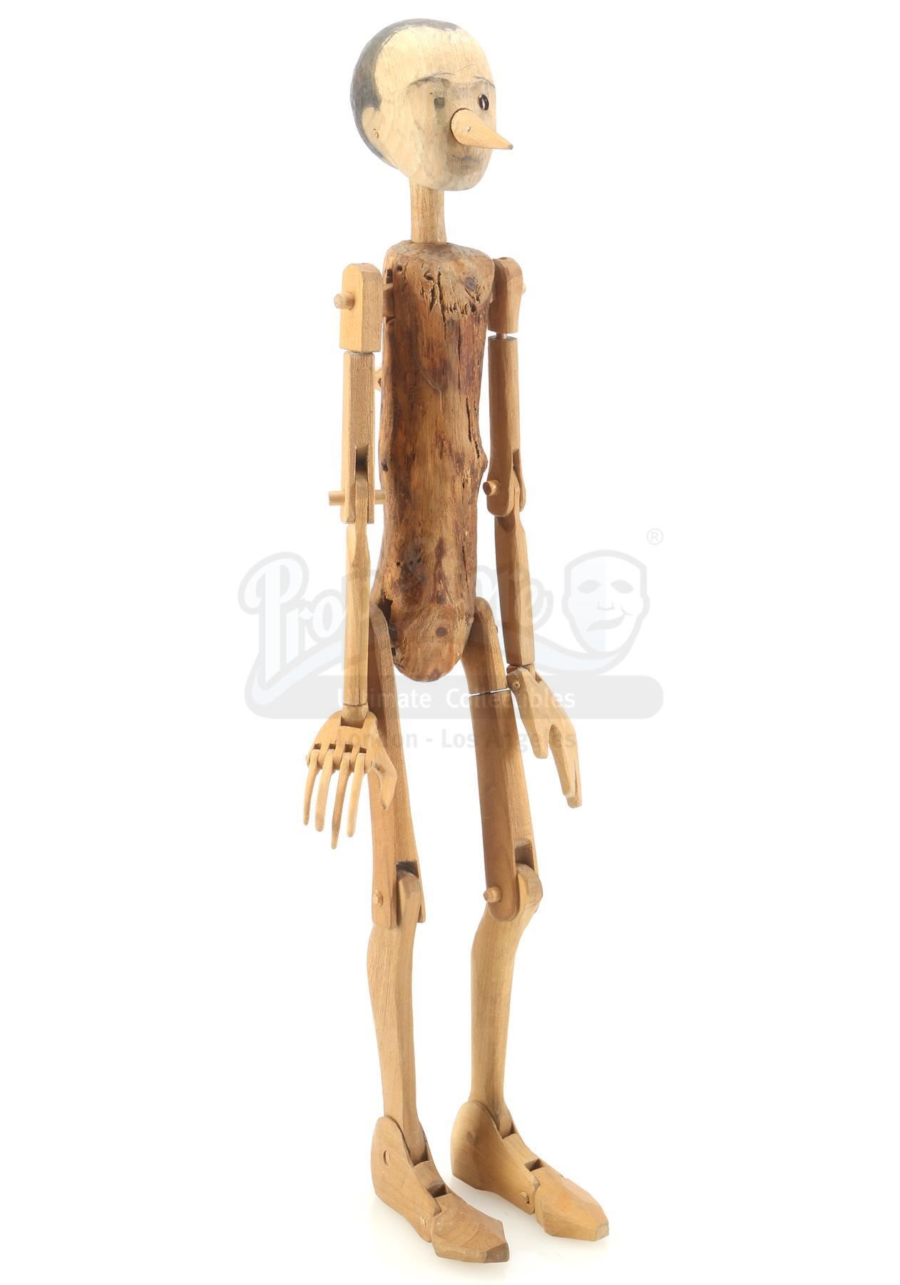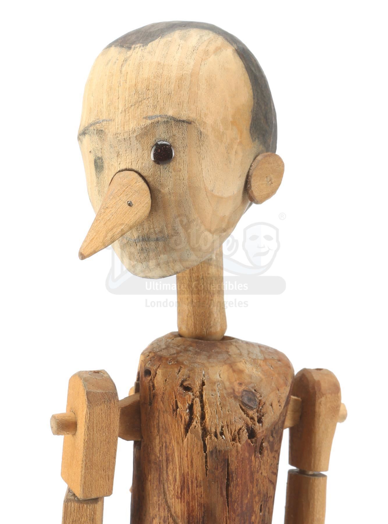 Made almost entirely of unpainted wood, this puppet features wooden-peg joints at the shoulders, elbows, wrists, fingers, hips, knees, ankles, and midfoot. The torso is a small log, roughly finished, with knots throughout. The head and neck are held by a piece of elastic that runs out the back of the torso to a small wooden winding mechanism that can tighten so that the head stands up or, when let go, lets the head droop over. The hair is painted on, lightly, in black, while the mouth and eyebrows are drawn on in pencil. The eye is made of a semi-transparent brown acrylic. The long, pointed nose is a separate piece of wood plugged into the face. The puppet is in good overall condition with some wear from handling and age, including a missing eye and ear, and a general looseness in the wooden joints. Includes a letter of authenticity from Phil Tippett.
