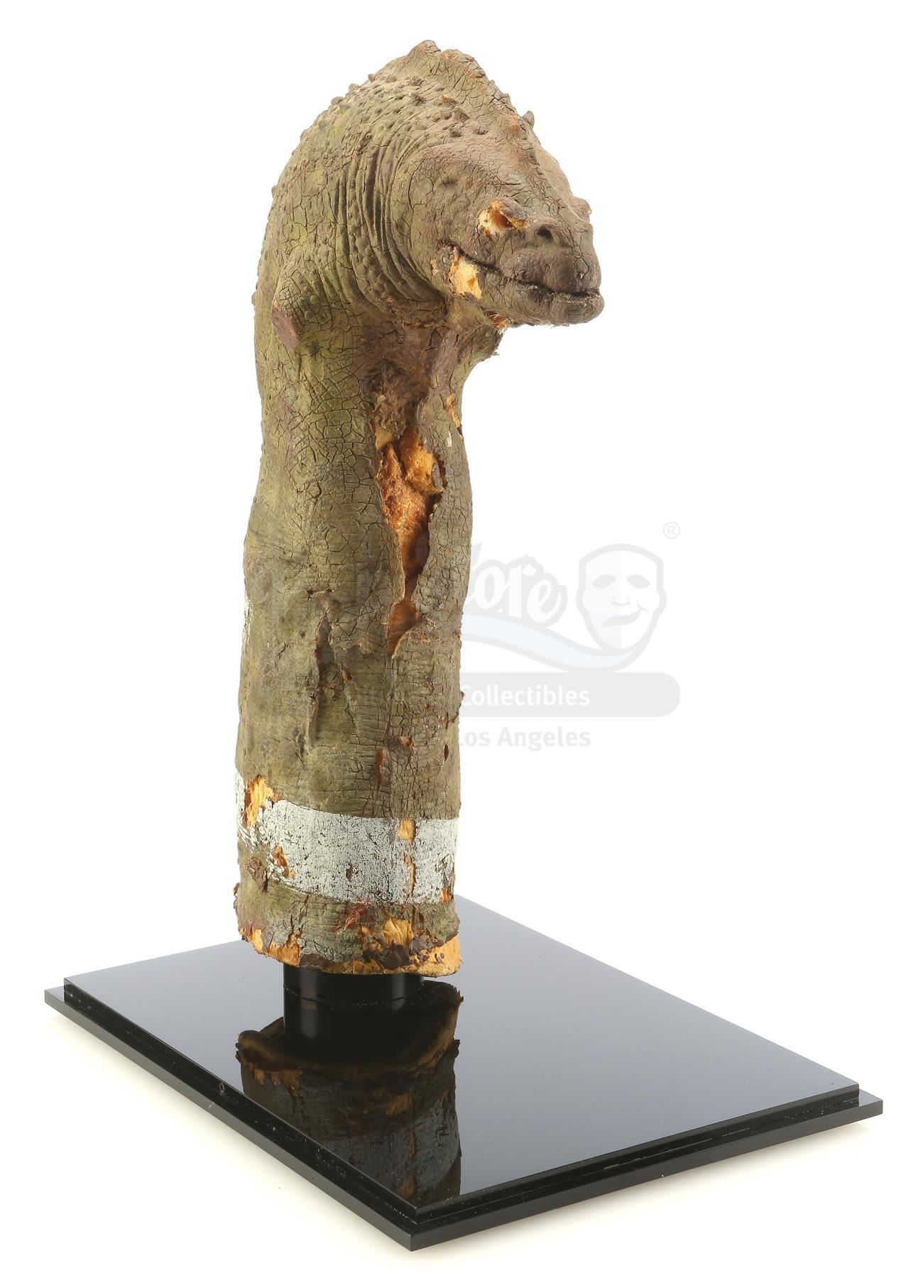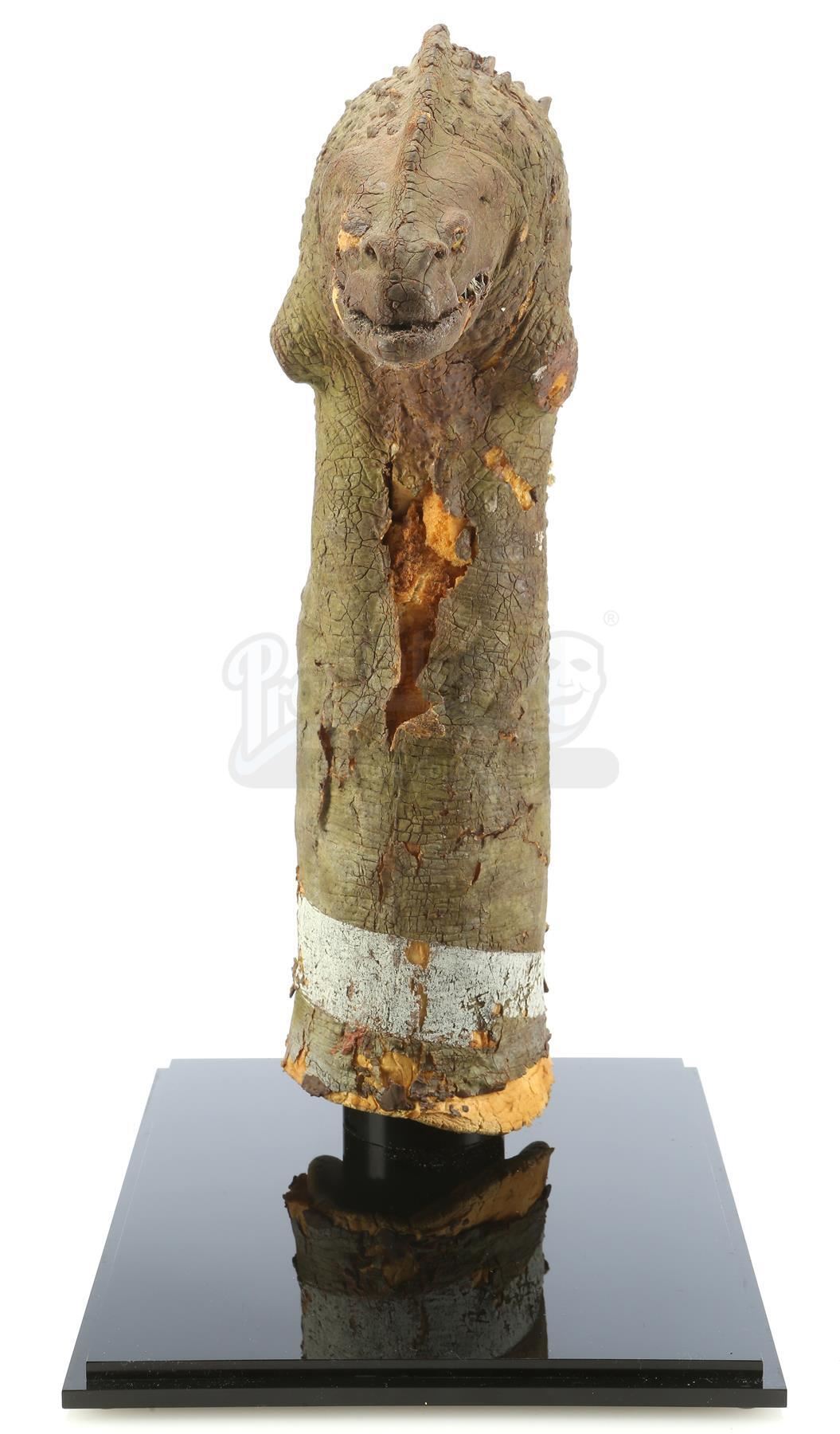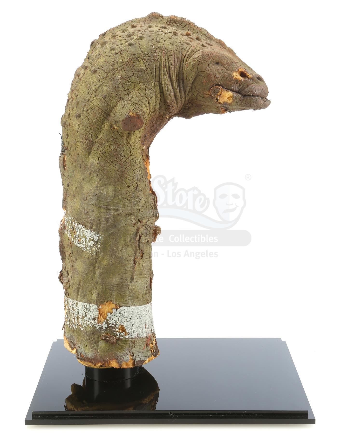 This display is comprises of a highly detailed puppet constructed from foam that's molded around a static armature. It is hand-painted green and brown with wrinkled flesh and a yellow resin eye, and mounted in an acrylic display case. The display is in poor overall condition with the puppet thoroughly cracked and splitting from age. Includes a letter of authenticity from Phil Tippett.