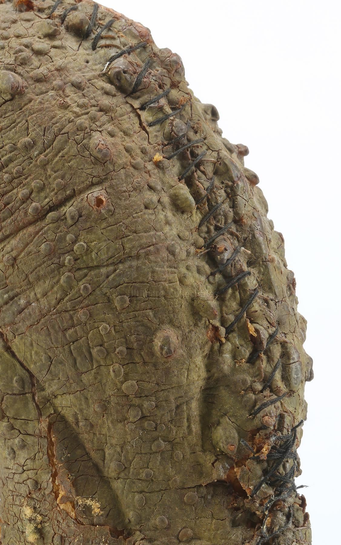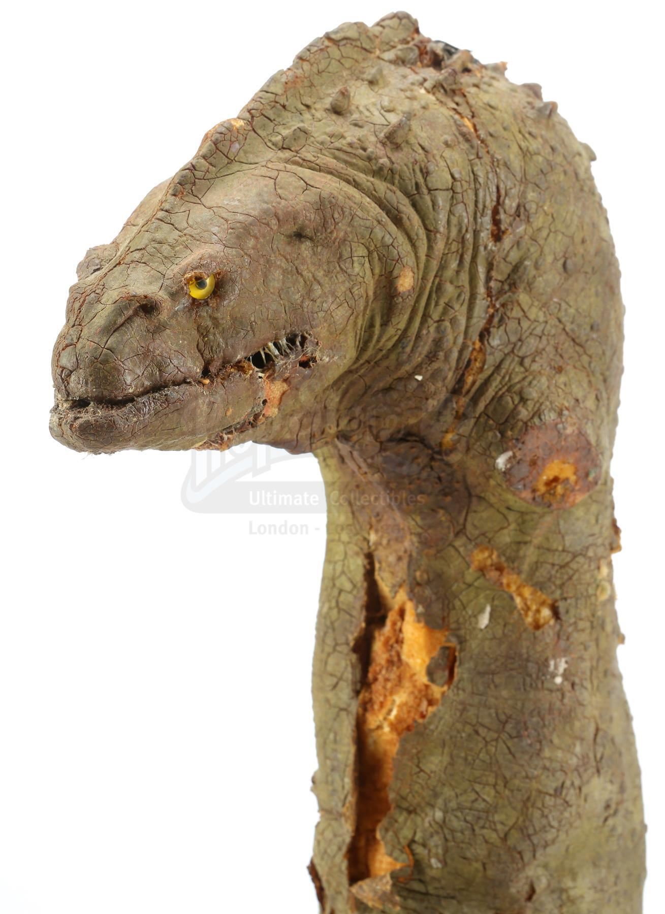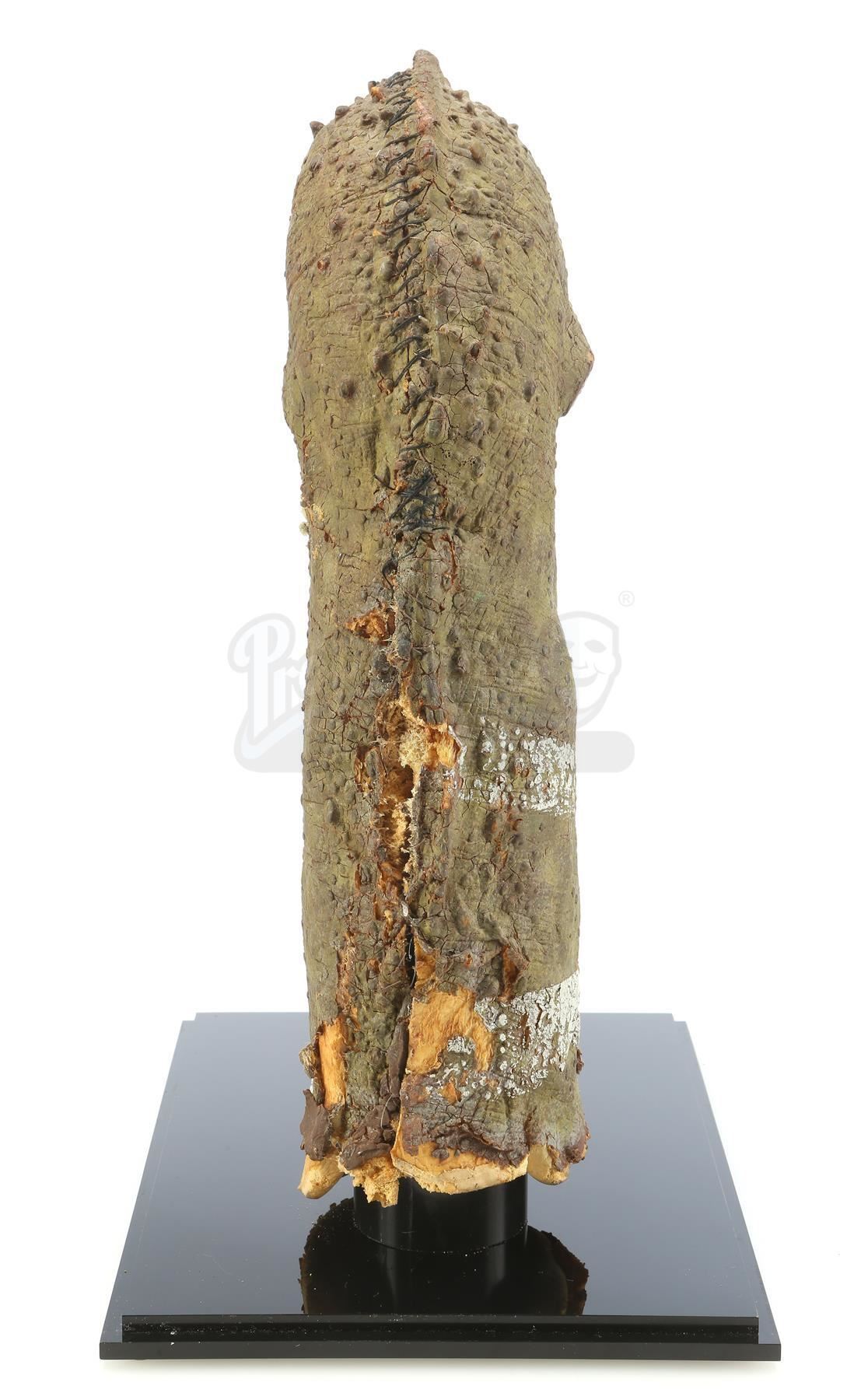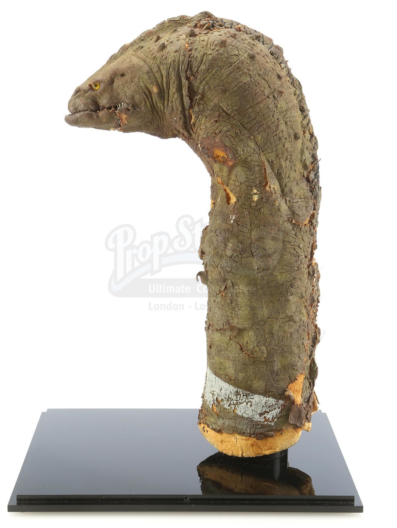 This display is comprises of a highly detailed puppet constructed from foam that's molded around a static armature. It is hand-painted green and brown with wrinkled flesh and a yellow resin eye, and mounted in an acrylic display case. The display is in poor overall condition with the puppet thoroughly cracked and splitting from age. Includes a letter of authenticity from Phil Tippett.