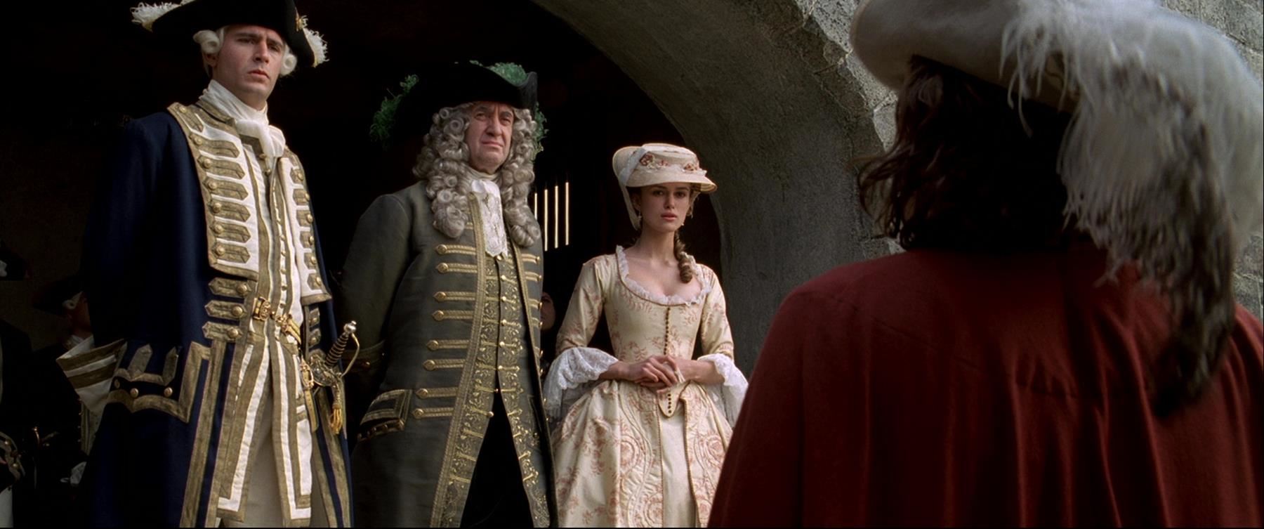 Elizabeth Swann's (Kiera Knightley) dress from Gore Verbinski's action-adventure film Pirates of the Caribbean: The Curse of The Black Pearl. Elizabeth wore her dress when she attended Captain Jack Sparrow's hanging and subsequent rescue.